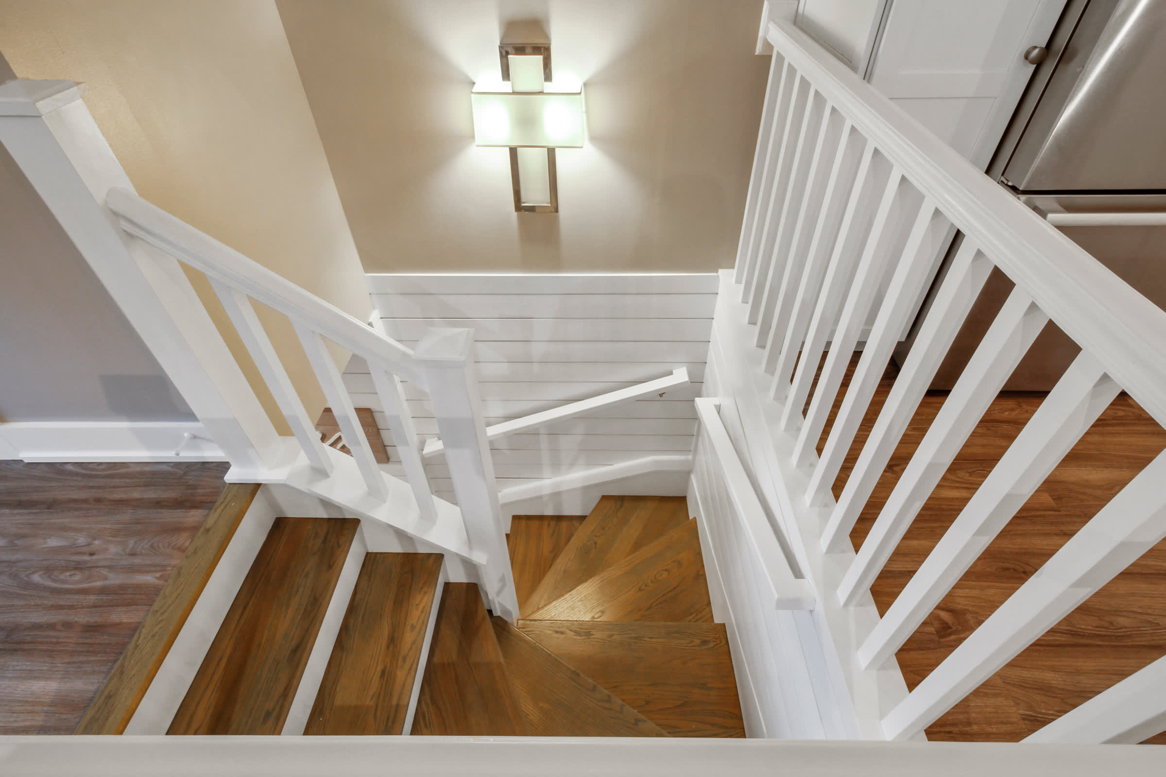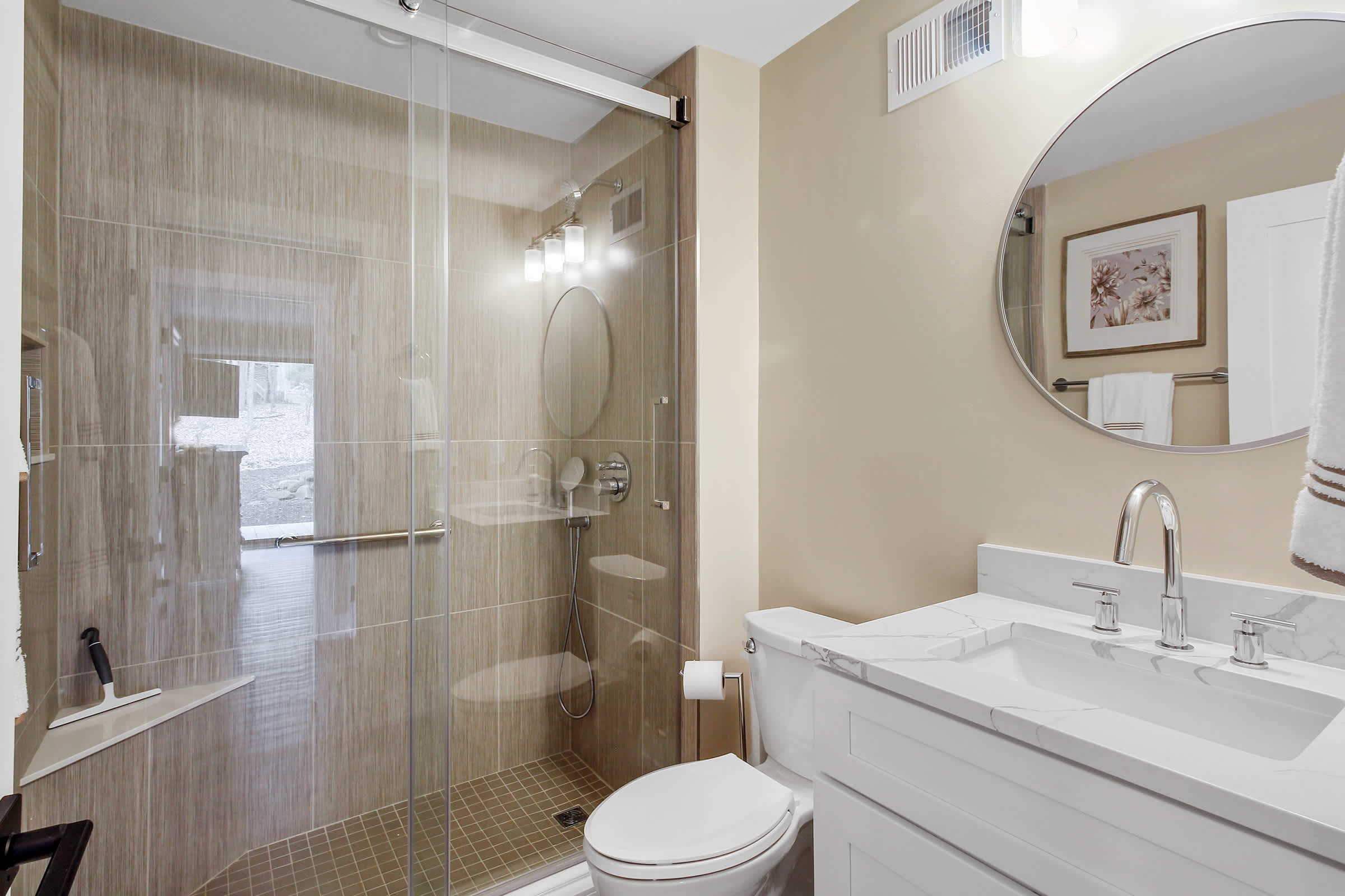 The home also includes a half bathroom as well as a full guest bathroom with a single vanity and glass walk-in shower.