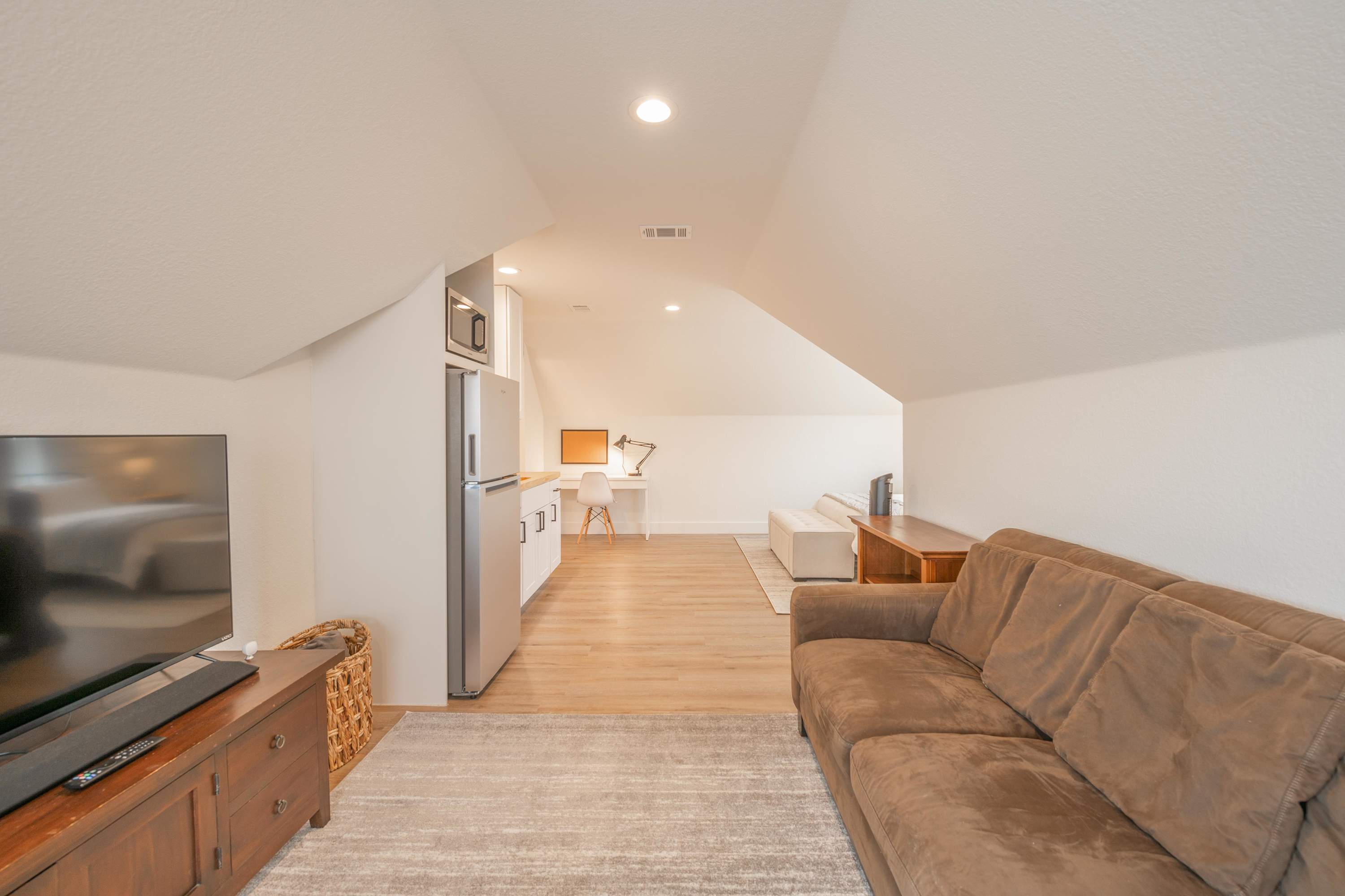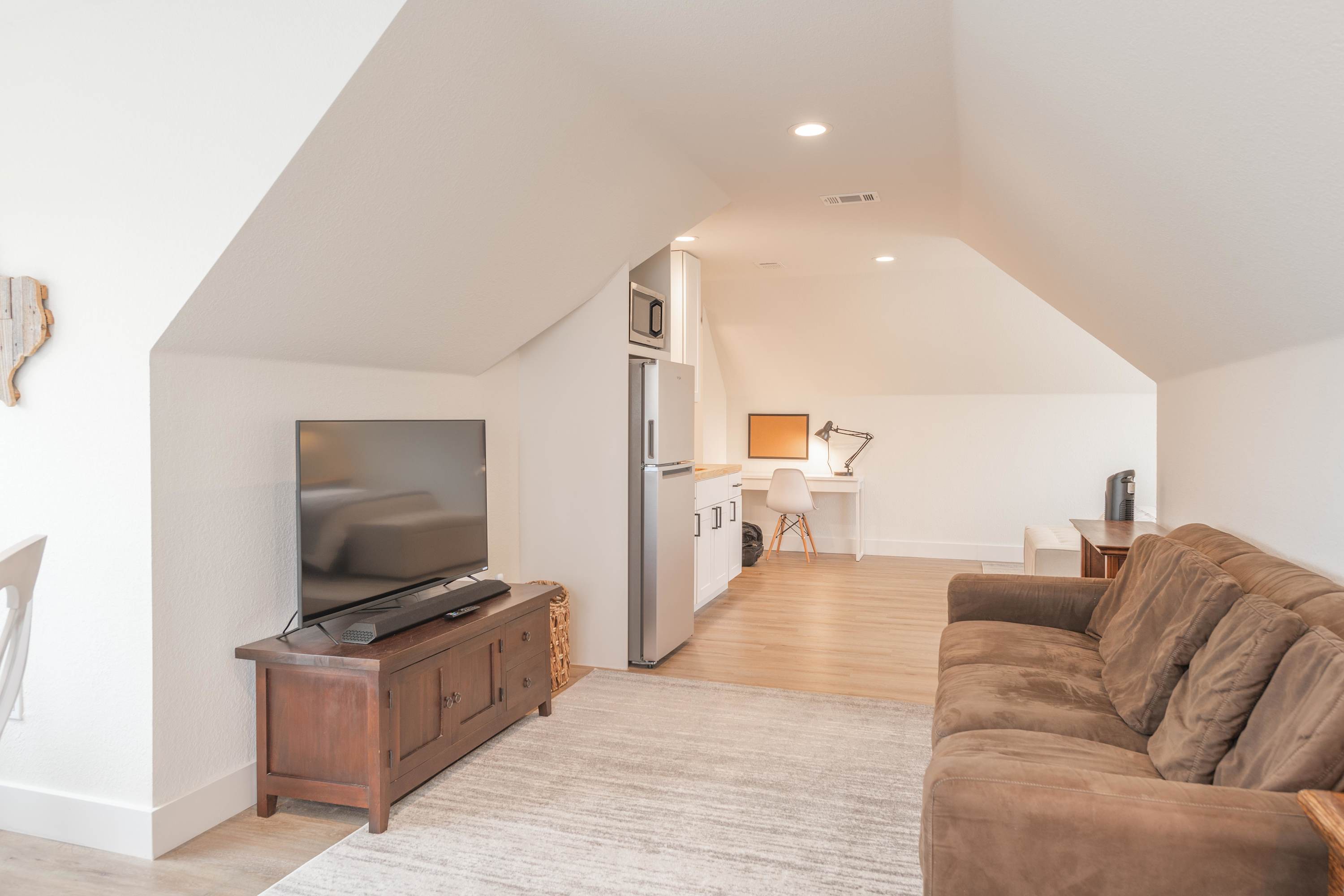 Upon entry, you will be greeted with an open floor plan studio. The living room features a sofa and Smart TV. Around the corner is the kitchenette stocked with a coffee maker, appliances and a dining room table set for 4. Enjoy the natural lighting throughout.