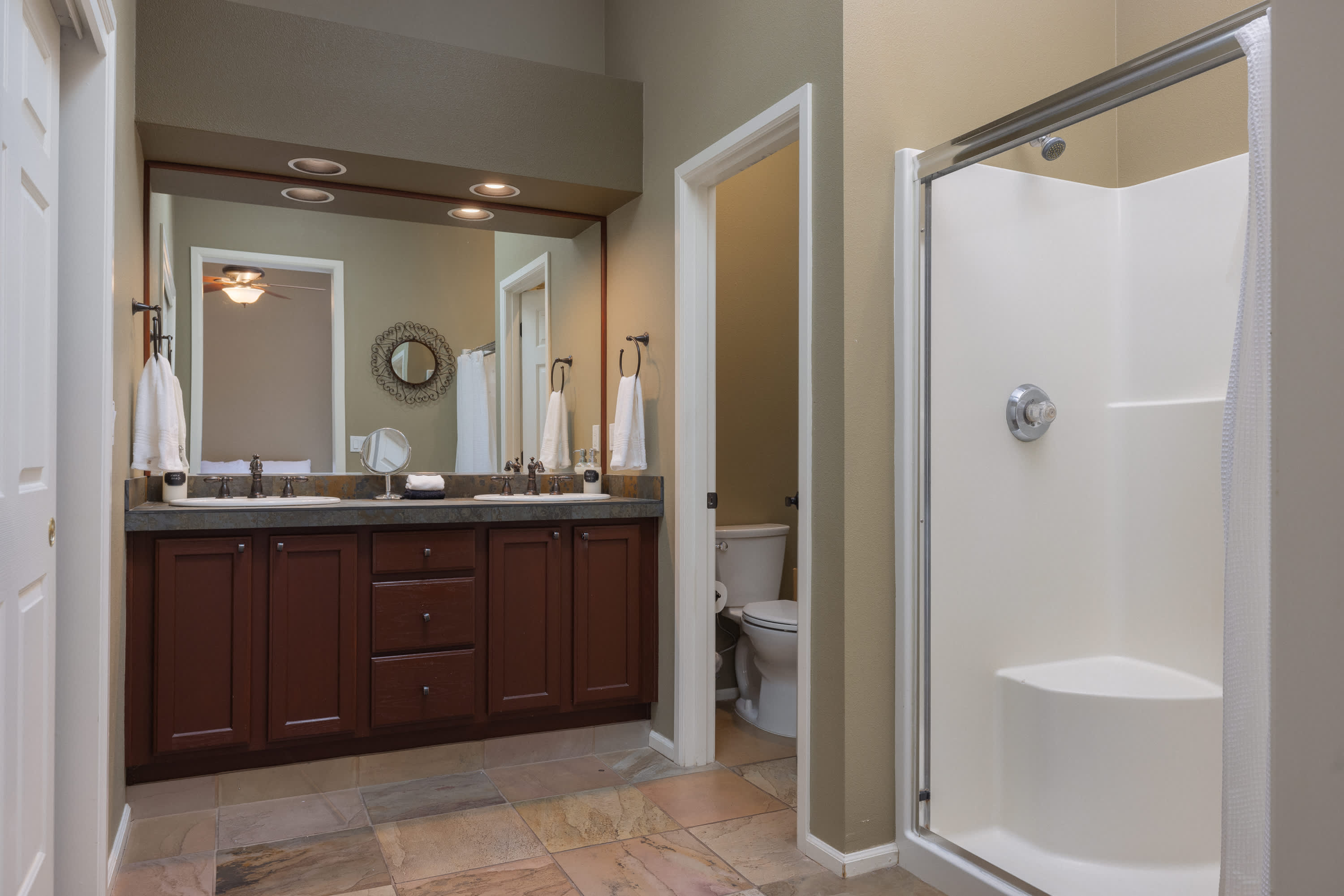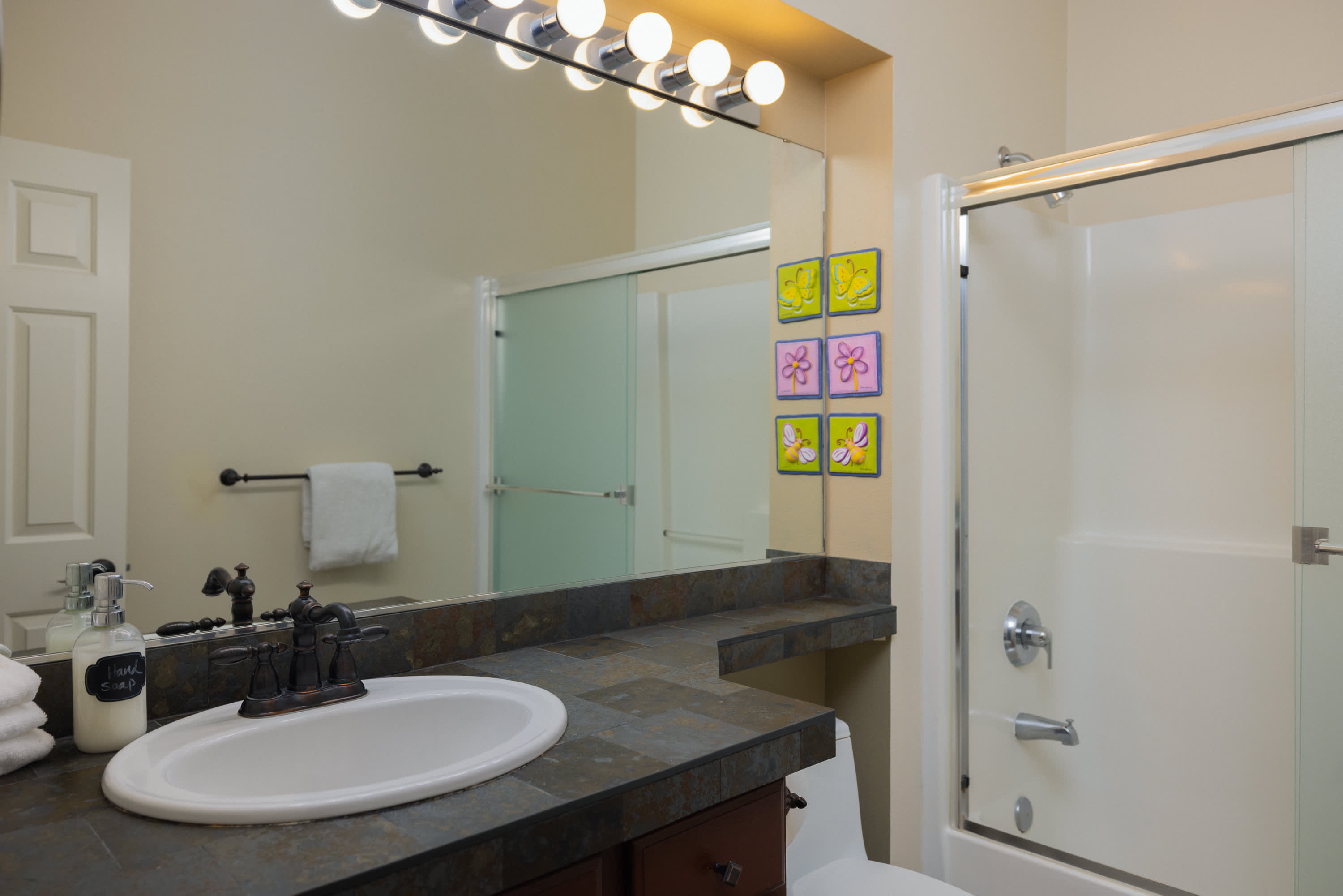 The home also includes an additional full guest bathroom with a single vanity and shower/tub combo.