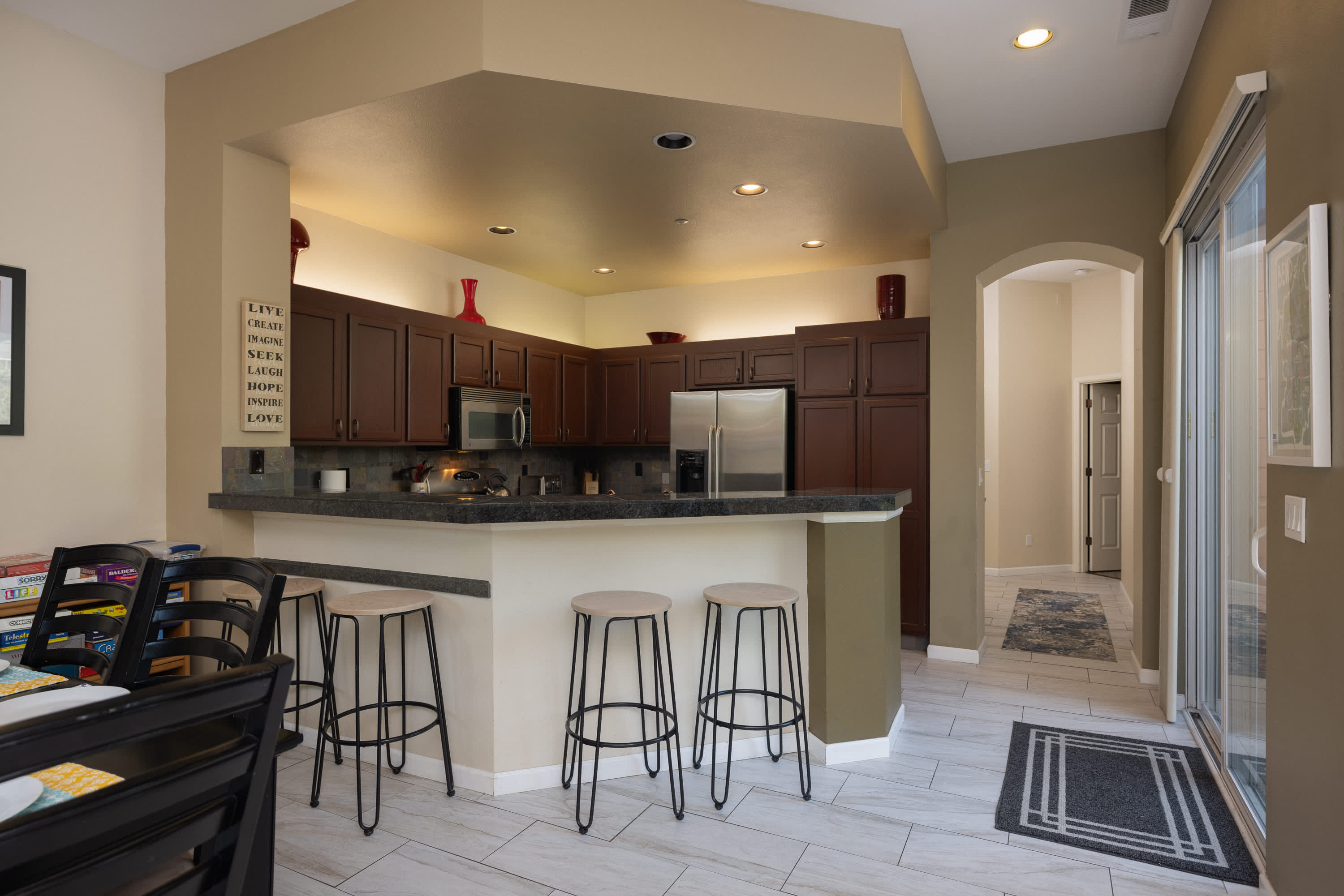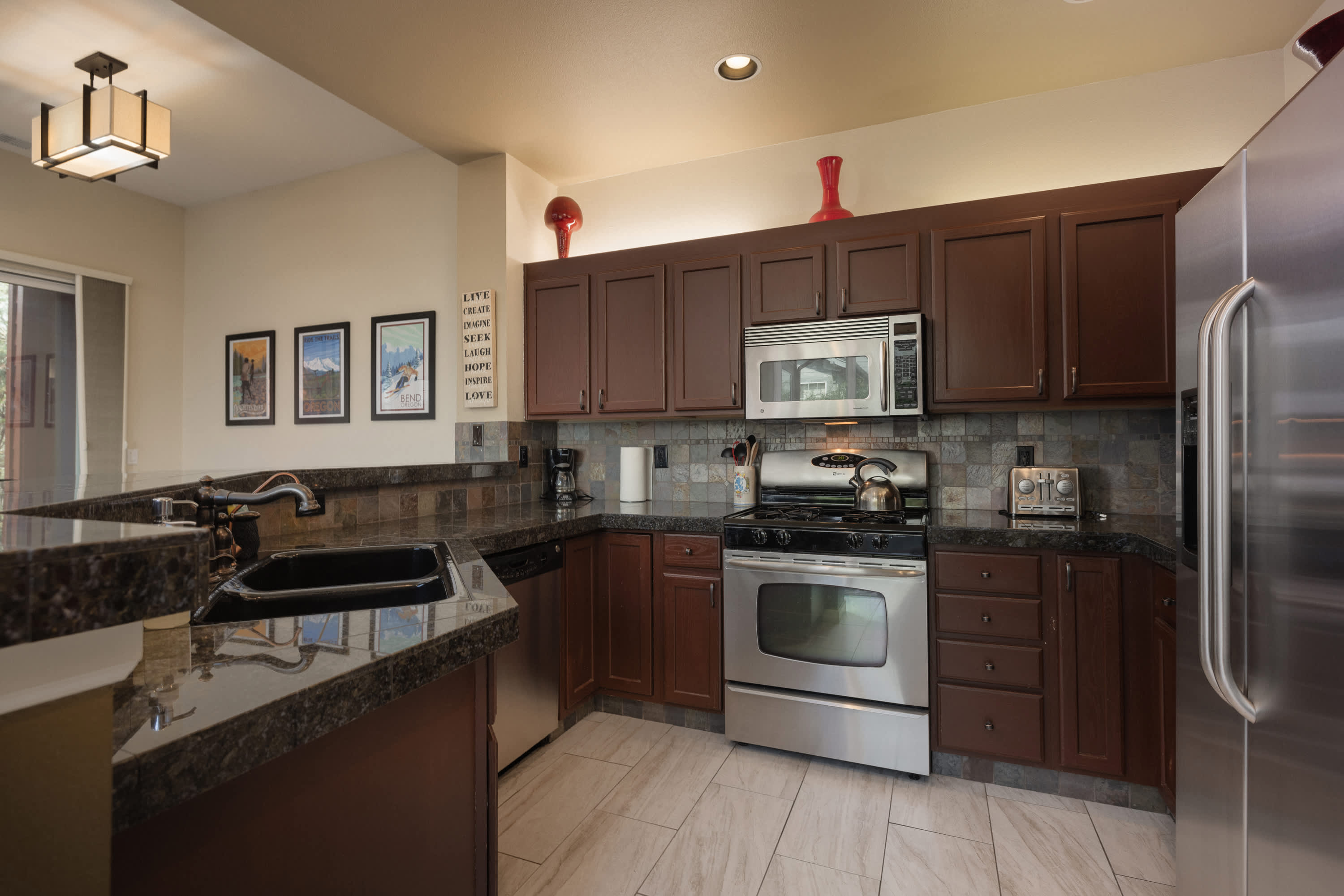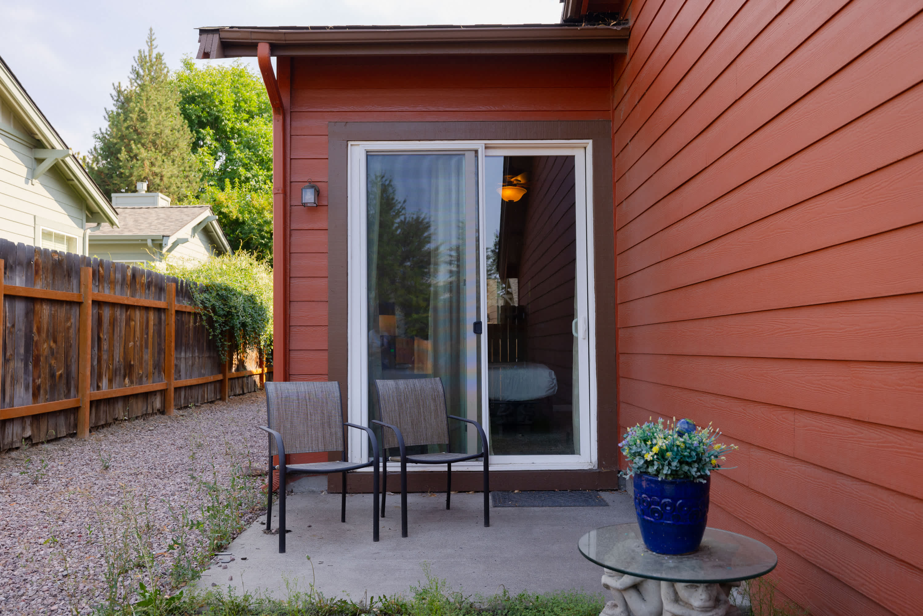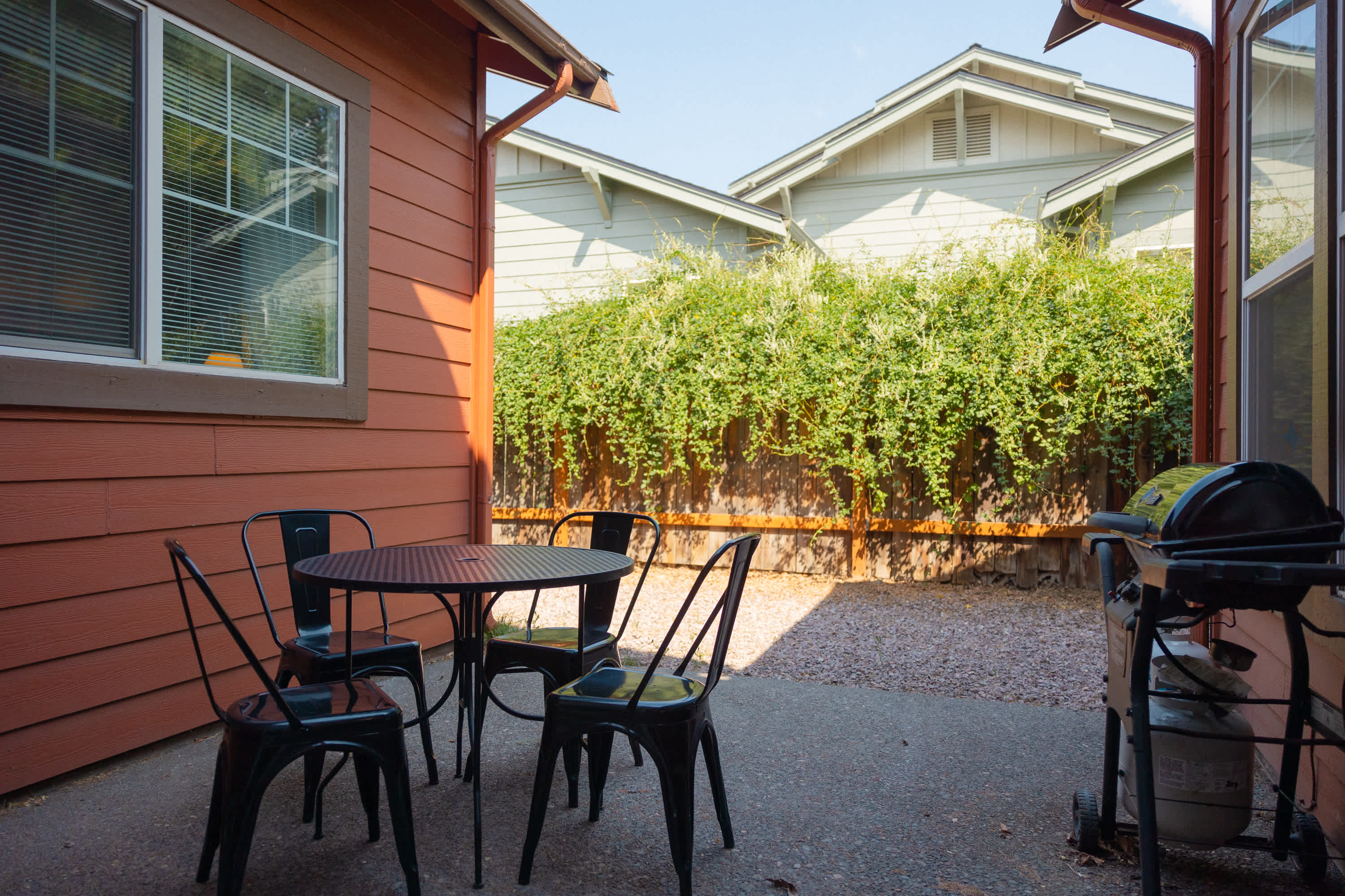 Outdoors, you’ll find three private patios: a covered patio with a tile-top café table and chairs off the dining area, a grill area accessible from the kitchen, and a large, open, fenced courtyard with a table and chairs accessible from the master bedroom. A propane grill is available for those who enjoy outdoor cooking, and curb parking makes it easy to come and go.