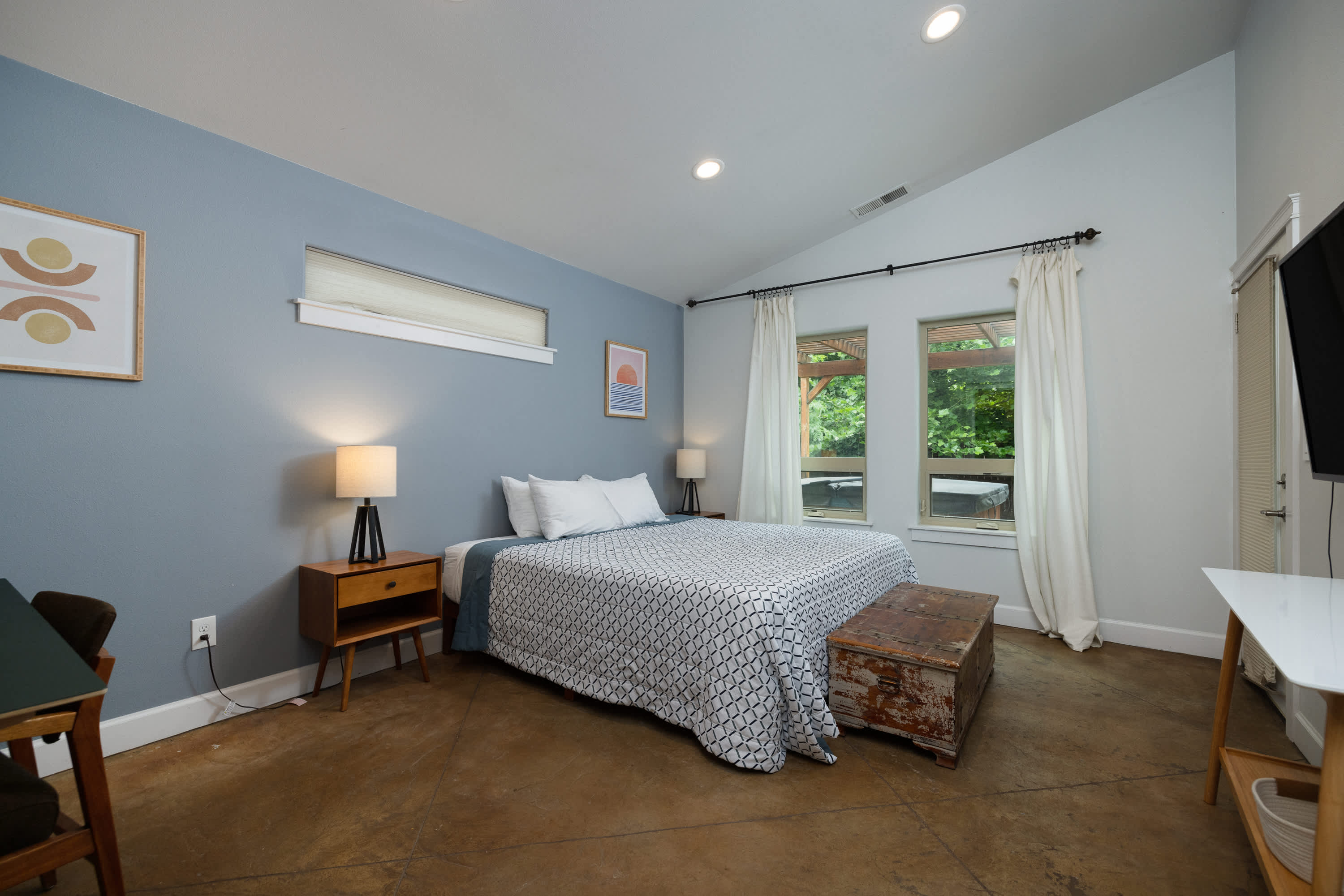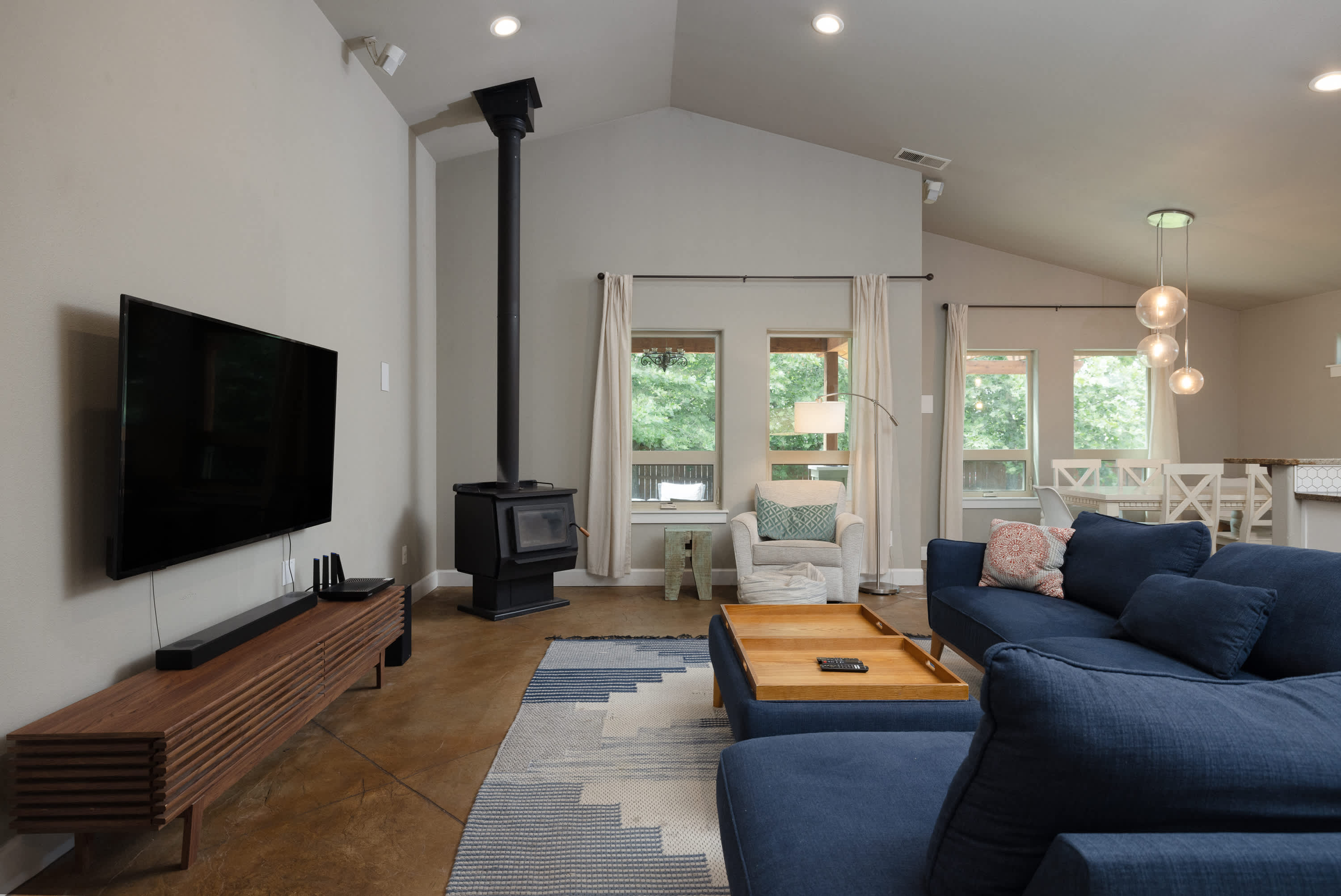 The bright and inviting interior showcases soaring vaulted ceilings where natural light beams in from the skylights to illuminate the open floorplan, the perfect spot to spend your downtime in the company of loved ones. The main living area boasts mid-century modern furnishings along with a smart TV for streaming all your favorite entertainment. The wood stove will keep you warm and toasty in the cooler months, creating an ideal ambiance for an immersive movie night. Prepare home-cooked meals in the well-equipped kitchen offering modern, stainless steel appliances, glossy stone countertops, and ample cabinetry stocked with cookware and dining ware. Dine together at the attached breakfast bar or the adjacent table, also serving as a cozy venue for rainy day board games.