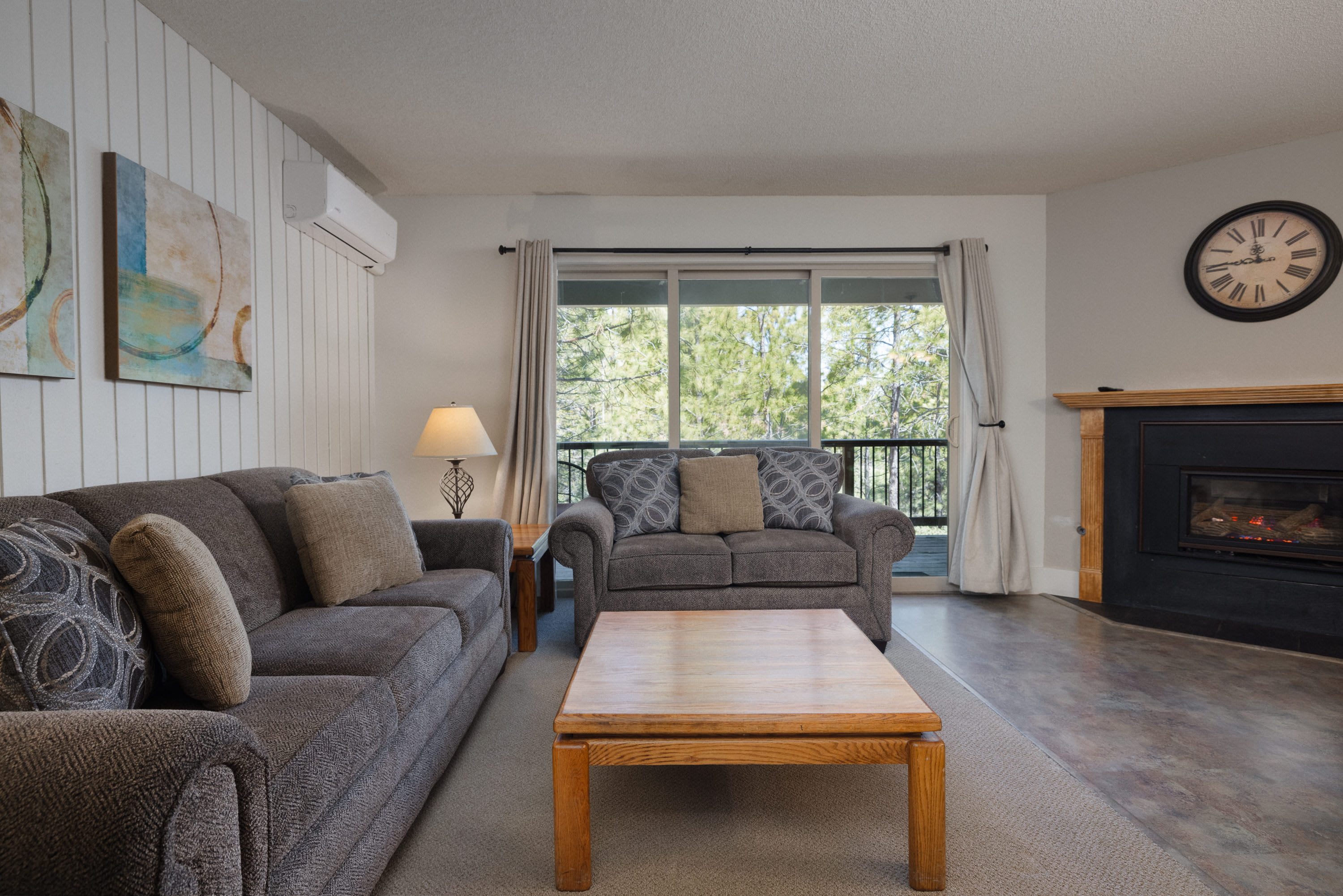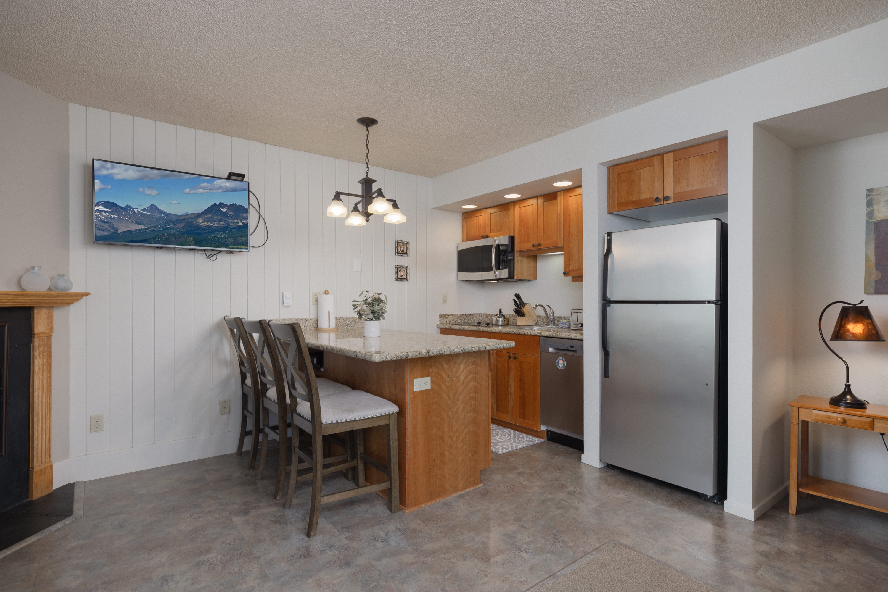 The home’s cozy interior offers just what you need to relax and unwind during your well-earned downtime, curated with comfortable furnishings and chic décor. Sink into plush sofa seating in the living room while you keep up with episodes of all your favorite shows on the mounted smart TV. The attached balcony creates the perfect scene for evening cocktails, soaking in the fresh air and pine-lined vistas. Back indoors, the efficient kitchen is well-equipped for all your mealtime needs whether unpacking takeout from a newly discovered local restaurant or preparing a delicious spread of afternoon appetizers. Grab a high-top stool at the counter for all your dining or to enjoy the quiet morning hours with your fresh cup of coffee.