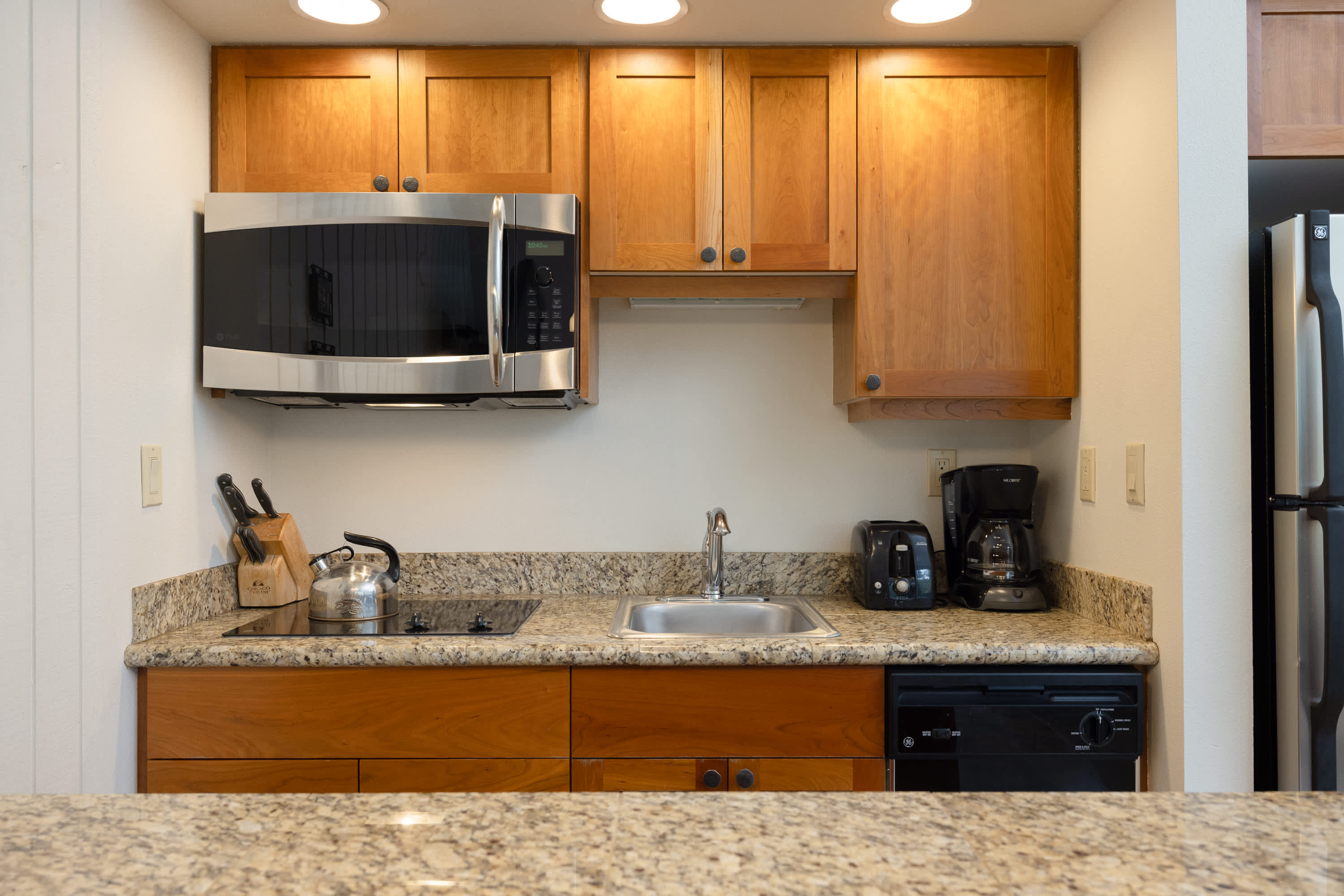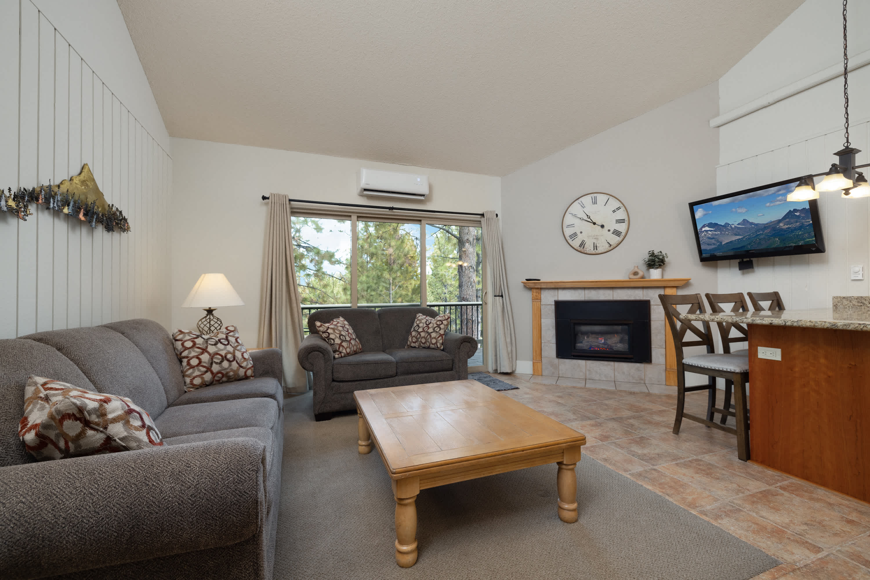 Inside the home, soaring ceilings sit atop open spaces designed to maximize your relaxation and connectivity with loved ones. Sink into the soft sofa seating in the living room while you surf the channels or queue up a movie on the mounted TV, the fireplace keeping you warm and toasty during the cooler months. Steps away, the well-equipped kitchen offers full-sized appliances, stone countertops, and rich wood cabinetry stocked with cookware and dining ware. Snag a high-top stool at the counter for 3 for snacking and dining alike, or head out onto the balcony to soak in the fresh mountain air and sweeping vistas while you dine al fresco at the table for 3.