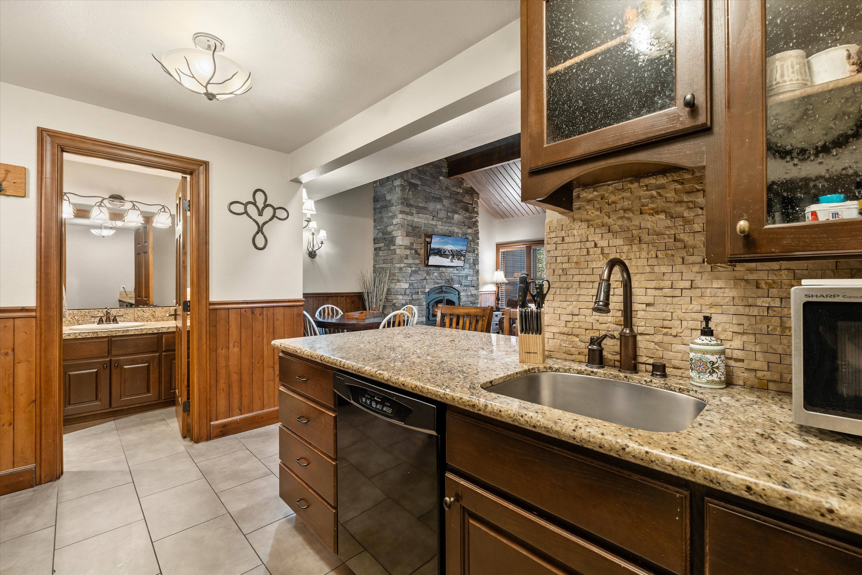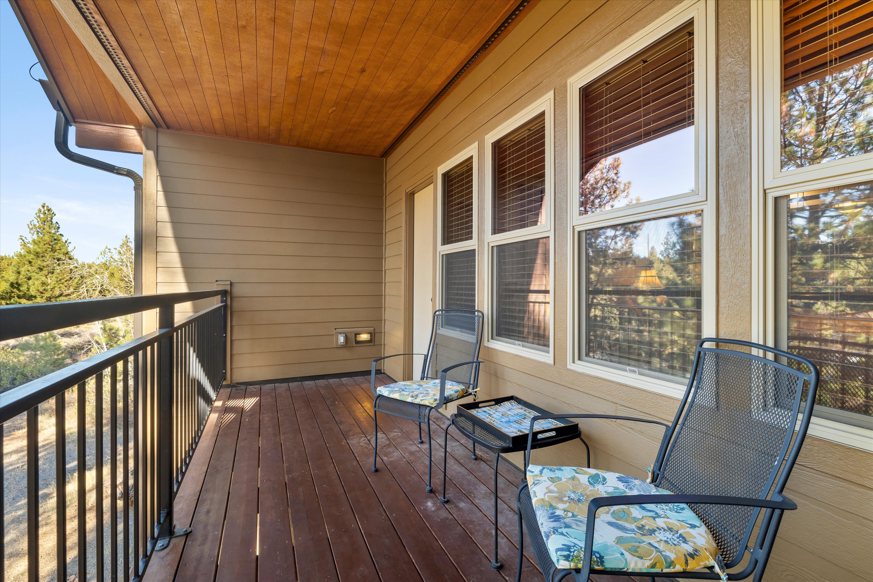 The home’s interior features many beautiful updates, keeping the theme of the rustic outdoors alive in the stylish décor and furnishings. The fully remodeled wood fireplace is the focal point of the living room, creating warmth for the space during the colder nights and months. Find your peace relaxing on the plush sofa or leather armchair while you stream your favorite movie on the mounted smart TV. The cozy, modern kitchen showcases all-black appliances and stone countertops, with sleek cabinetry fully stocked with cookware and dining ware for all of your culinary endeavors. A Keurig coffee maker is on hand to help perk you up in the morning, and you can enjoy your fresh cup seated at the counter on the high-top chairs for 2. The formal dining table can seat 4 whether enjoying meals together or hosting a friendly card game. When you’re ready to seek out more of that fresh Oregon air, head out onto the balcony for a moment of quiet, taking in the amazing views of the surrounding landscape.