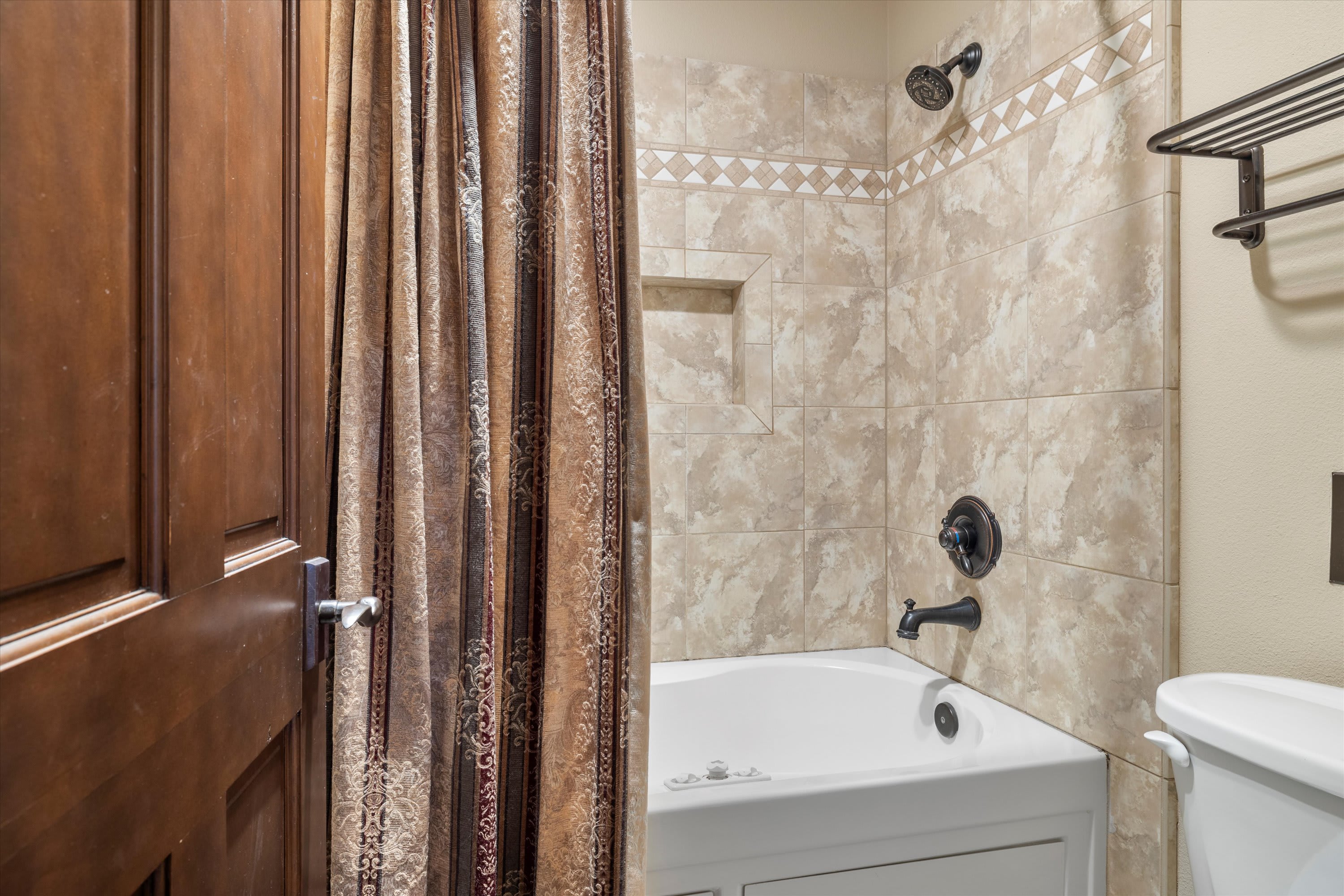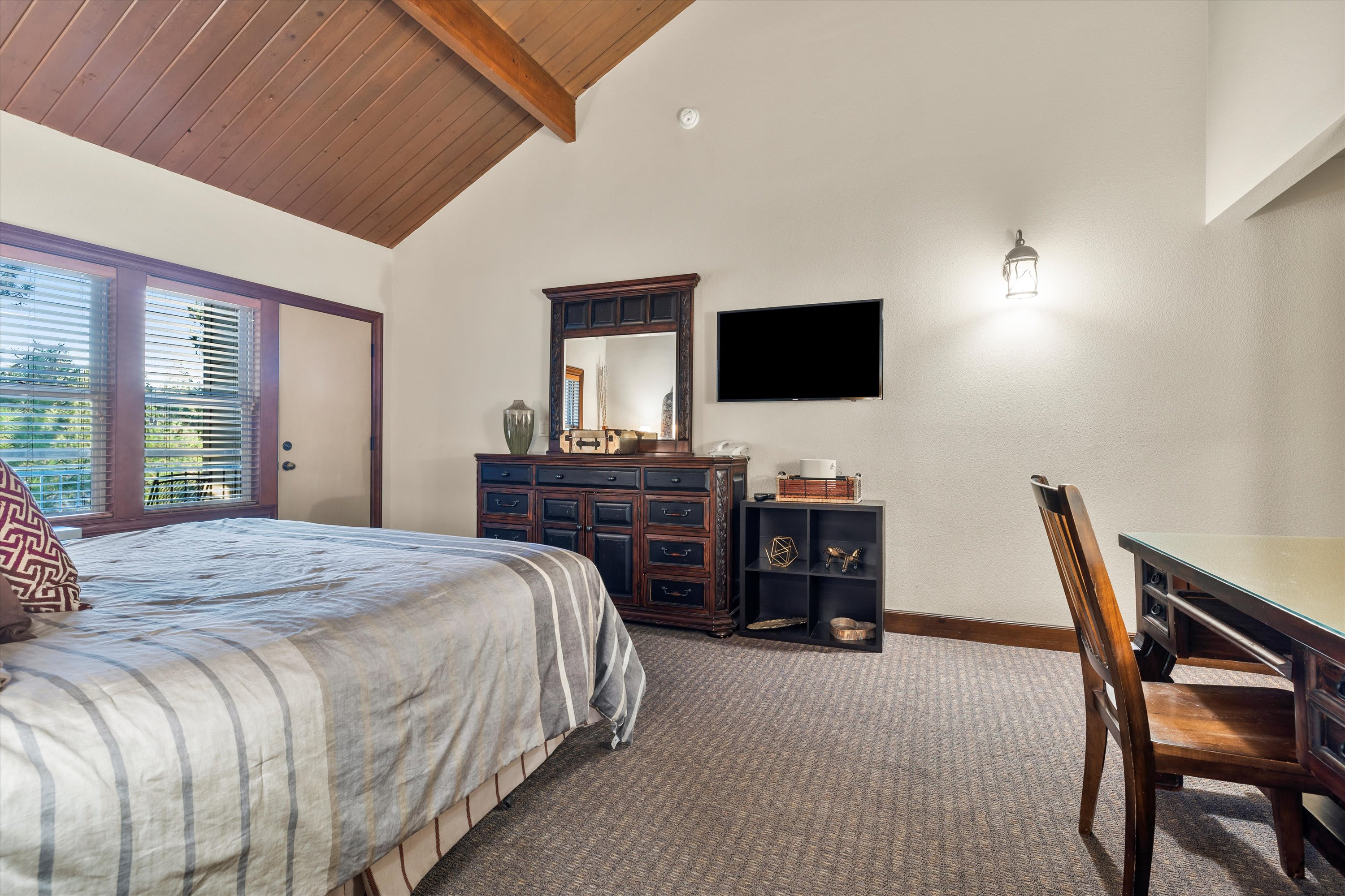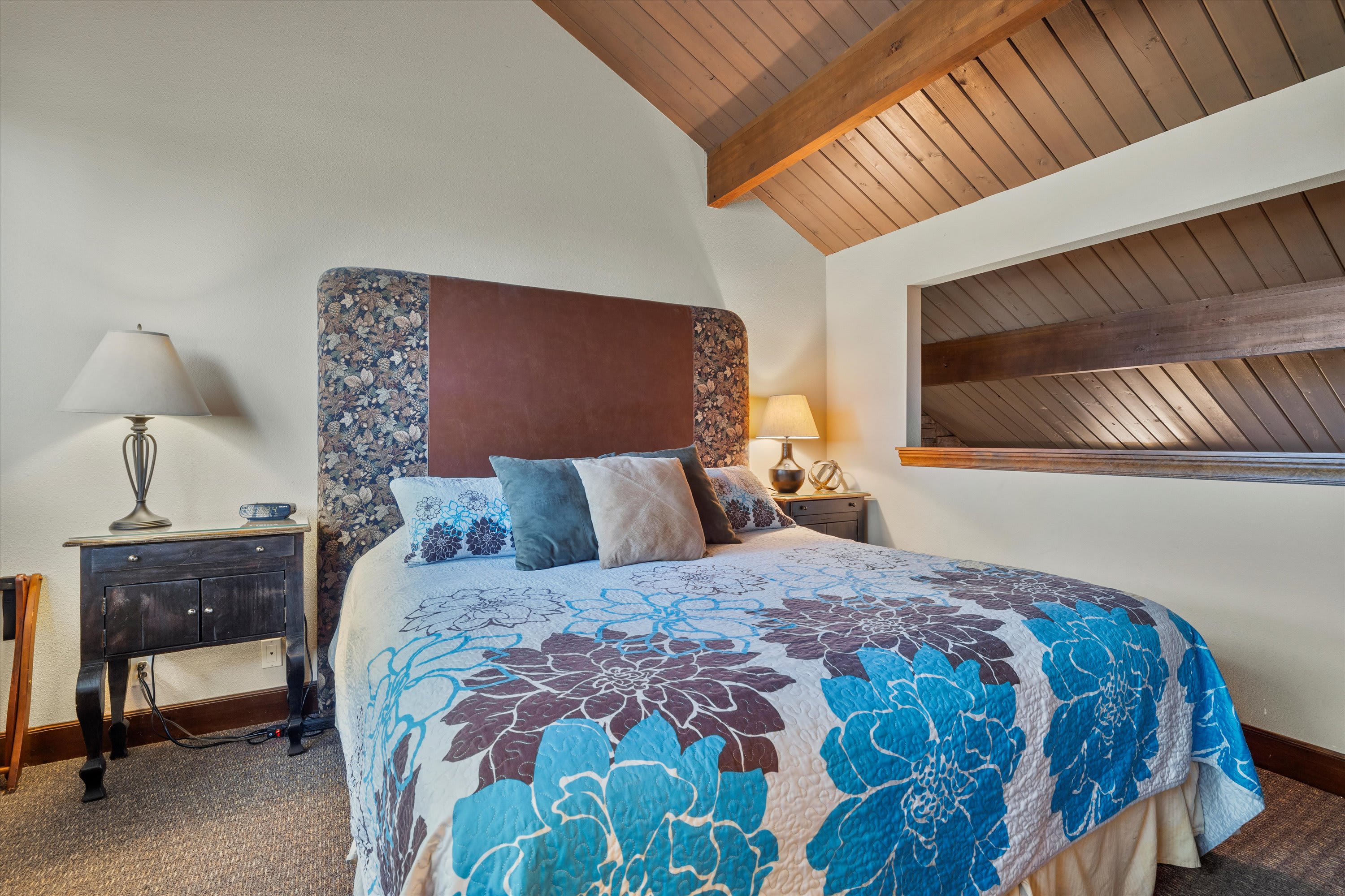 The loft includes a king size bed as well as connected full bathroom with an oversized single vanity and shower/tub combo.