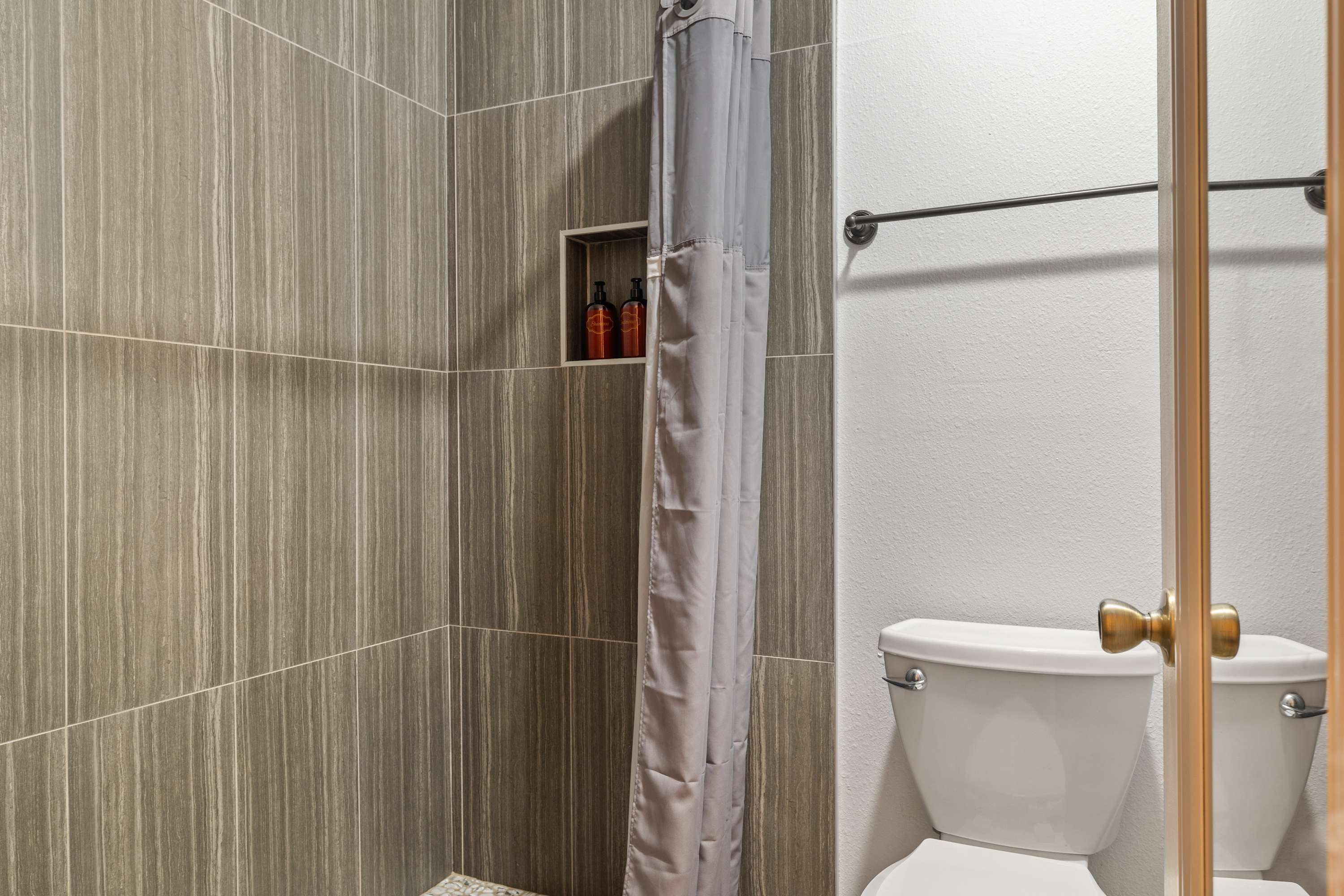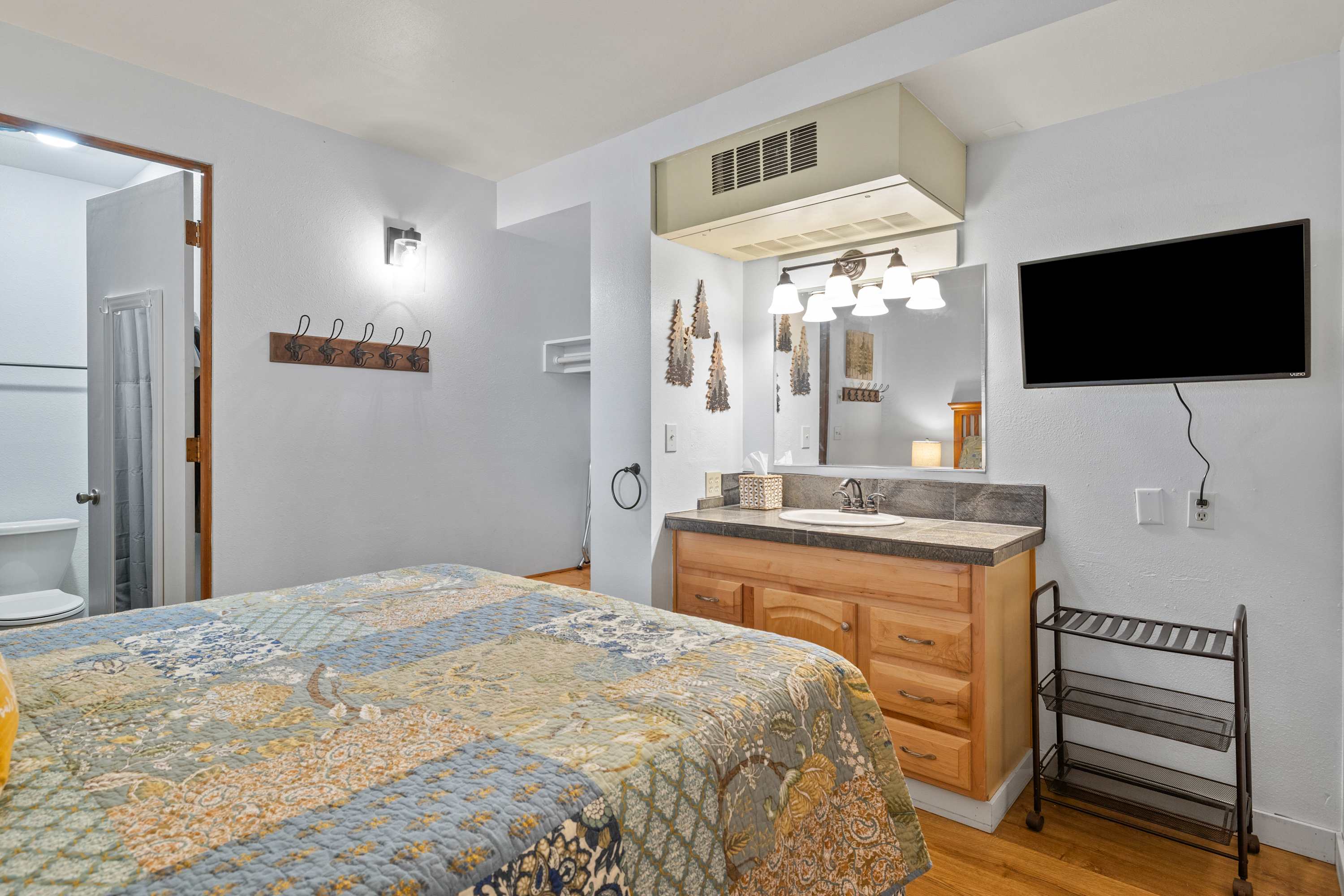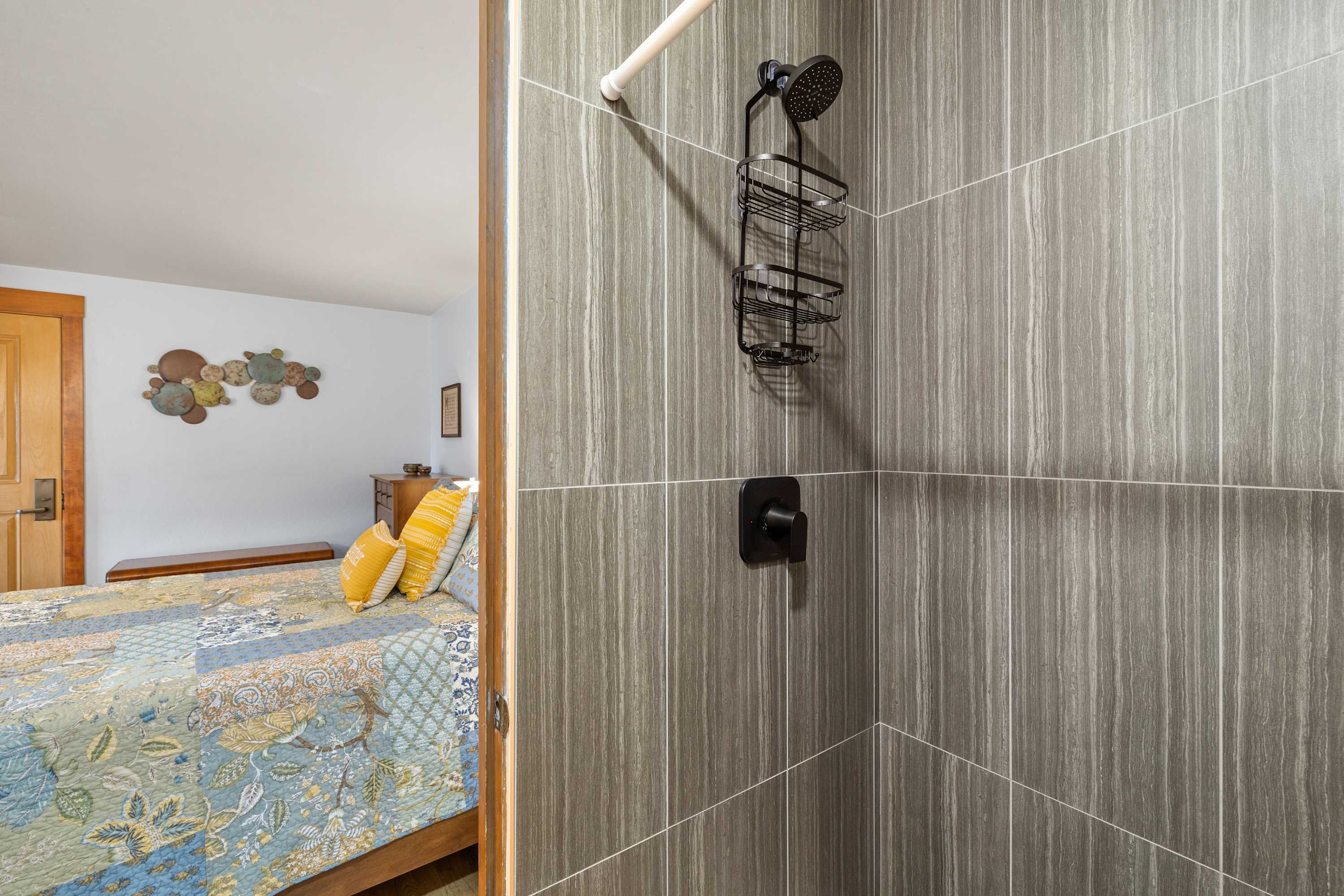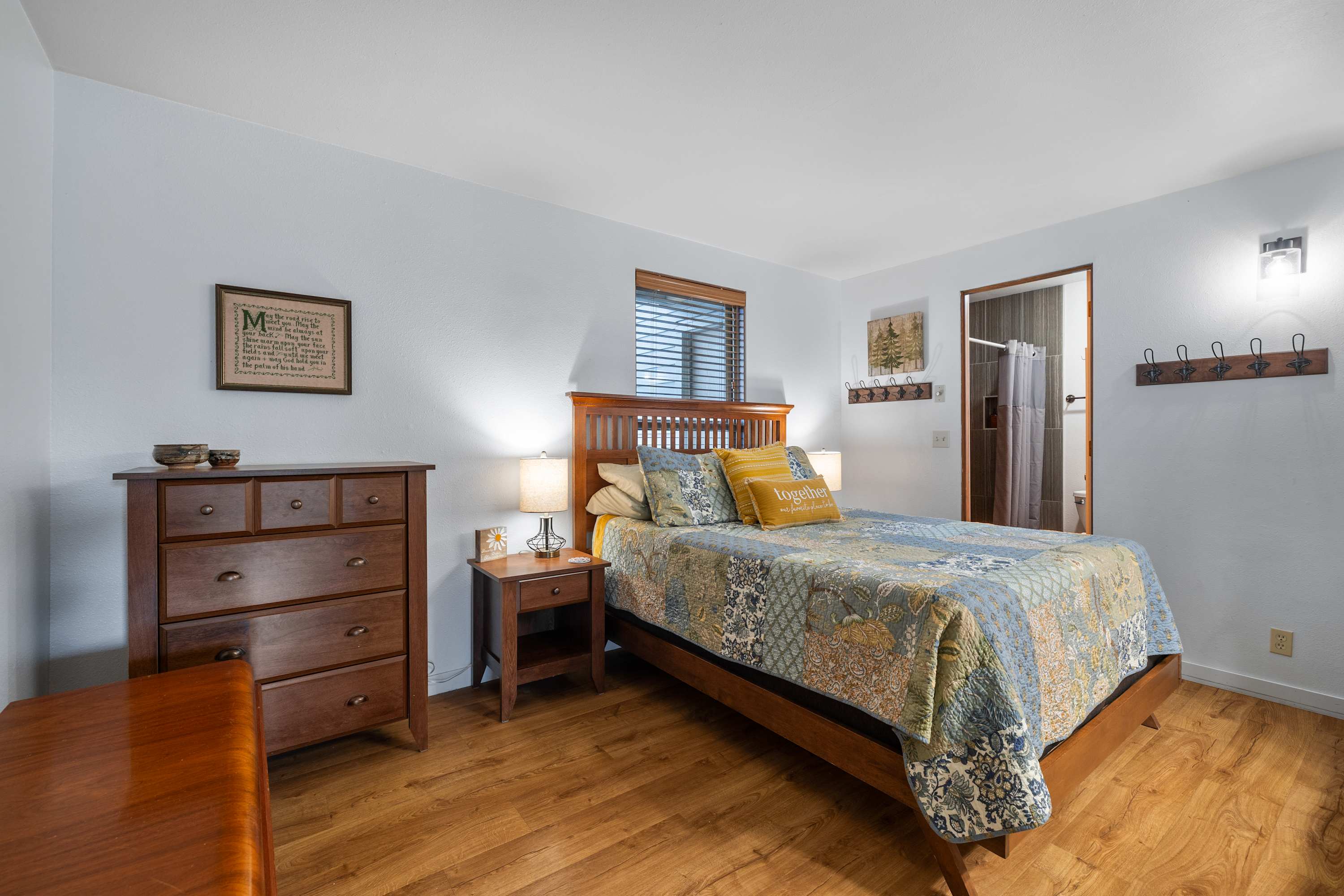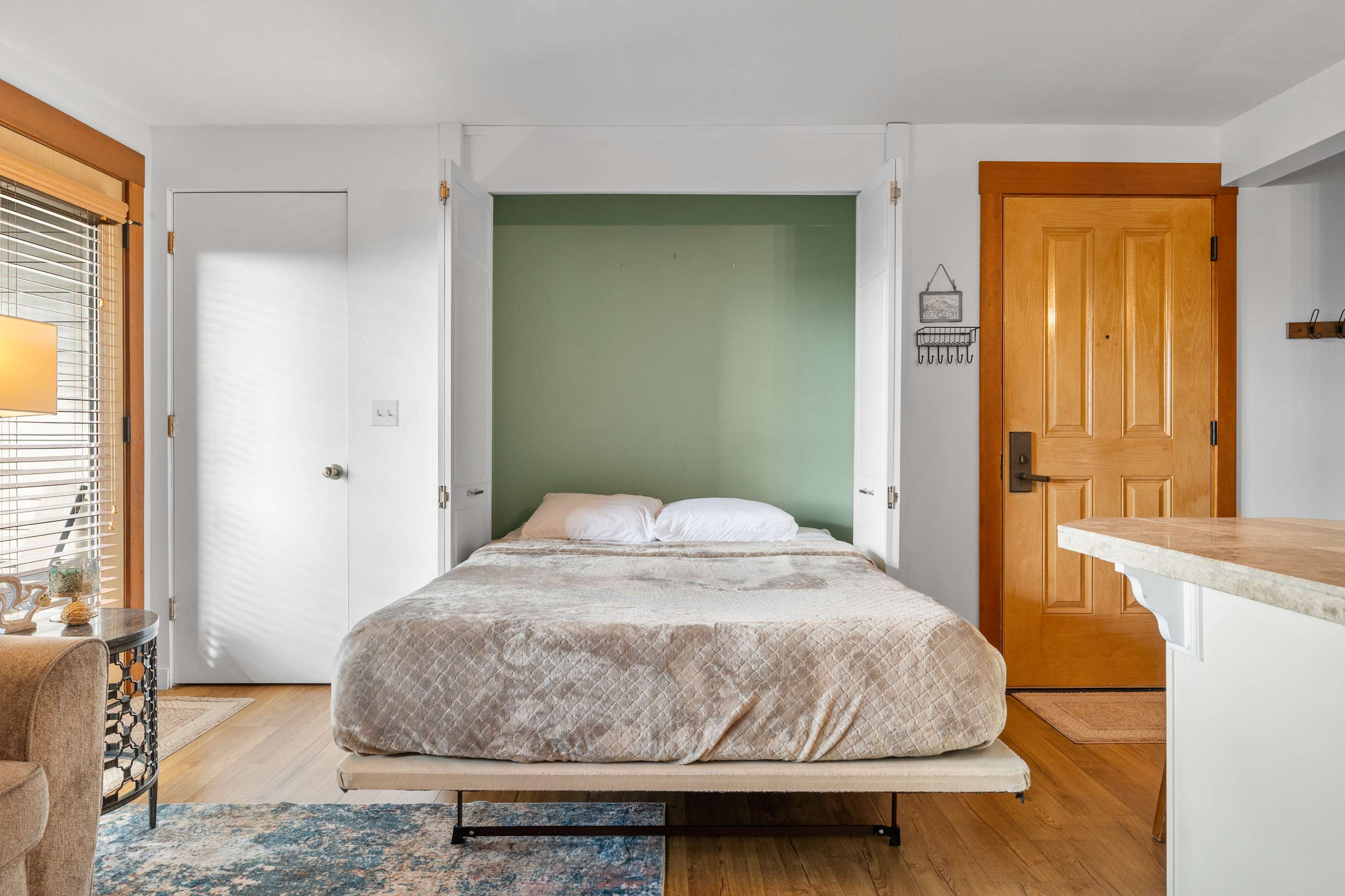 This home comfortably sleeps 6 guests between 1 private bedroom, a queen size sofa sleeper, and a queen size murphy bed in the living room. The bedroom includes a queen size bed, a smart TV, and ensuite bathroom with a single vanity and walk-in shower. The home also includes an additional full guest bathroom with a single vanity and shower/tub combo.