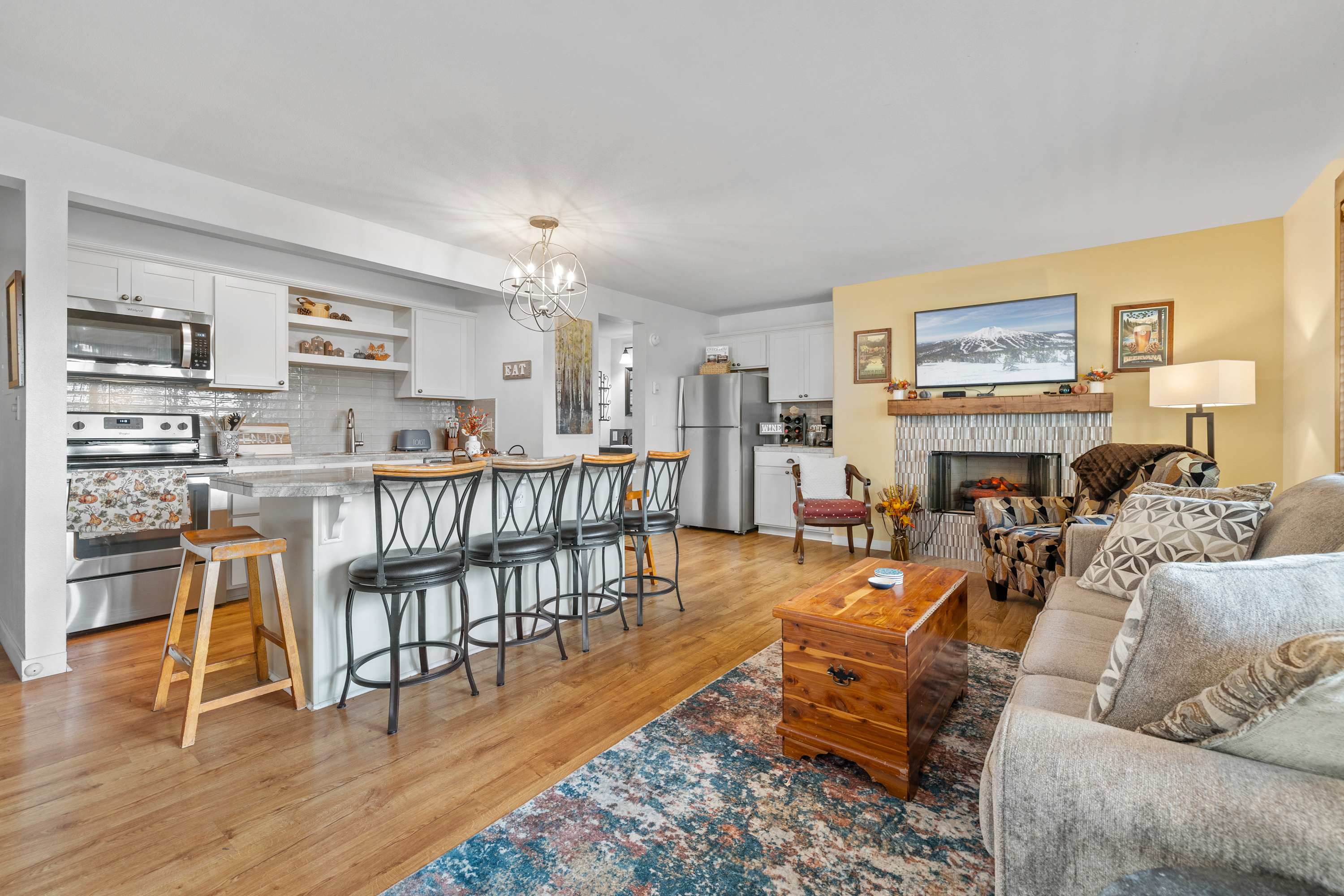 Let relaxation take you over as you lounge in the cozy living room on the plush sofa or armchair seating, setting the electric fireplace ablaze in the colder months to create the perfect ambiance for streaming a new movie on the mounted smart TV. The modern kitchen is fully equipped with stainless steel appliances, drip coffee maker, cookware, and dining ware for the added convenience of preparing delicious meals right from home. The spacious island also serves as the dining area, where high-top stools can seat 6 for formal meals and quick bites alike.