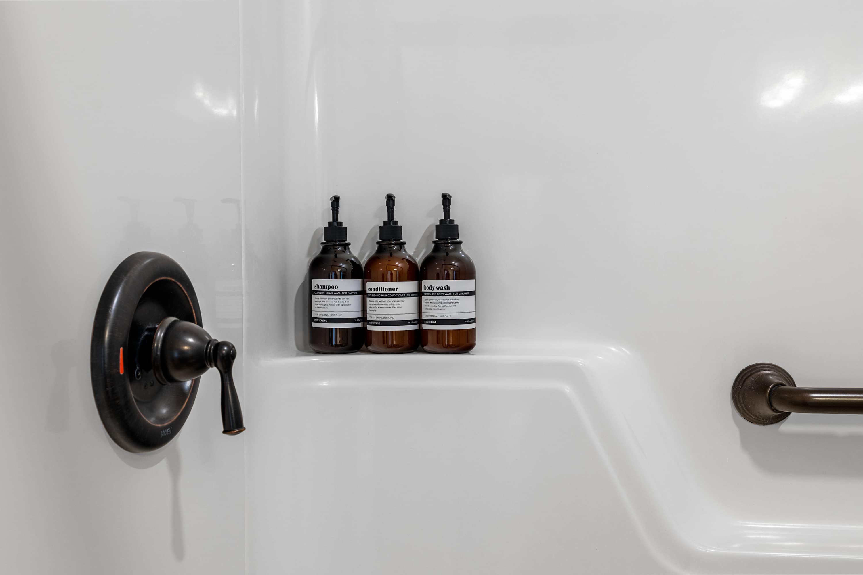 Bedroom #1 includes a king size bed, TV, deck access, and ensuite bathroom with an oversized vanity and shower/tub combo.