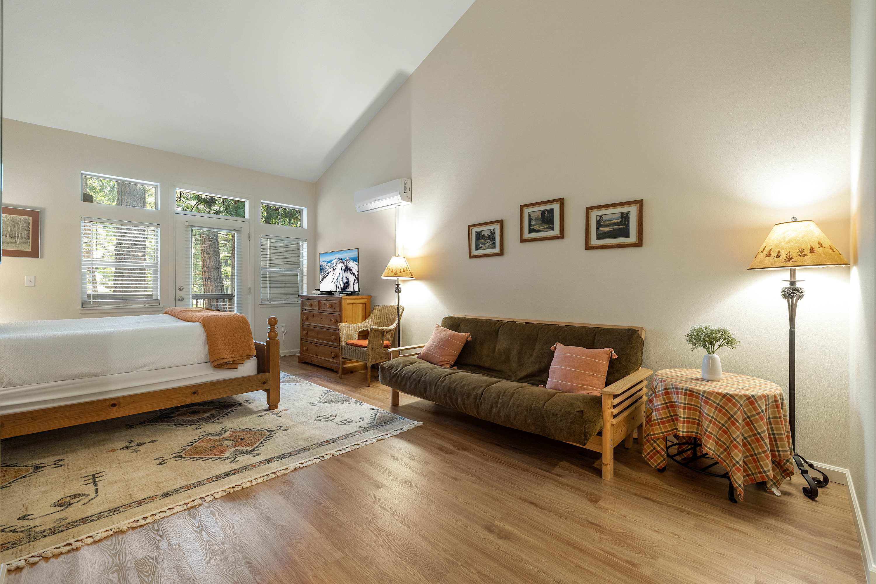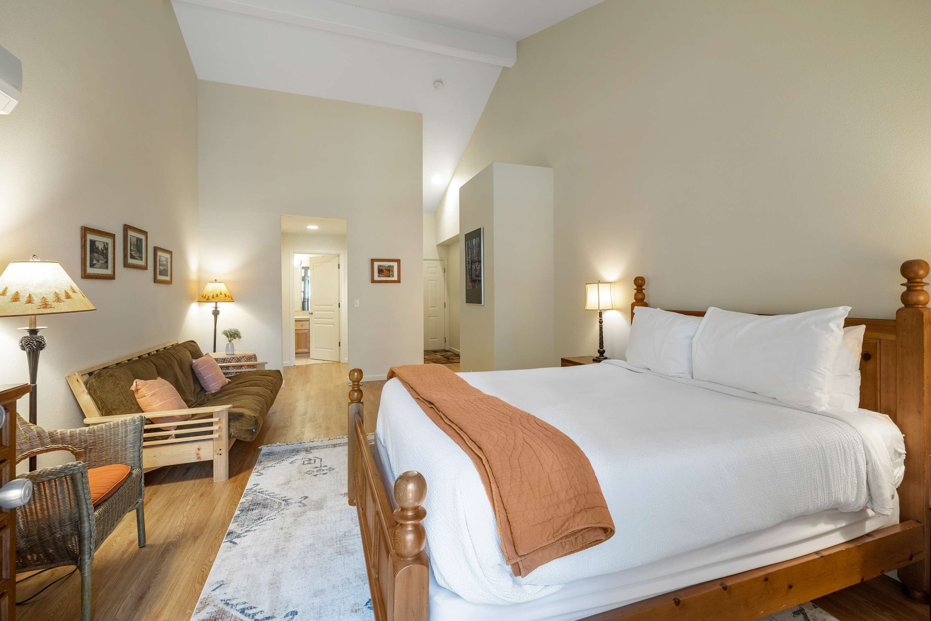 The bedroom features a queen size bed supplied with fresh linens and soft blankets, the perfect place for an afternoon nap or an evening movie on the smart TV. A soft futon offers a second seating option for catching up on your vacation reading list. The full, private bathroom includes a single vanity and shower/tub combo. This room also has its own kitchenette that offers everything you need for meal storage and a quick reheat courtesy of the refrigerator and microwave. The drip coffee maker will be your first stop in the morning as you brew up a cup to take and enjoy out on the deck.