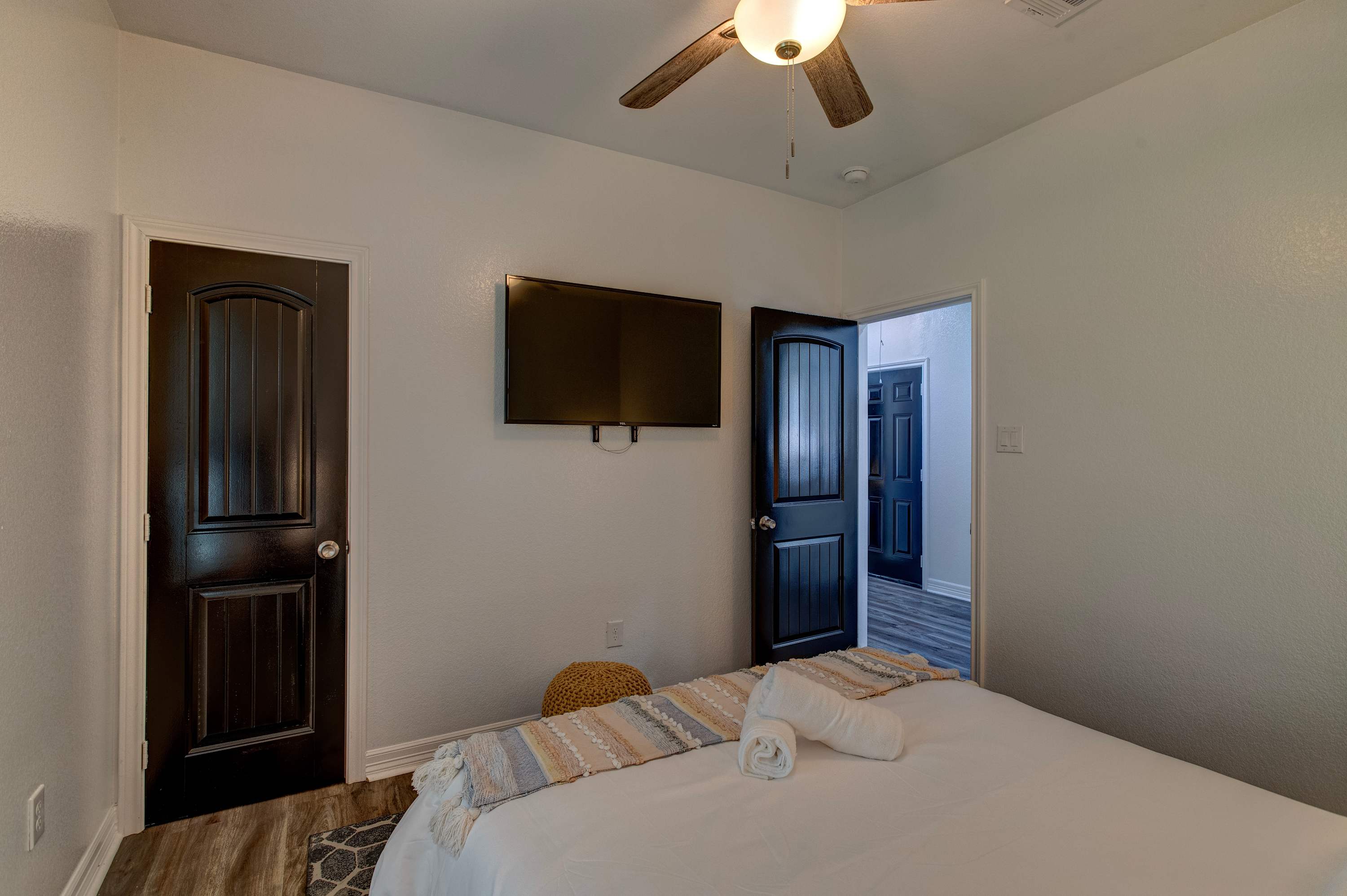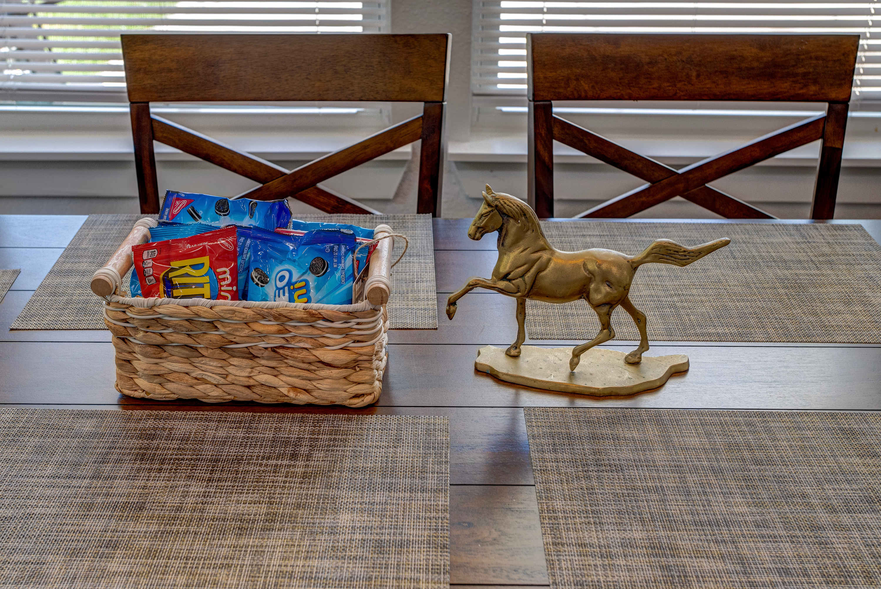 As you step inside the home, you’ll be greeted by fresh, modern spaces decked out in cowboy-chic décor and comfortable furnishings to make the absolute most of your downtime. Sink into the plush living room sofa while you keep up with episodes of all your favorite shows on the mounted smart TV. Steps away, the stylish kitchen showcases stainless steel appliances, glossy stone countertops, and sleek white cabinetry stocked with everything you need to whip up delicious meals right at home. Gather the whole crew for formal dining at the table for 6, afterward breaking out the games for an evening of fun and laughter.