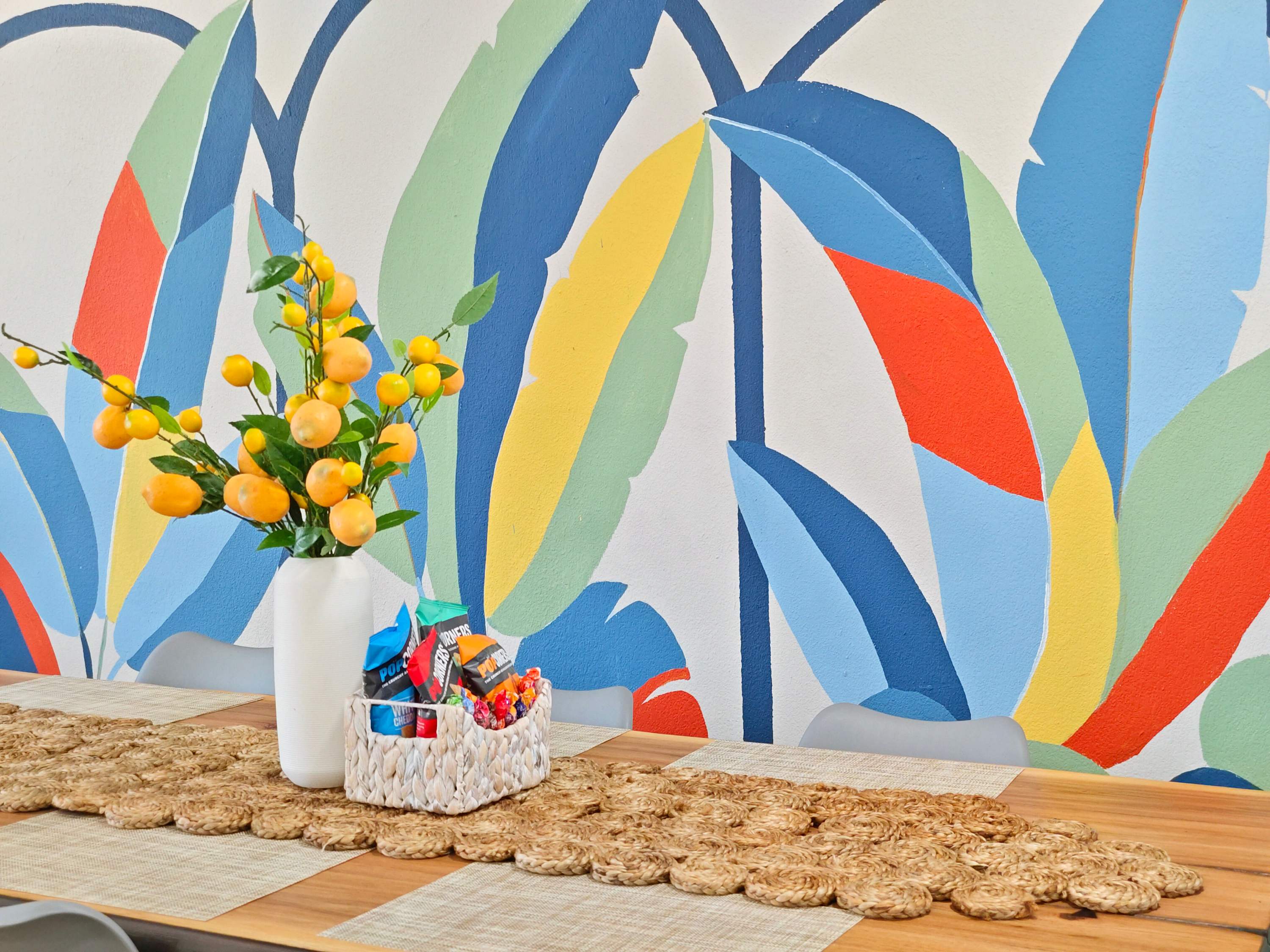 Inside the home, colorful murals adorn the walls of the main living space, a nod to the city and its vibrant art and cultural scene. The spacious open floorplan equally promotes connectivity and relaxation, ensuring everyone has a space to spread out while keeping the conversation engaging. Sink into plush leather sofa seating in the living room while you queue up a new movie or catch up on episodes of your favorite show on the smart TV. Steps away, the modern kitchen showcases stainless steel appliances, glossy stone countertops, and sleek white cabinetry stocked with cookware and dining ware for the convenience of preparing meals right at home. A stylish dining room table can seat 8 for meals, while 4 can grab a high-top stool at the island. When your competitive side kicks in, make your way to the game room where the game table can convert into whatever strikes your fancy from foosball, to pool, to ping pong.