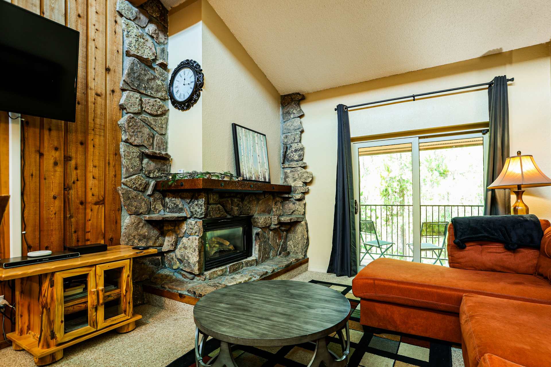 Stepping indoors, the cozy living room offers a plush sofa with chaise lounge surrounding a gas fireplace, the perfect spot for a toasty movie night courtesy of the mounted smart TV. The tall and stately dining room table is just steps away, seating 6 for both formal meals and an energetic night of games. The attractive kitchen is fully equipped for all your mealtime needs, with modern appliances, cookware, dining ware, and drip coffee maker all on hand and ready to assist.