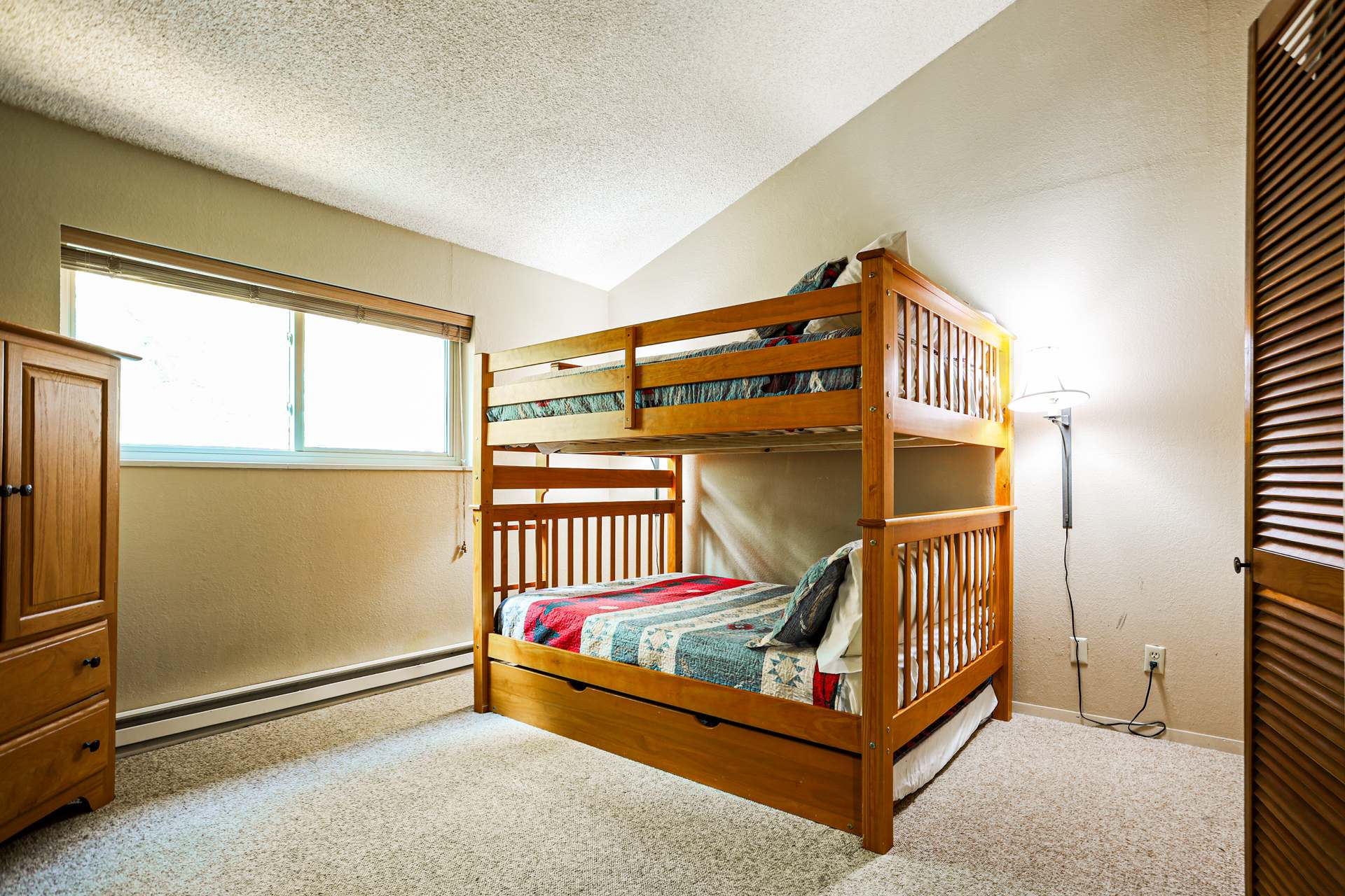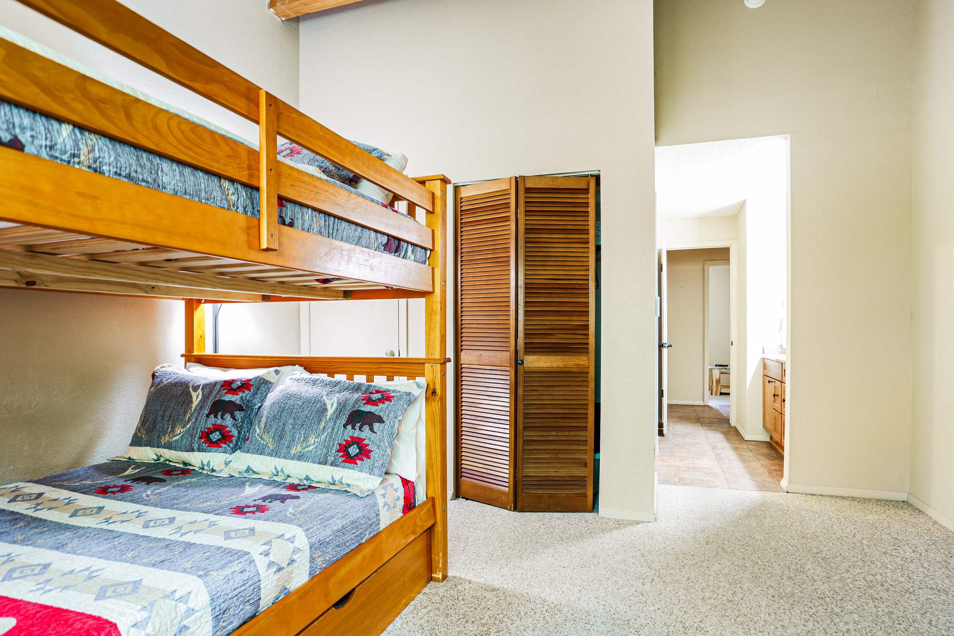 Bedroom #2 includes a full-over-full bunk bed with a full trundle, as well as a TV and ensuite bathroom with a dual vanity and shower/tub combo.