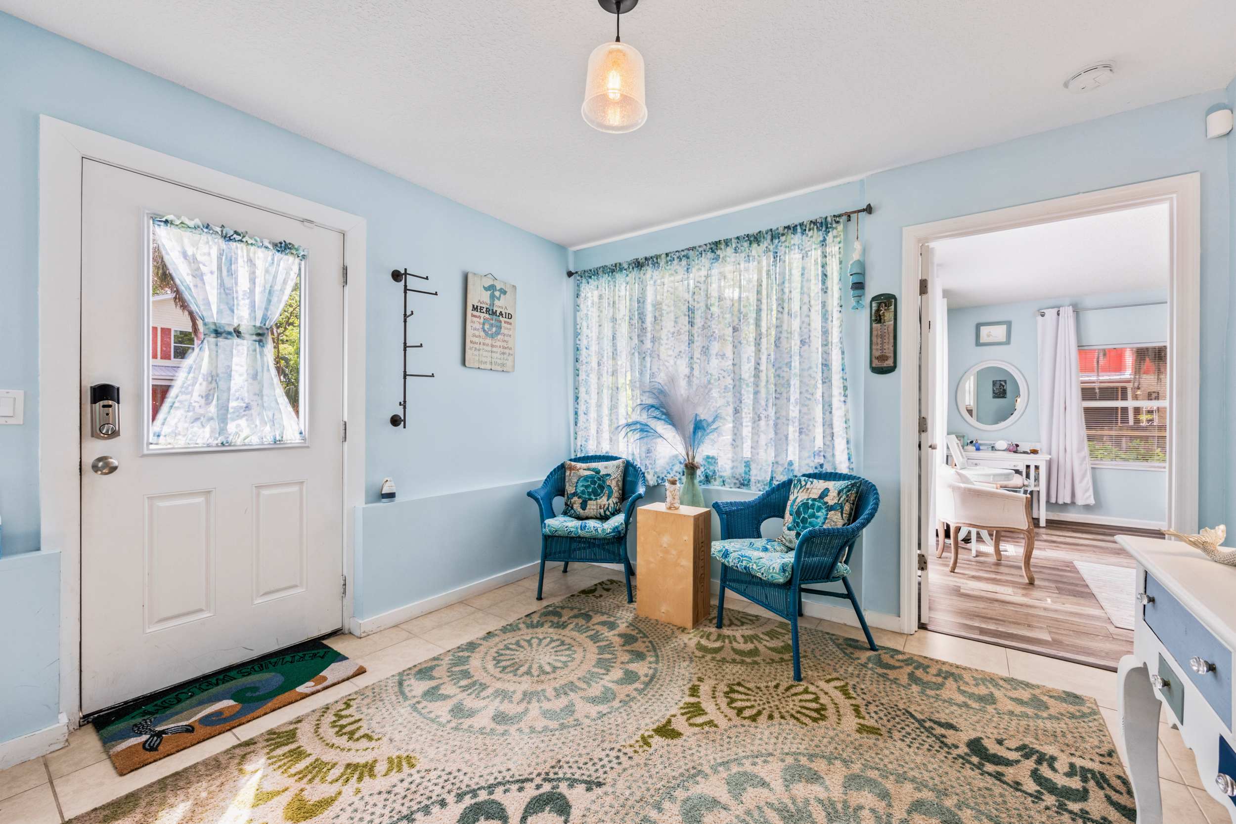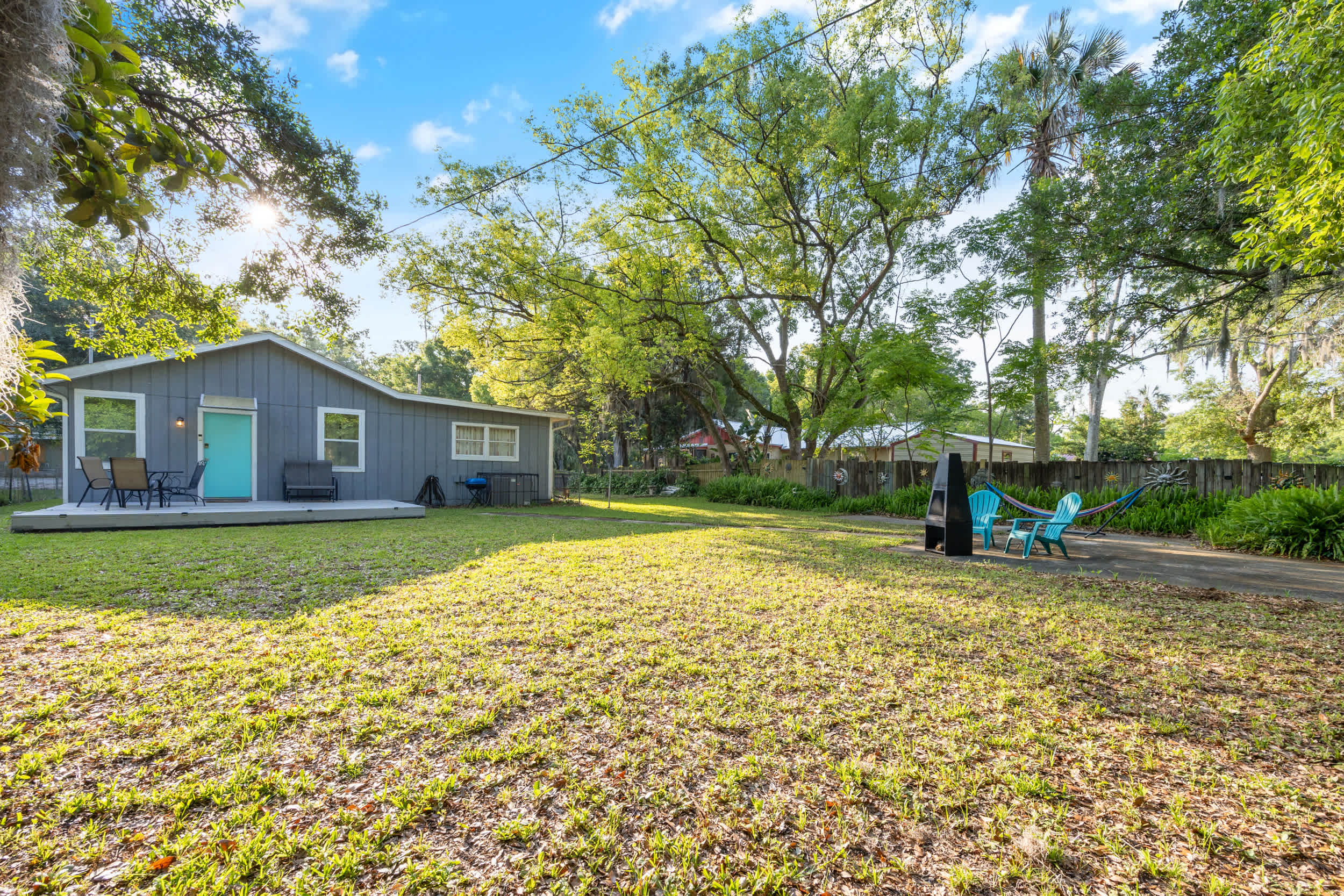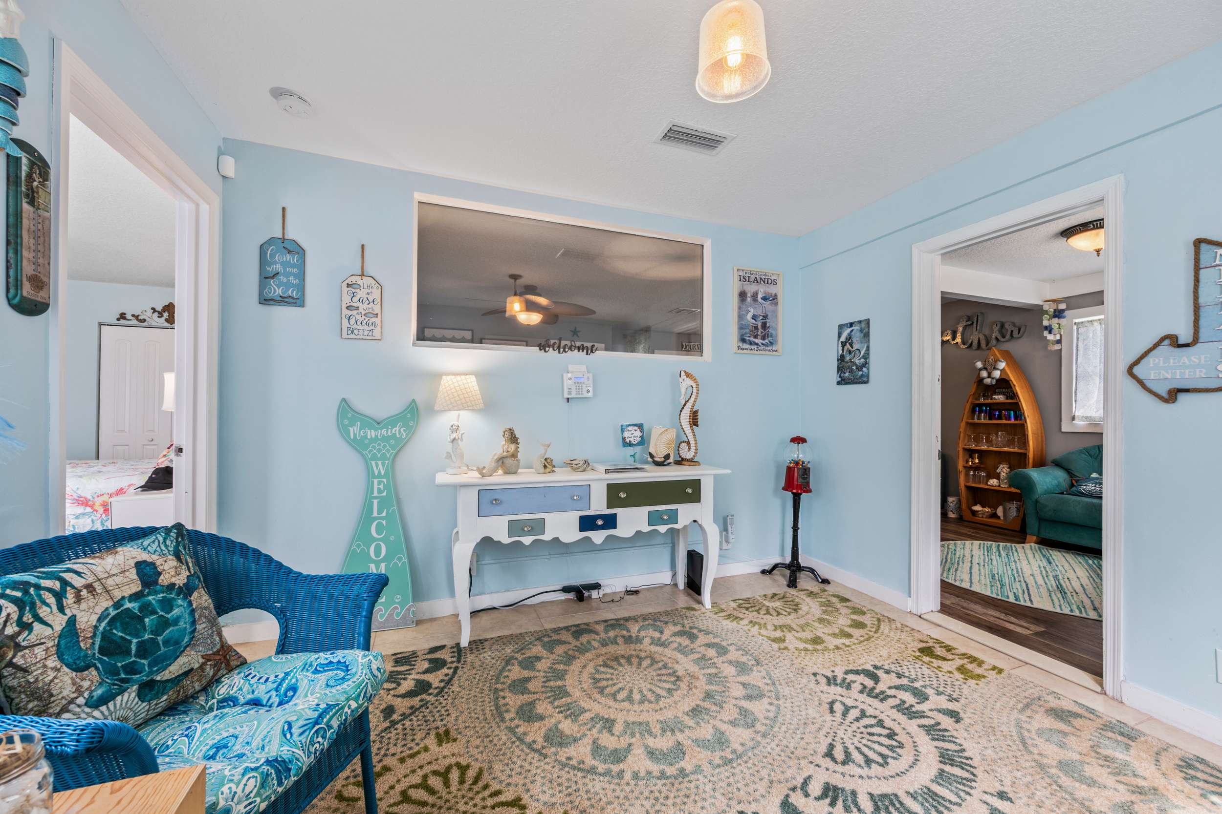 Mermaid Cottage offers the perfect blend of nostalgic mid-century aesthetics and contemporary comforts mixed with a little Mermaid charm., This enchanting 3-bedroom 2-bath home, just across the San Sebastian River from the city center, gladly welcomes you to this dynamic area where vibrant culture meets timeless beauty. A spacious and scenic backyard offers the peace and relaxation you’ve been looking forward to whether dining on a meal al fresco on the deck, gathering around the firepit under the stars, or taking a quiet afternoon nap in the hammock.