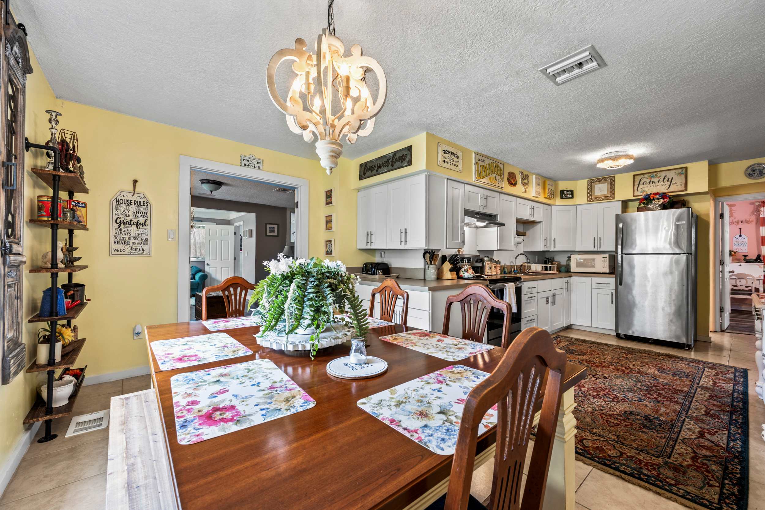 Inside the home, the magical interior’s unique charm seamlessly blends comfortable, contemporary furnishings with charming coastal-chic style, offering spaces designed as much for connectivity as they are for rejuvenation. Sink into plush living room sofa seating while you queue up that new movie you’ve been saving on the smart TV. An even cozier seating area is nearby, perfect for sipping your morning coffee while turning the pages of a good book. The well-stocked kitchen includes all the comforts of home to help you whip up an afternoon snack or full, family-style meal, showcasing stainless steel appliances and ample counter space and cabinetry for preparation and storage. The reverse osmosis water system will save you time and money as you opt for reusable water bottles to help keep you hydrated on the go. Dine together or host a family game night at the dining table, with enough seating for the whole crew.