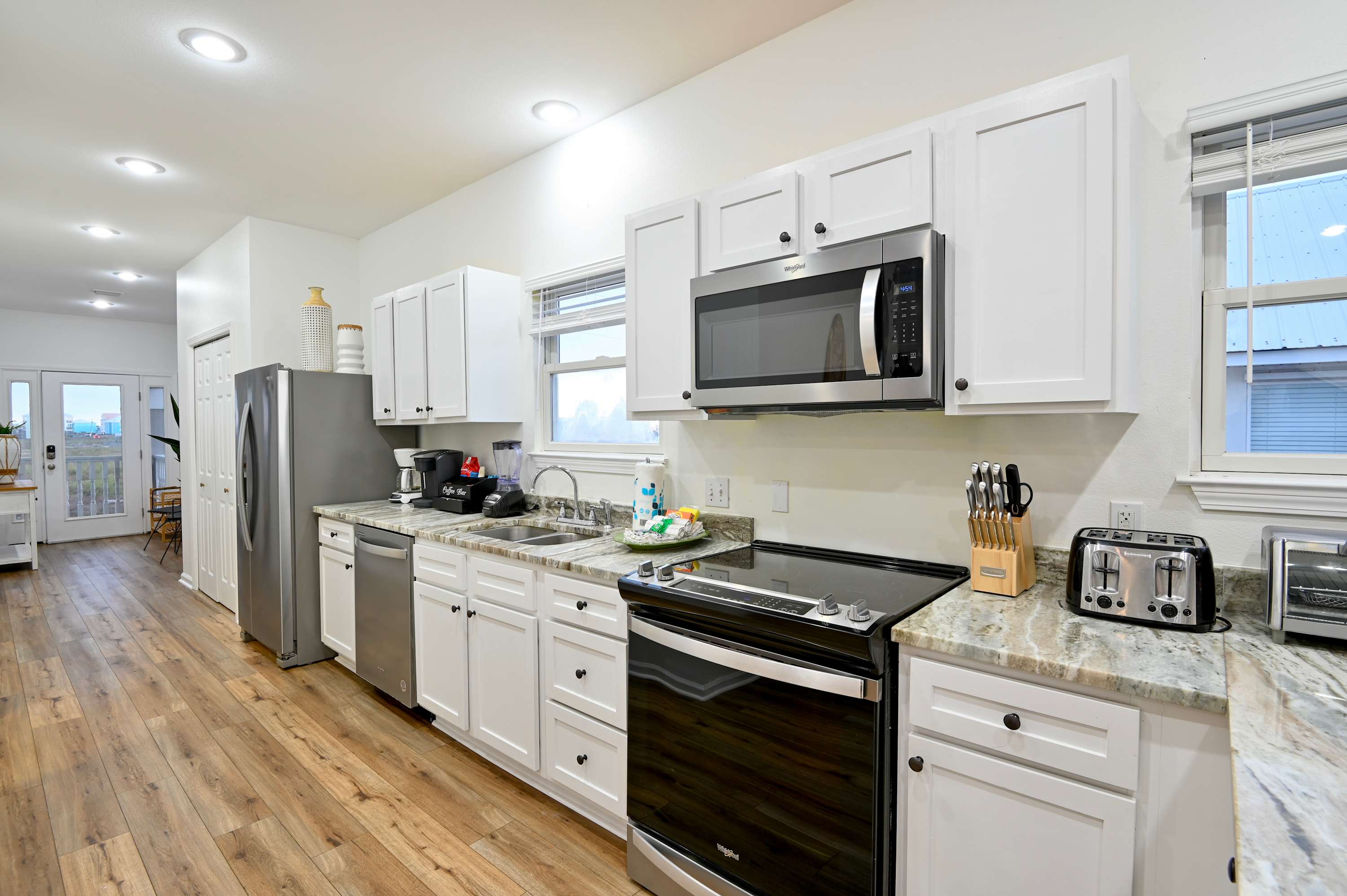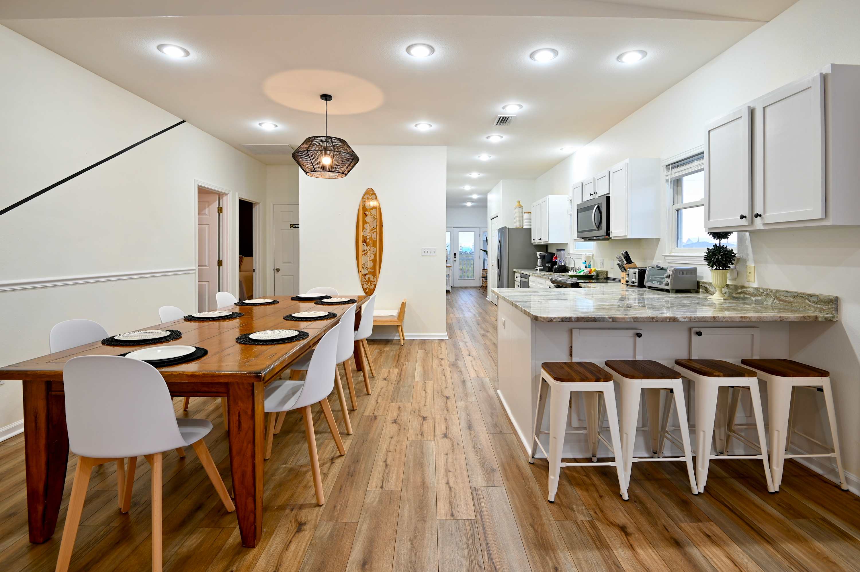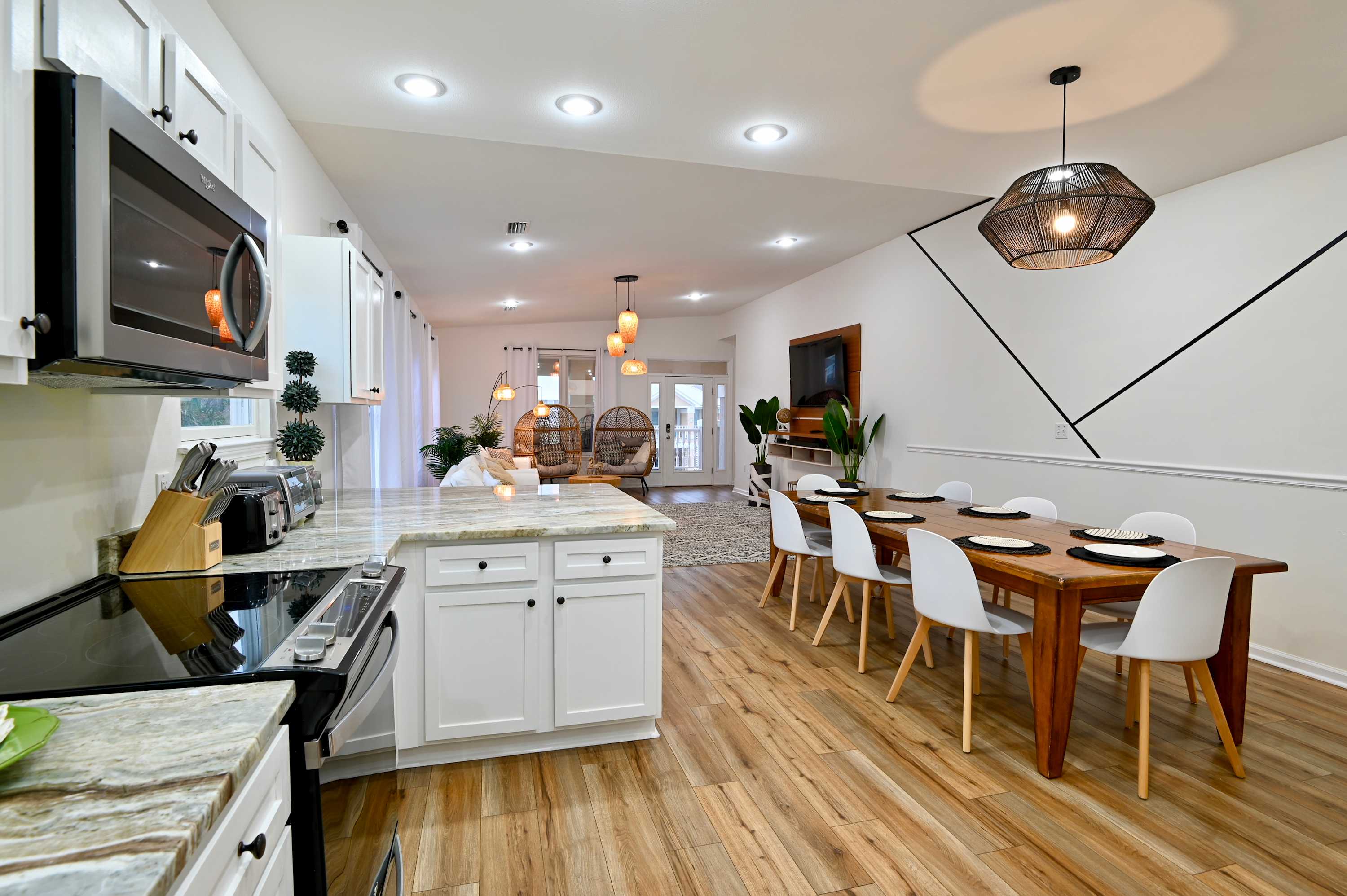 The home’s bright and airy interior provides much needed relief from the heat as well as for your feet, with all the modern comforts you desire. Sink into plush sofa seating in the living room while you stream all your favorite shows and movies on the smart TV. The open floor plan flows you into the stylish kitchen, fully equipped for all your mealtime endeavors with stainless steel appliances, glossy stone counters, and sleek white cabinetry stocked with cookware and dining ware. Dine together at the formal table with seating for 8 or head back outdoors to the deck and dine al fresco while you admire the view. As the day winds down, relax your tired muscles in the bubbling Jacuzzi, an outdoor shower helping you rinse off before heading back inside to call it a night.
