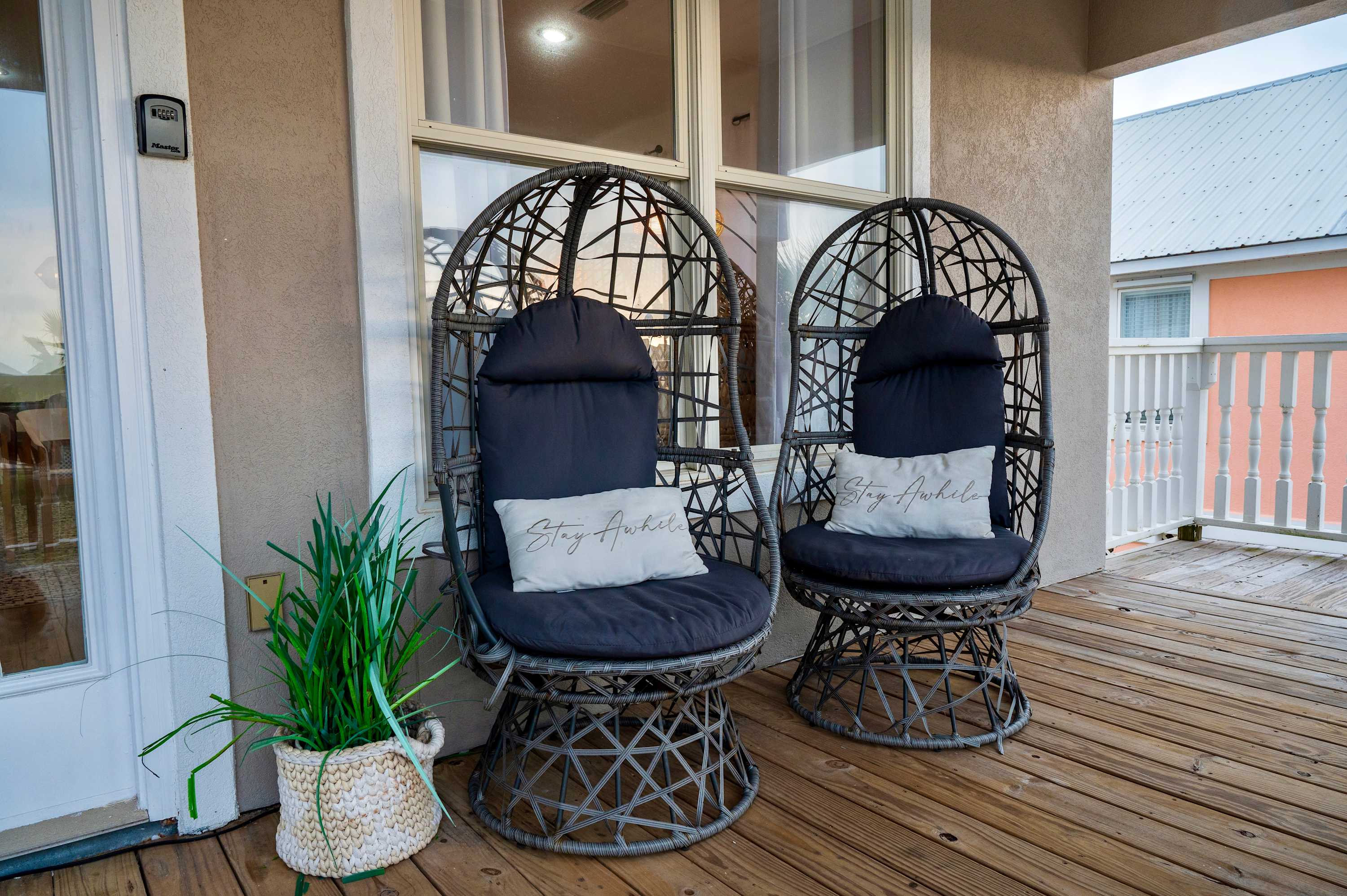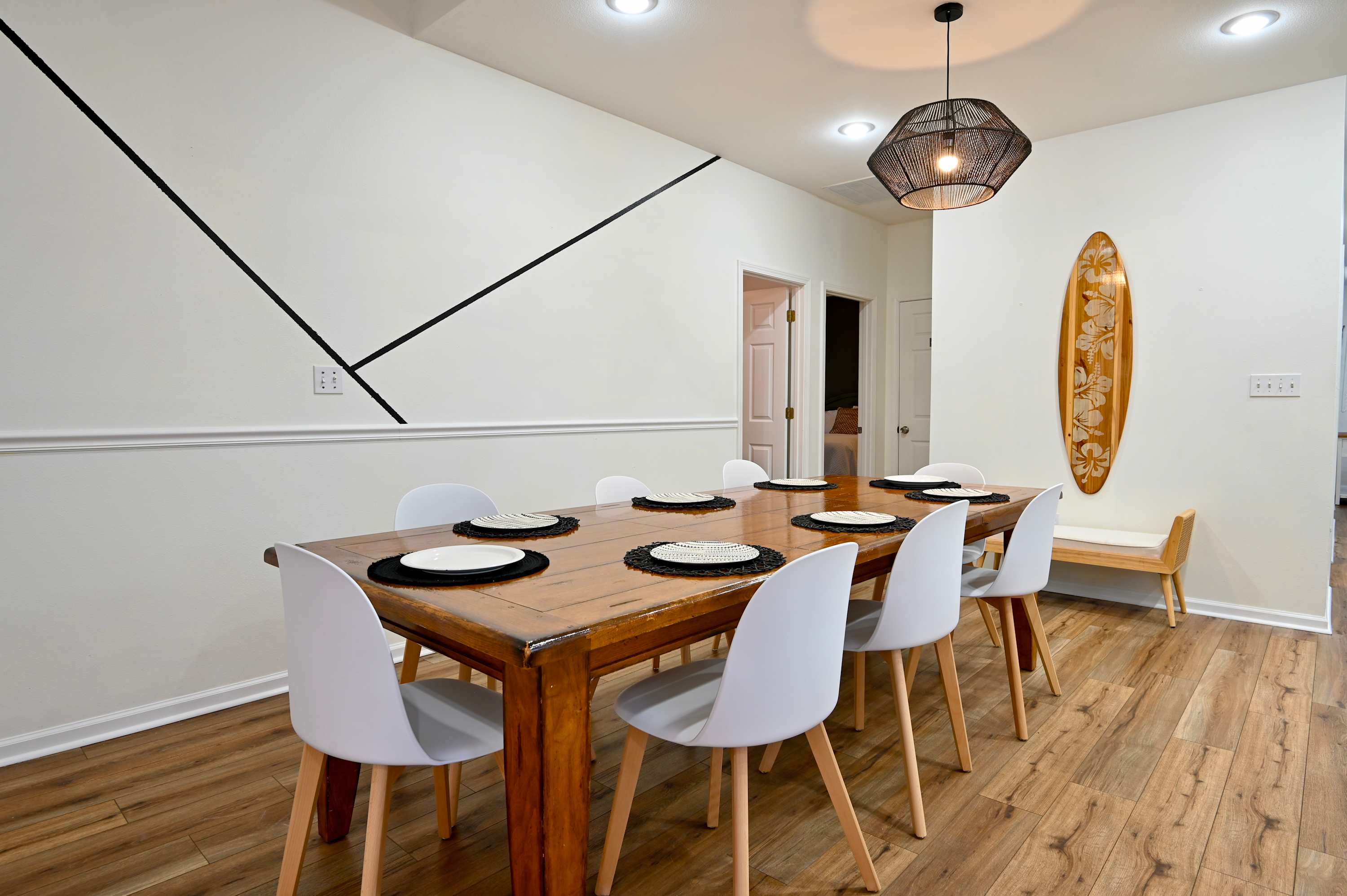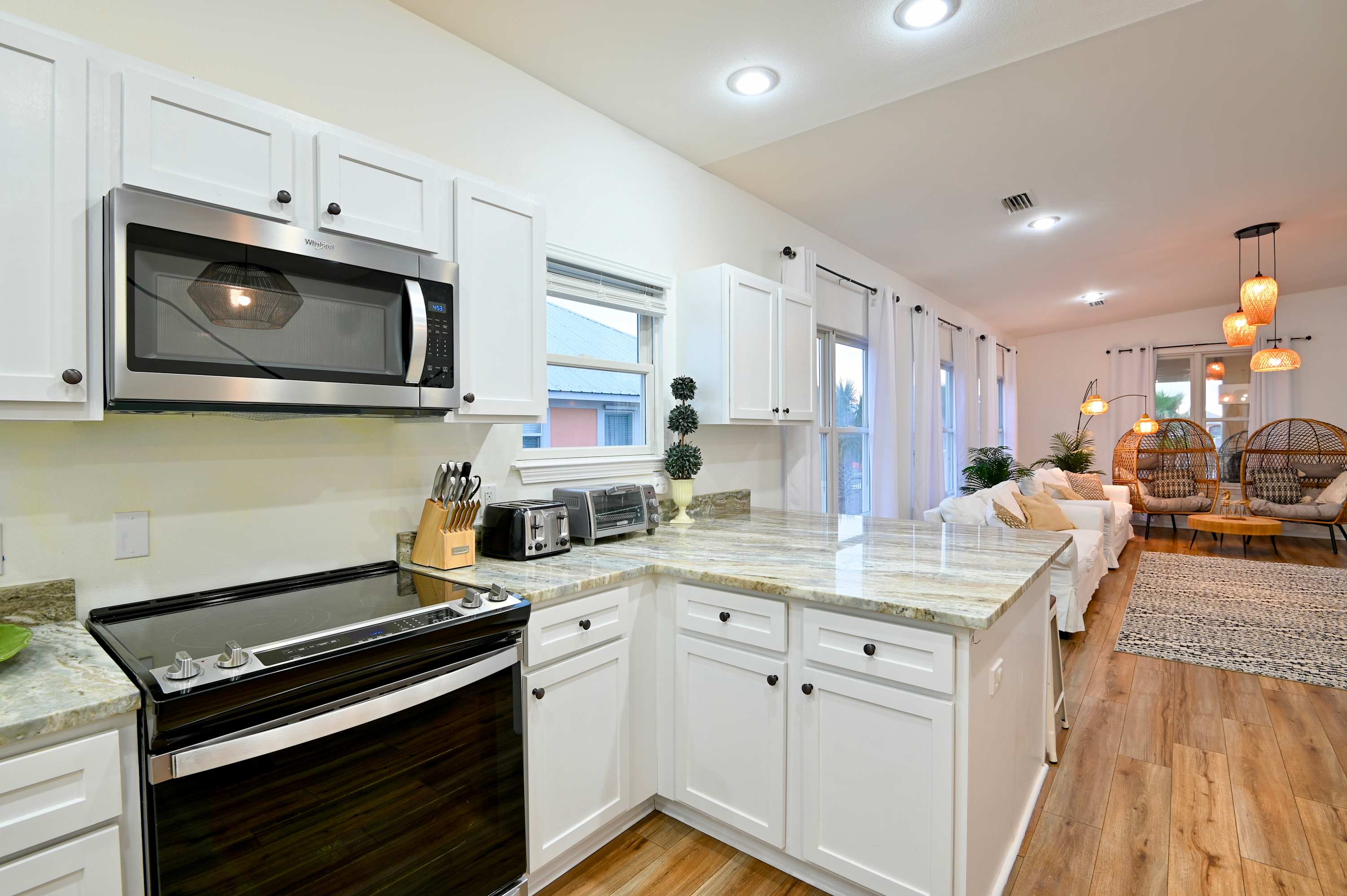 The home’s bright and airy interior provides much needed relief from the heat as well as for your feet, with all the modern comforts you desire. Sink into plush sofa seating in the living room while you stream all your favorite shows and movies on the smart TV. The open floor plan flows you into the stylish kitchen, fully equipped for all your mealtime endeavors with stainless steel appliances, glossy stone counters, and sleek white cabinetry stocked with cookware and dining ware. Dine together at the formal table with seating for 8 or head back outdoors to the deck and dine al fresco while you admire the view. As the day winds down, relax your tired muscles in the bubbling Jacuzzi, an outdoor shower helping you rinse off before heading back inside to call it a night.