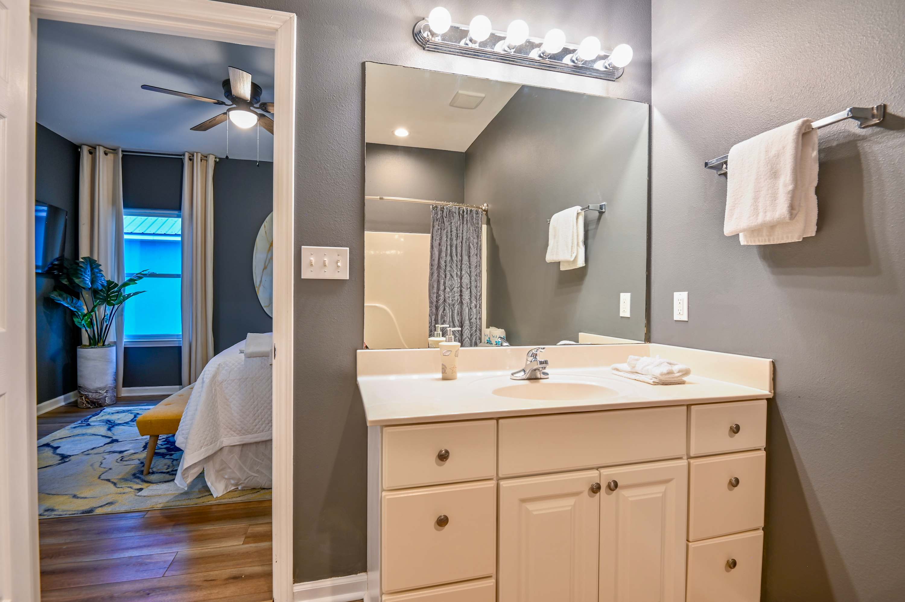 Bedroom #1 includes a queen size bed, smart TV, and Jack & Jill bathroom shared with bedroom #2 with dual vanities and a shower/tub combo.