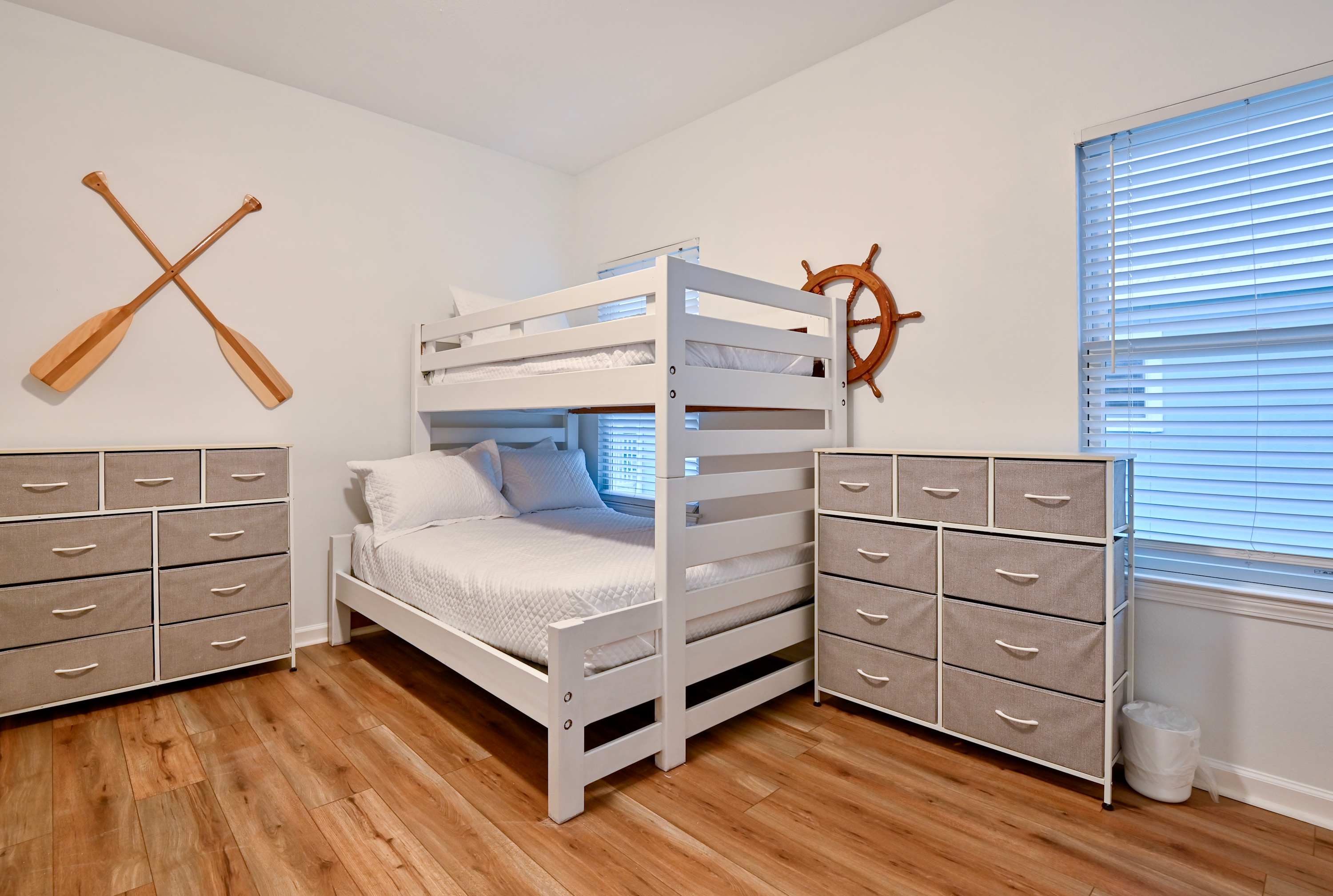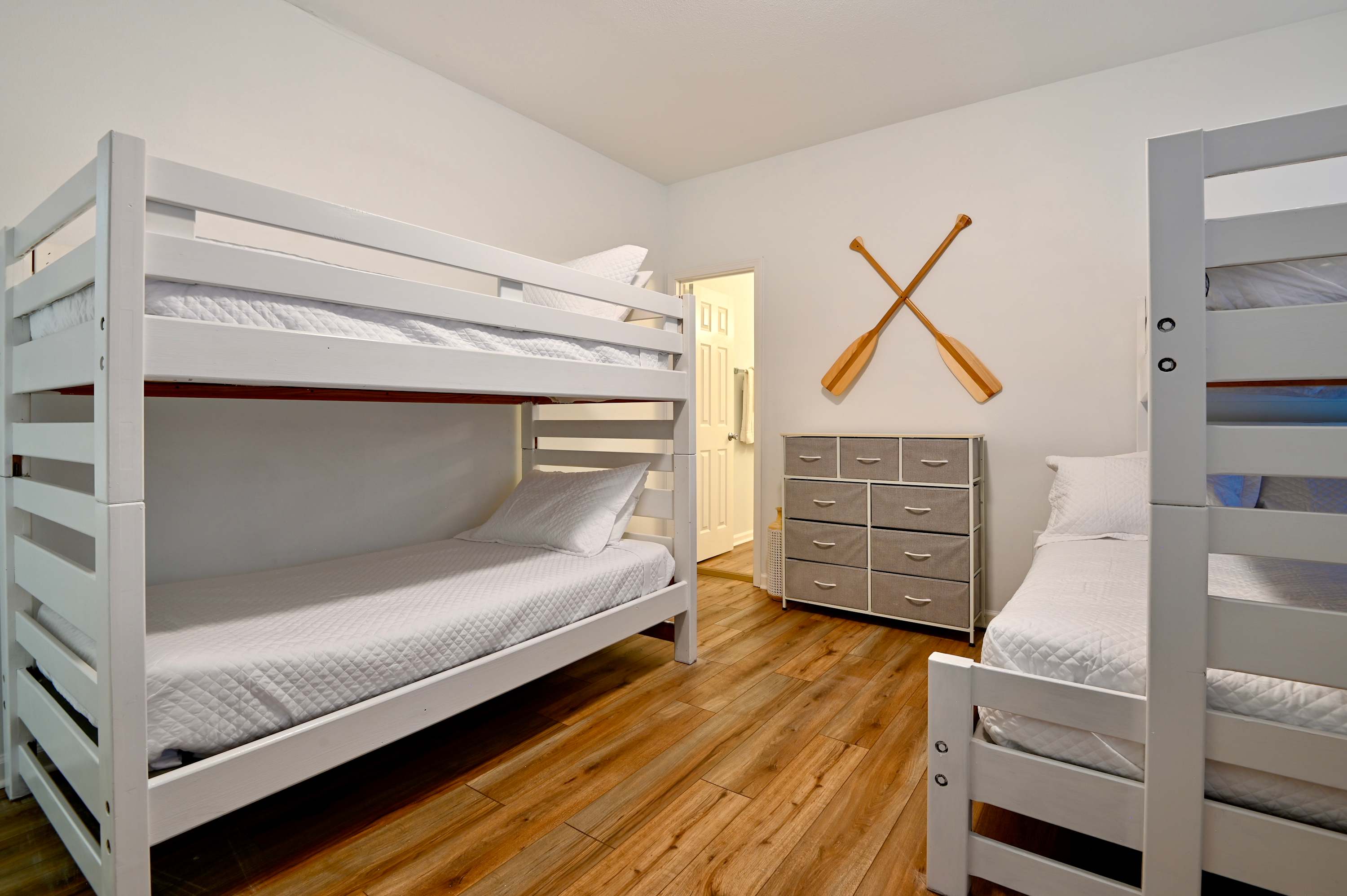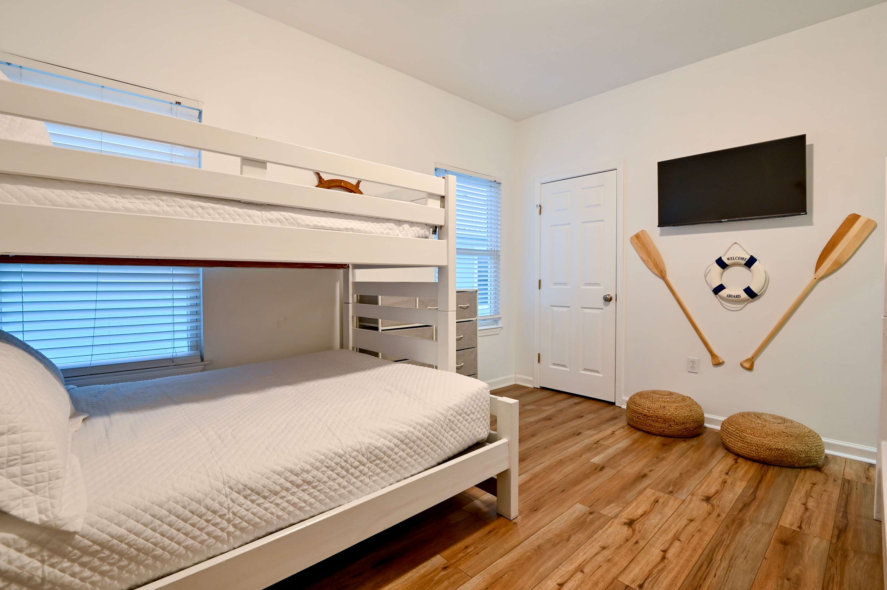 Bedroom #2 includes a twin-over-queen bunk bed, a twin-over-twin bunk bed, a smart TV, and a Jack & Jill bathroom shared with bedroom #1 with dual vanities and a shower/tub combo.