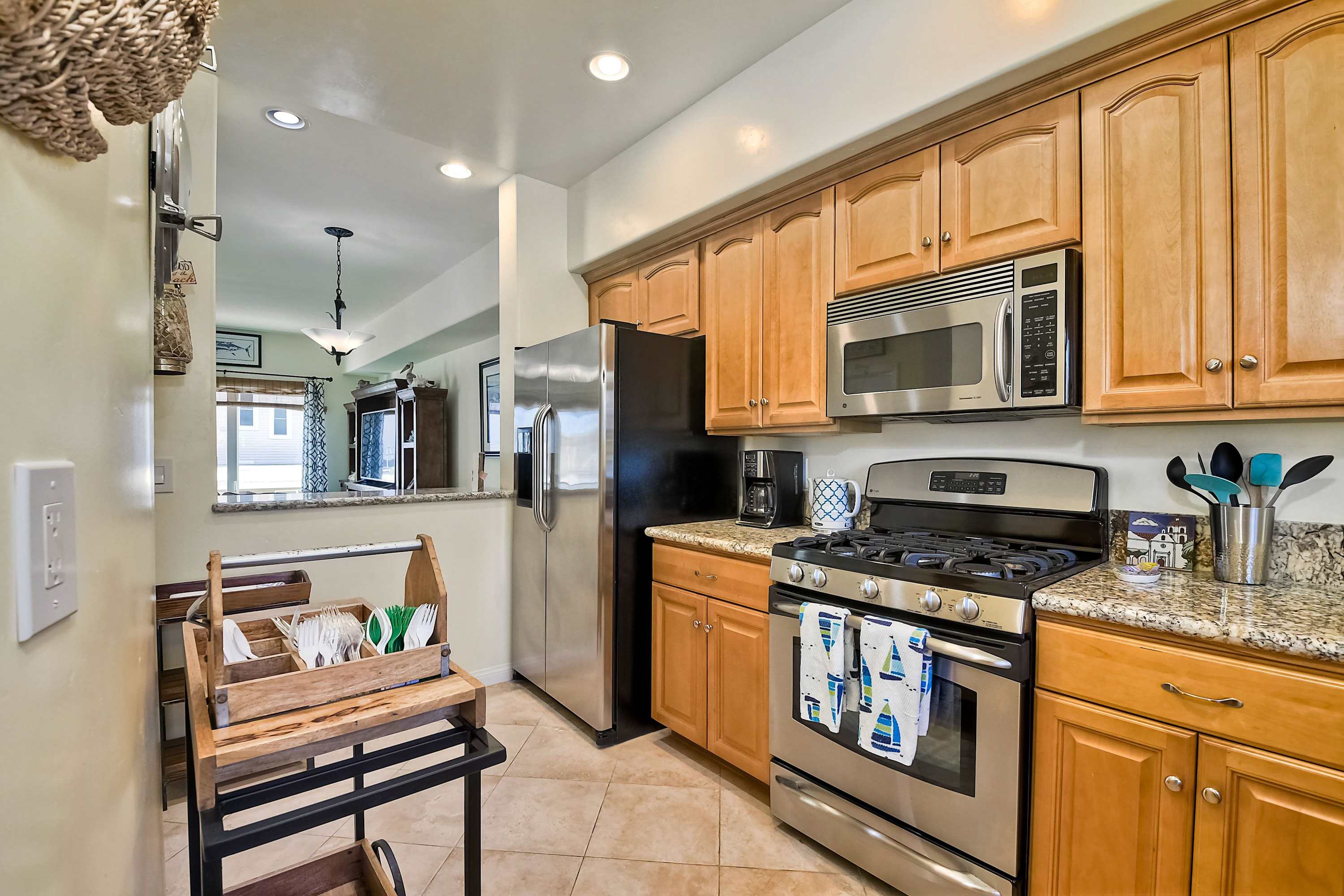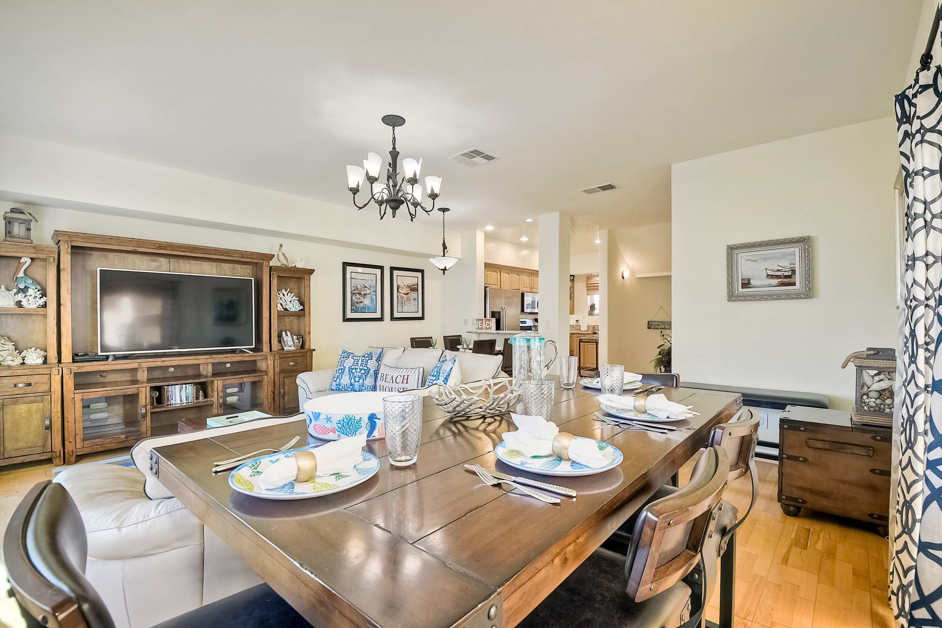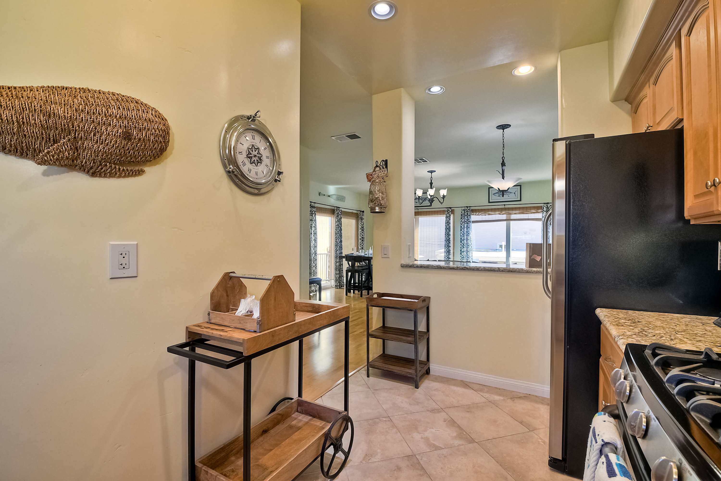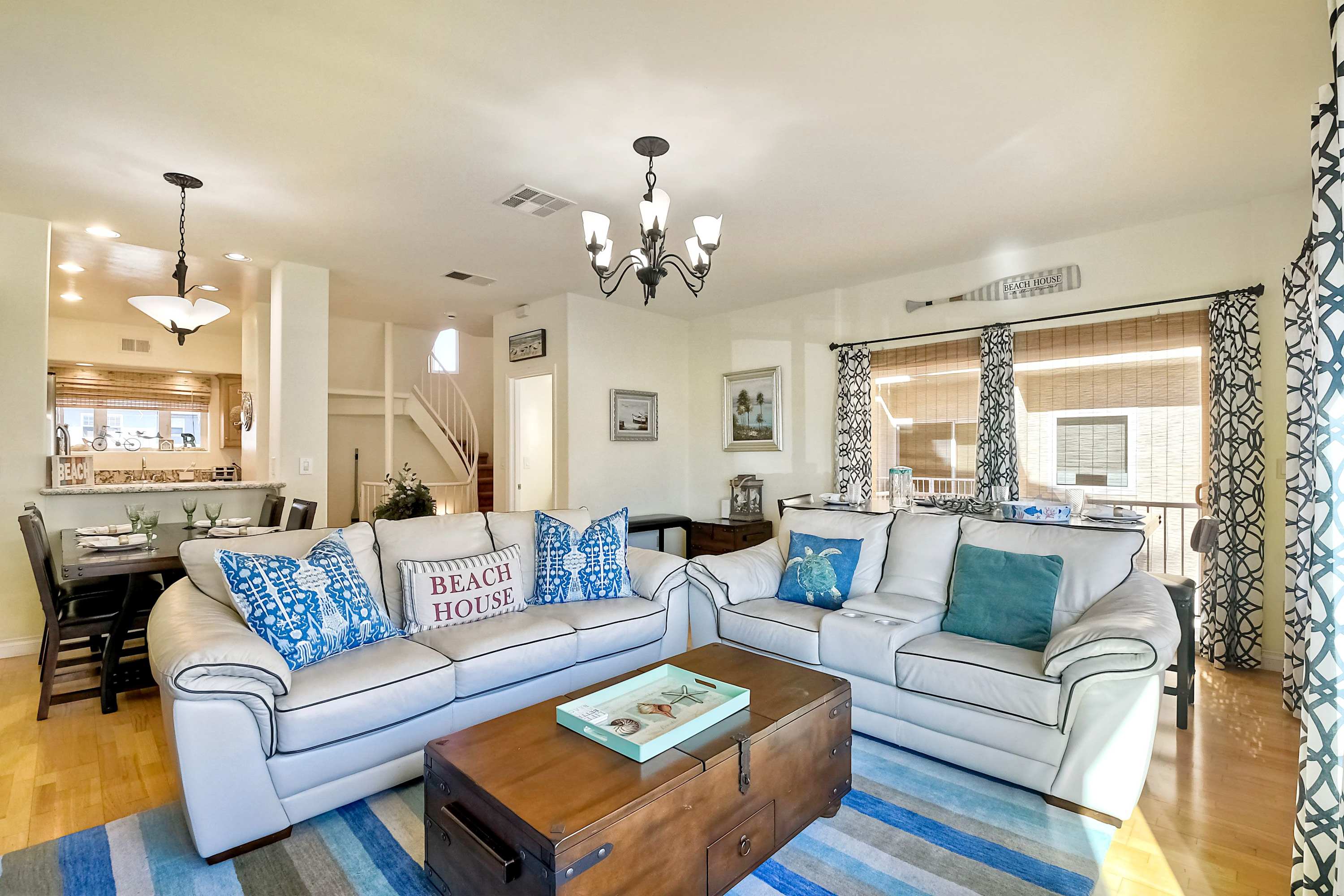 A delightful complement to the beachy atmosphere of the outdoors, the home’s bright yet cool interior will be your gateway to peace and relaxation, expertly curated with comfortable furnishings and elegant décor. Sink into plush leather sofa seating in the living room as you stream all your favorite shows and movies on the smart TV, with views of the ocean kept front and center through large picture windows. Flow with the open floorplan into the fully equipped kitchen, showcasing stainless steel appliances, glossy stone countertops, and warm wood cabinetry stocked with all the comforts of home. Two dining tables each seat 4 for mealtimes together, also ideal venues to host an energetic family game night.