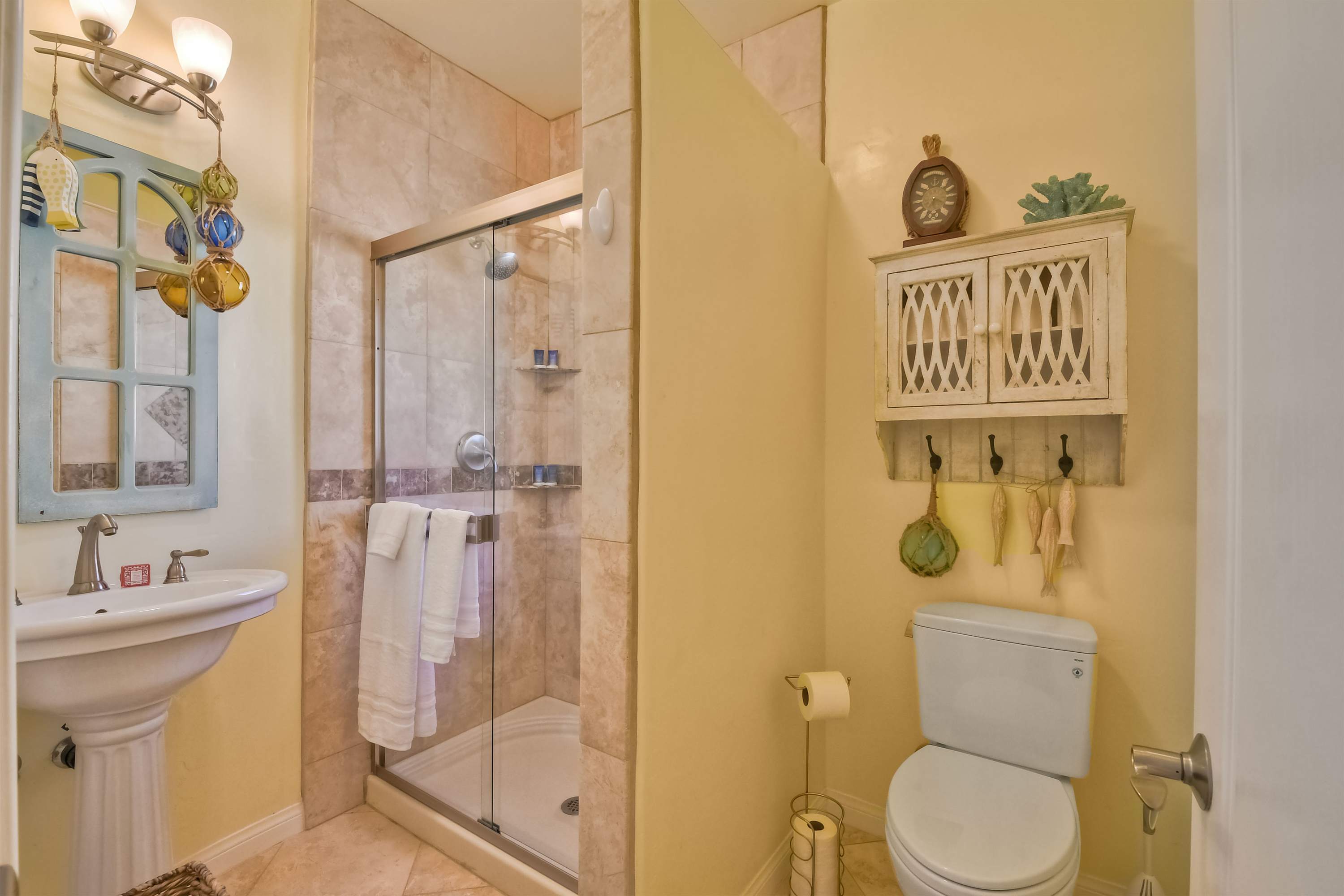 Bedroom #2 includes a king size bed and ensuite bathroom with a pedestal sink and glass walk-in shower.