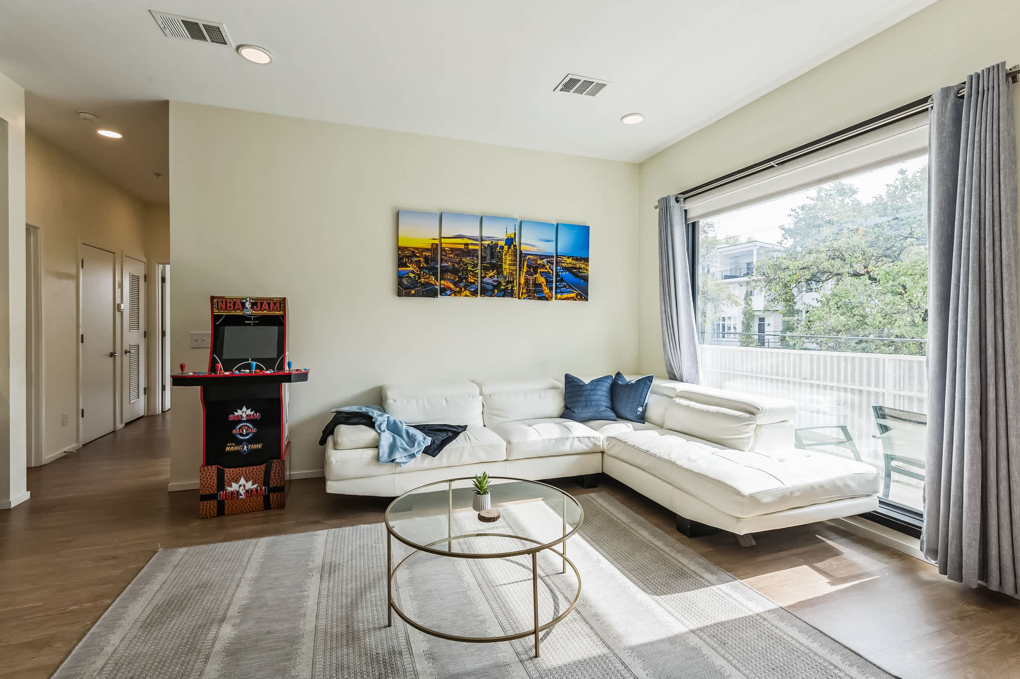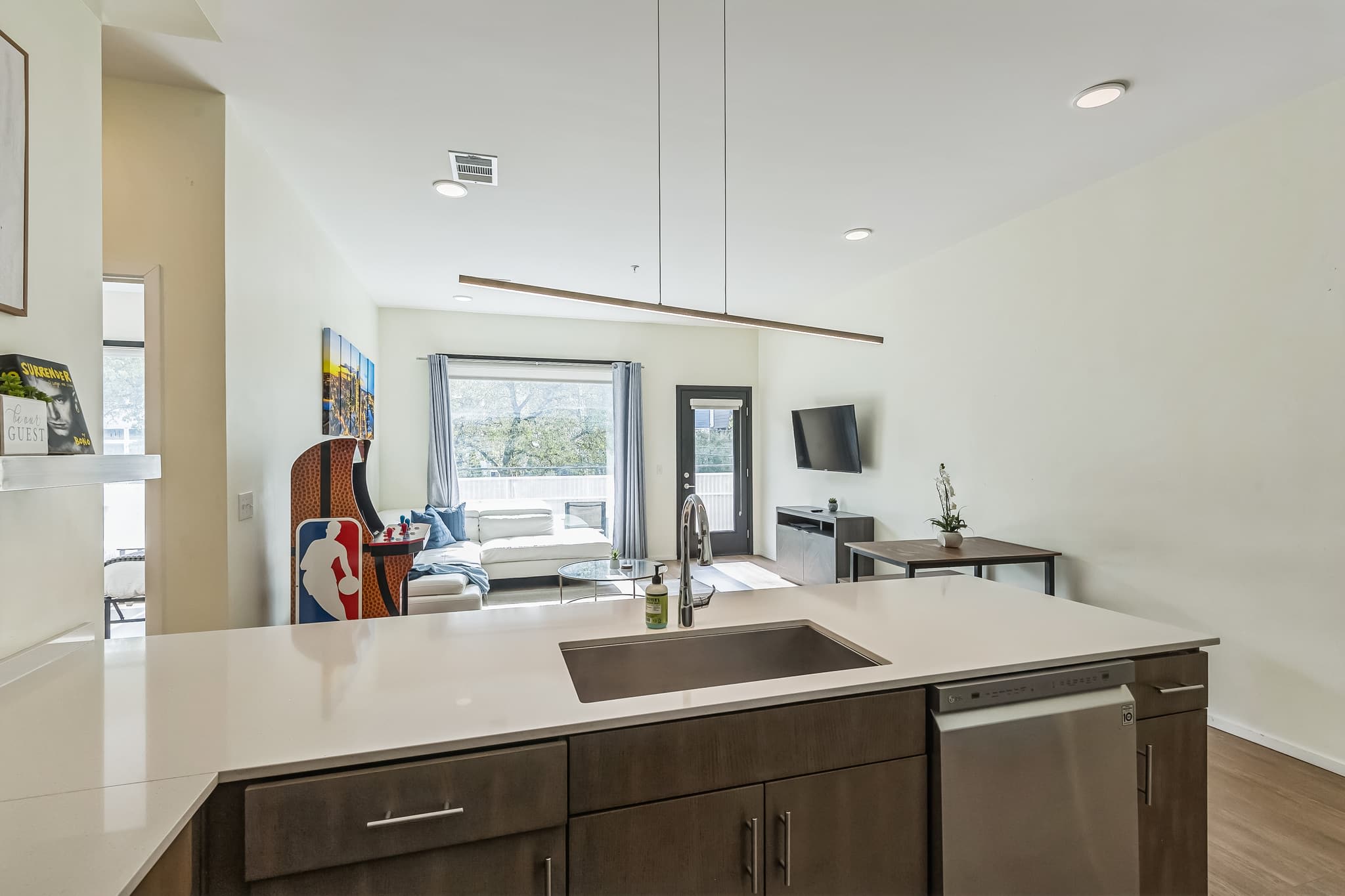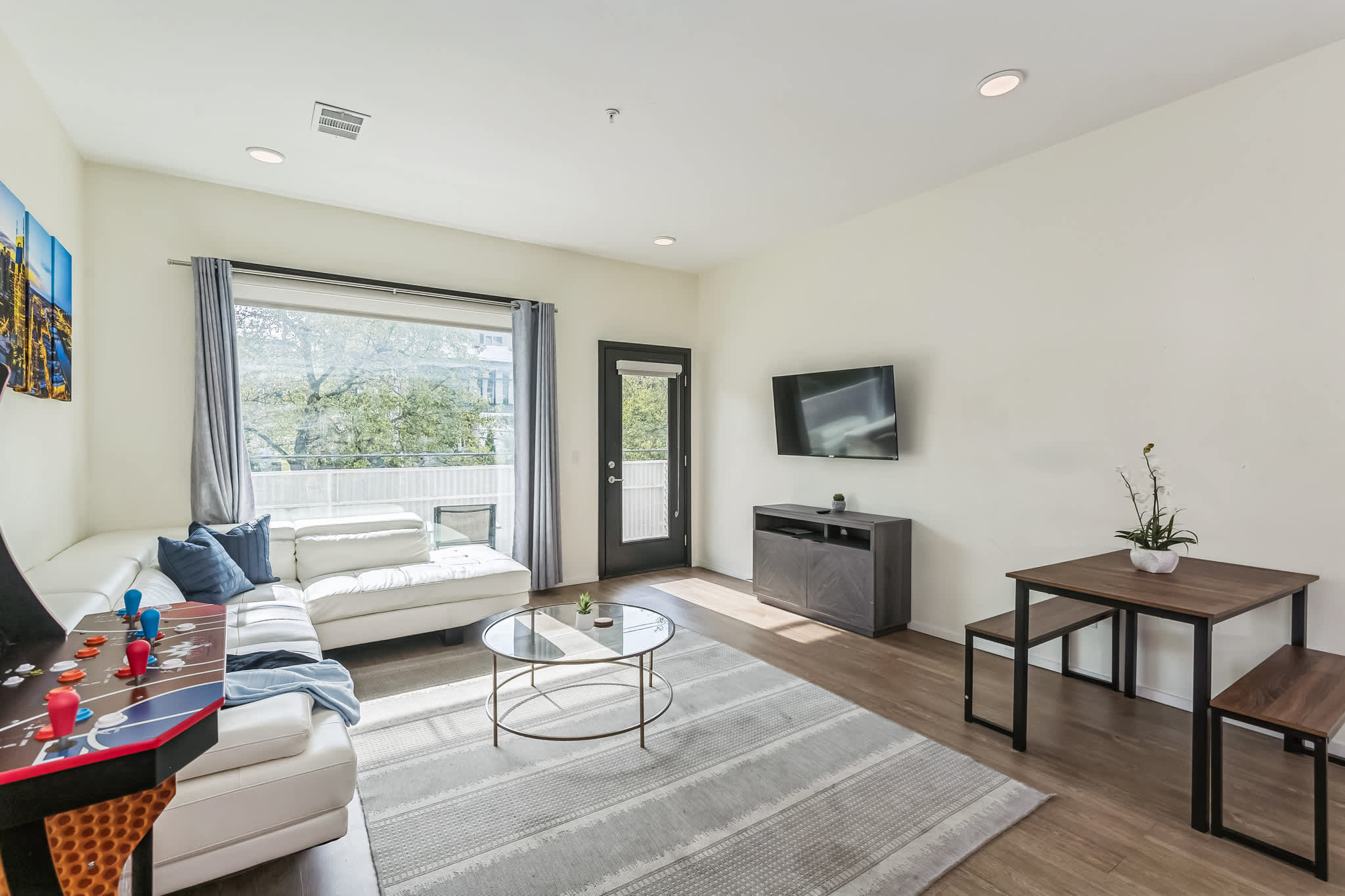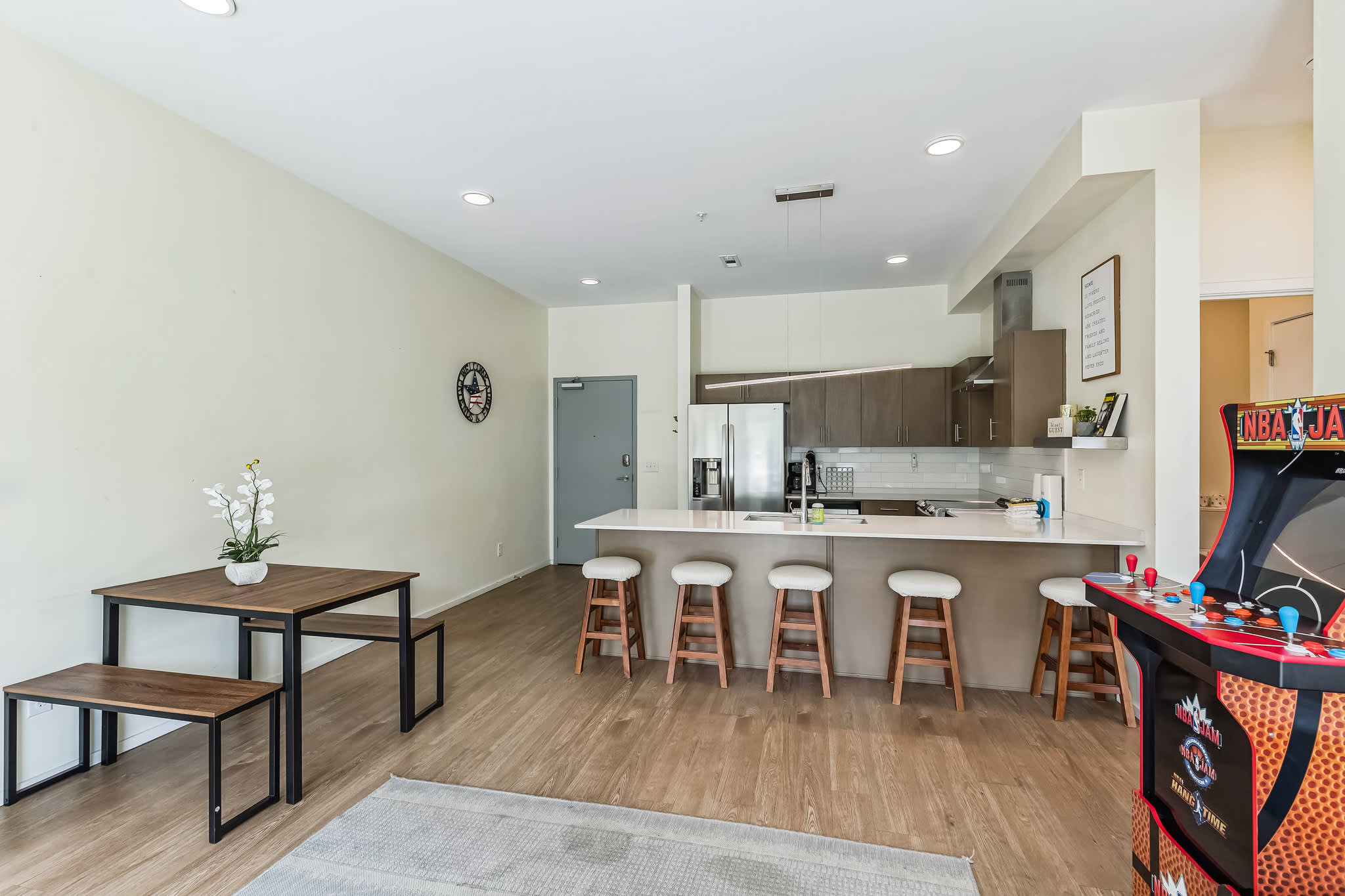 The home’s spacious interior features clean and simple design elements illuminated in bright, natural light, immersing you in both comfort and style between adventures. Sink into plush leather sofa seating in the living room while you stream new episodes of all your favorite shows on the mounted smart TV or await your turn at the standup arcade game. Step out onto the patio to enjoy those first few sips of morning coffee or indulge in an afternoon cocktail while you soak up the plentiful sunshine. Back indoors, the modern kitchen can accommodate all your mealtime needs, featuring stainless steel appliances alongside stone countertops and sleek cabinetry offering plenty of space for preparation and storage. Snag a cushy stool at the counter for quick and casual bites or have a more formal seat at the dining table with bench-style seating for 4.
