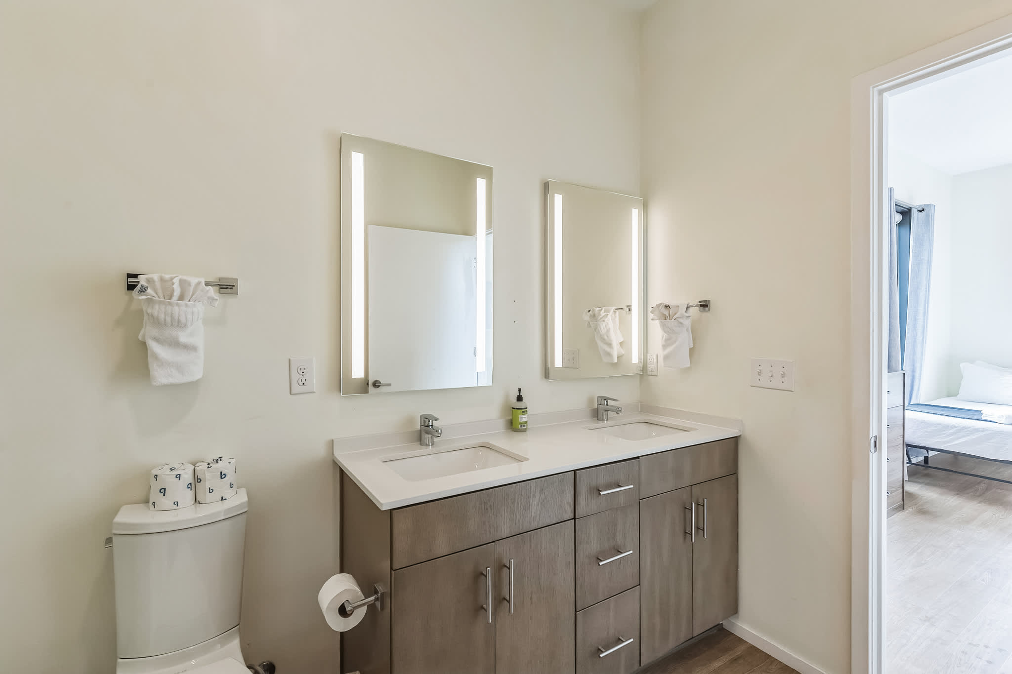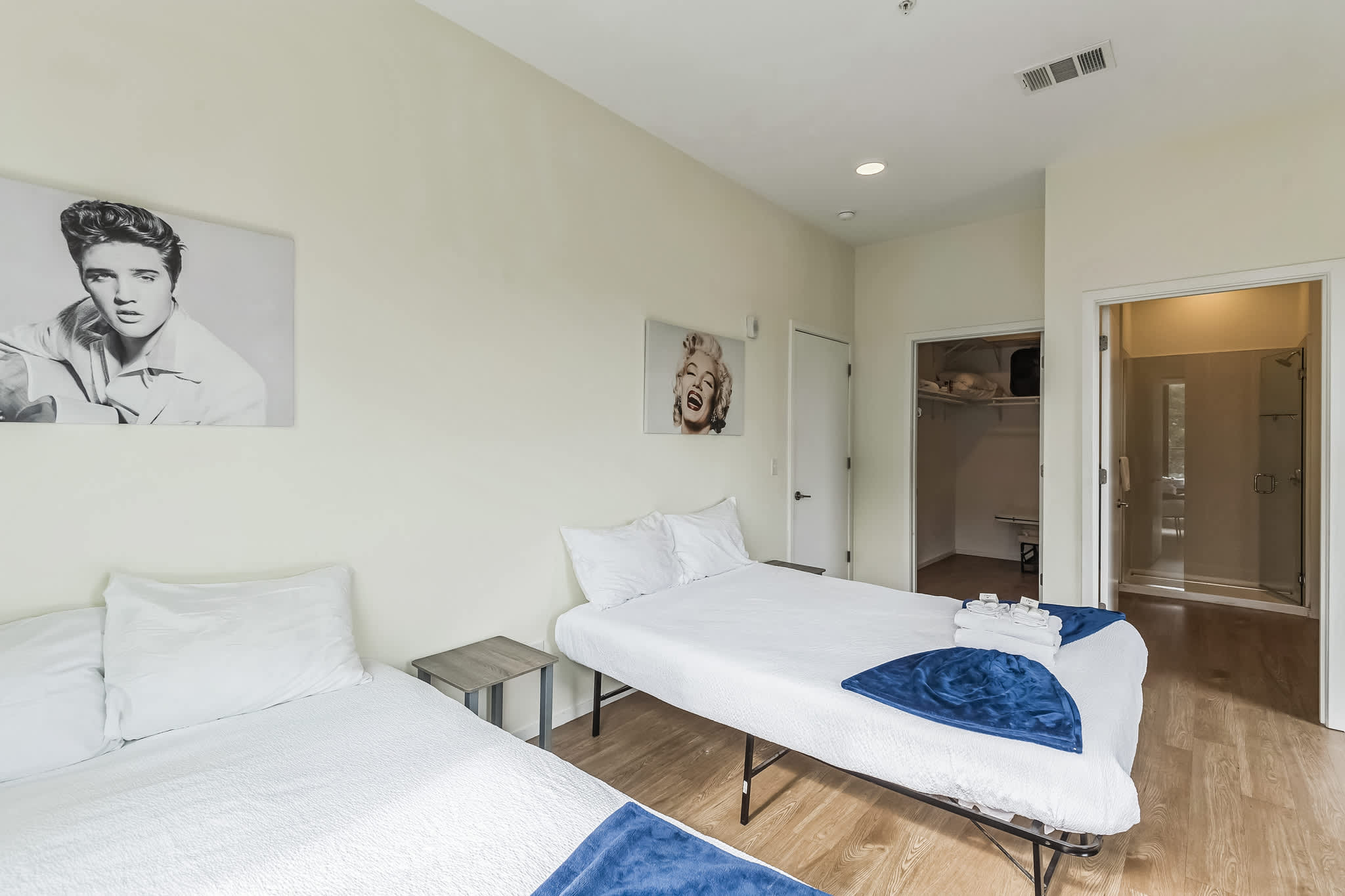 Bedroom #2 includes 2 queen size beds, a twin size bed, and an ensuite bathroom with a dual vanity and glass walk-in shower.