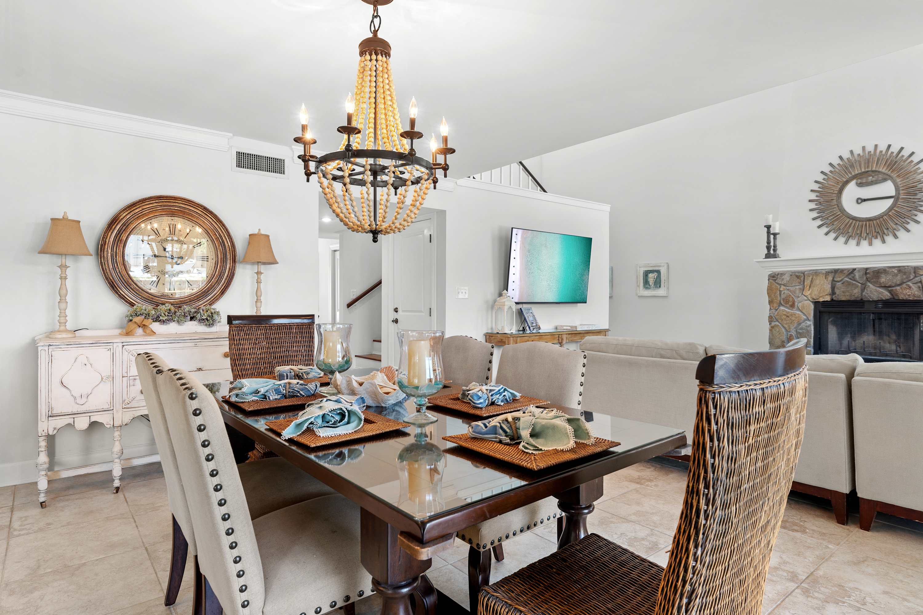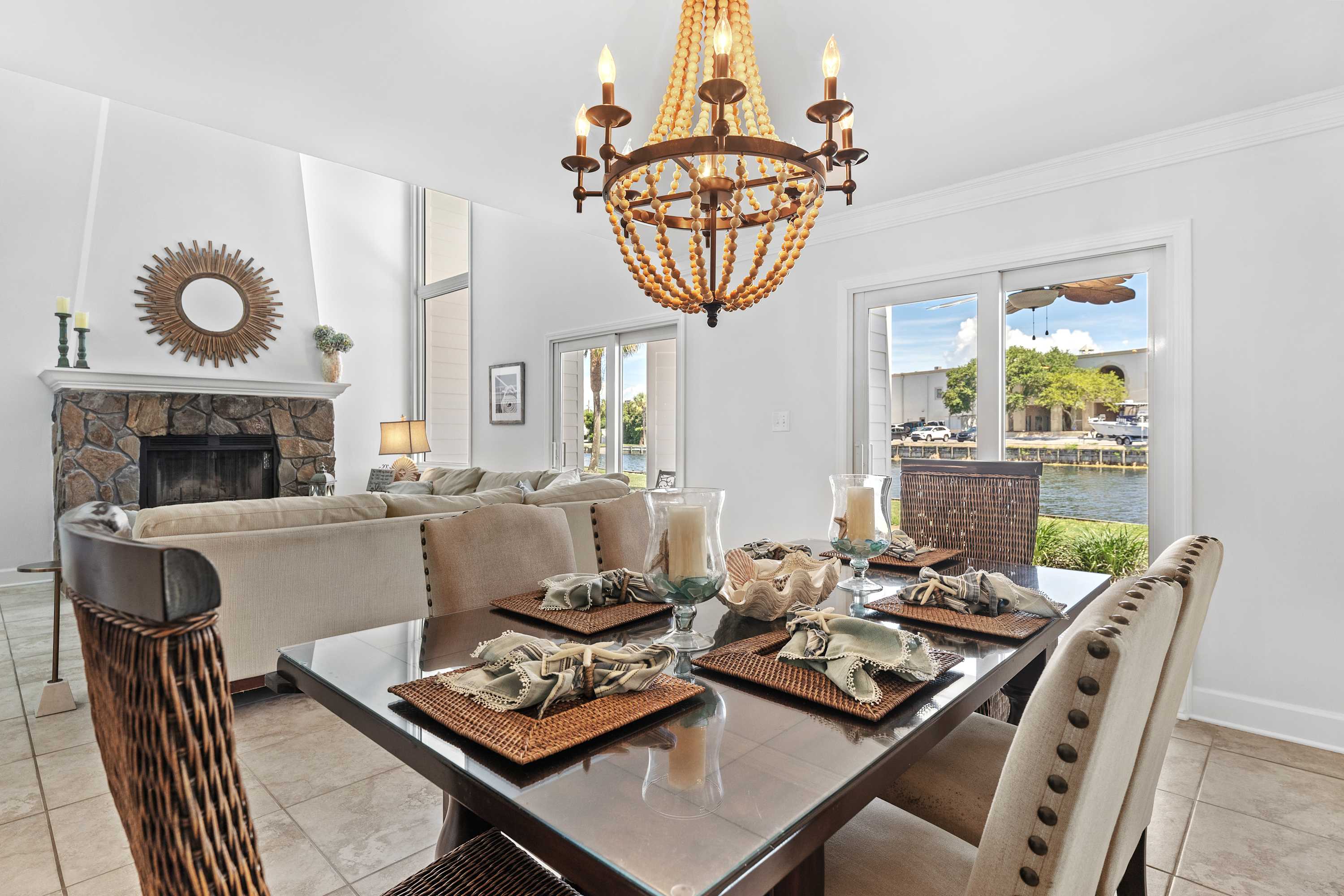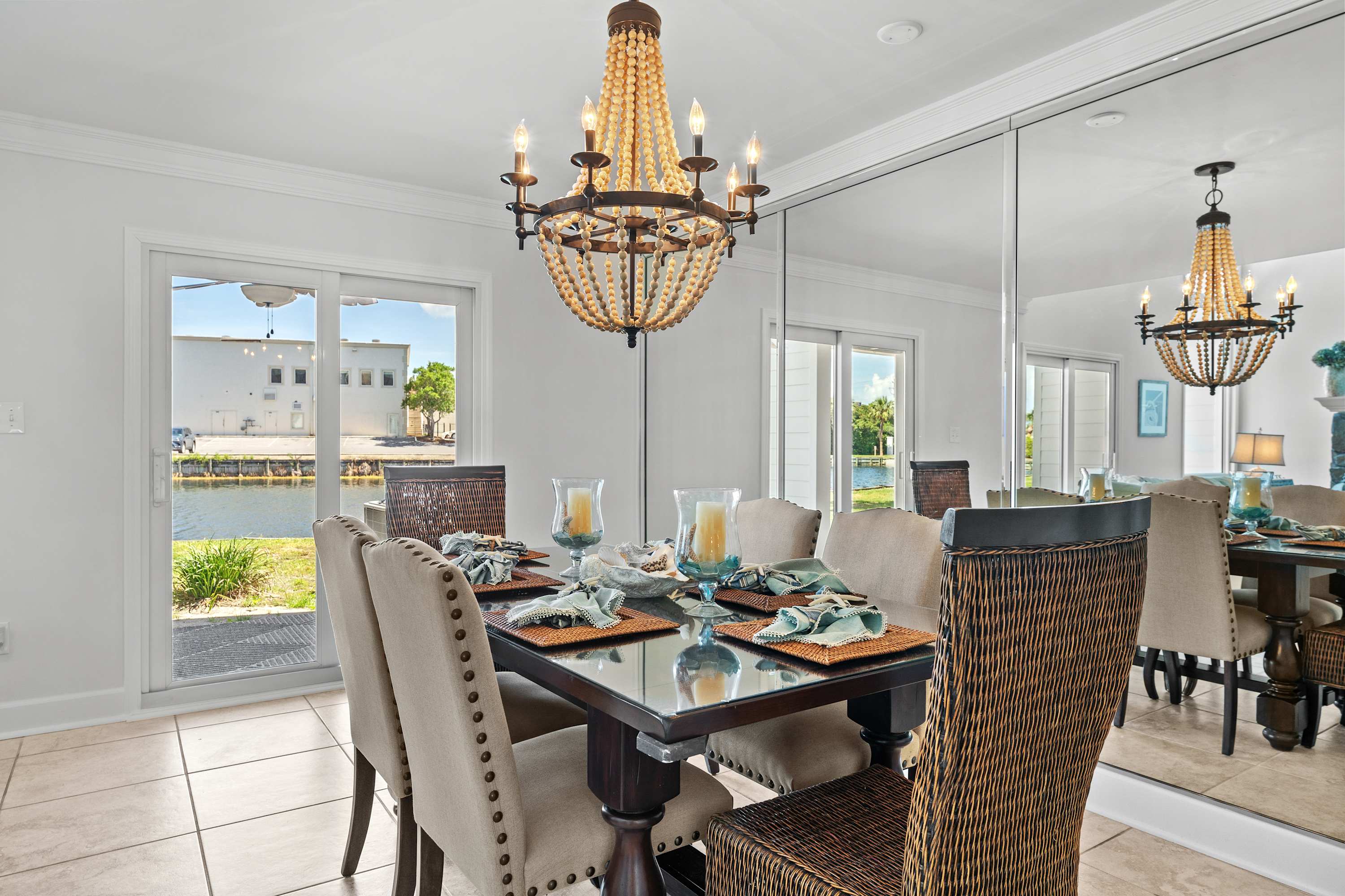 This bright dining area features a sleek glass‑top table set for six, complemented by a mix of upholstered and woven chairs for a stylish coastal touch. A statement beaded chandelier adds warmth and elegance, while large sliding doors and mirrored walls fill the space with natural light and lake views—creating the perfect setting for shared meals and relaxation.