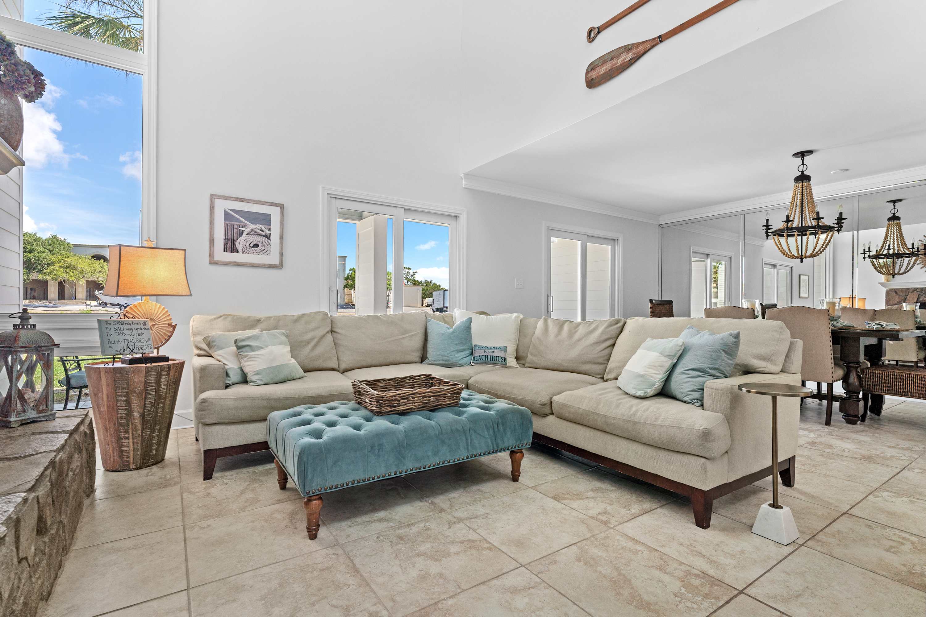 This inviting living room features a spacious sectional surrounded by coastal décor, accent pillows, and abundant natural light. Enjoy easy outdoor access, elegant lighting, and a cozy space perfect for unwinding after a day at the beach.