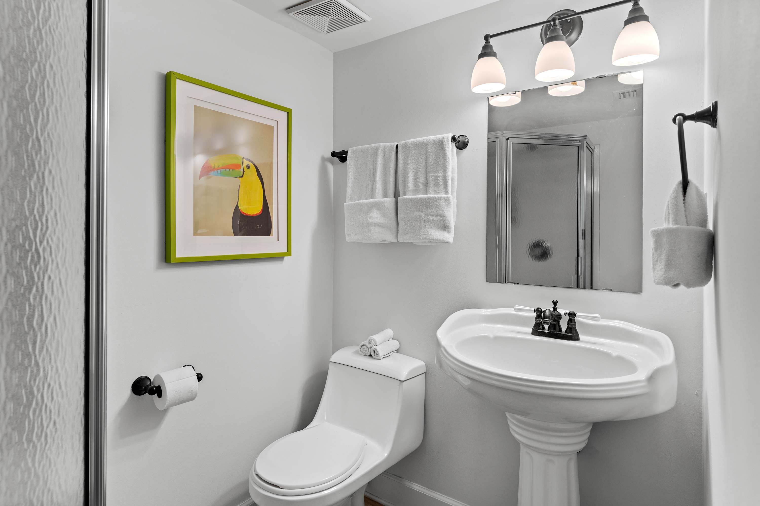 We provide a starter supply of essentials to help you settle in comfortably. In each bathroom, you’ll find travel-size body wash, body bar, shampoo, conditioner, lotion, and two rolls of toilet paper. In the kitchen, we include one sponge, one roll of paper towels, travel-size liquid dish detergent, one packet of dishwasher detergent, and two trash bags per trash can. We also provide one packet of powdered laundry detergent. For longer stays or if you need more, nearby stores make restocking easy.