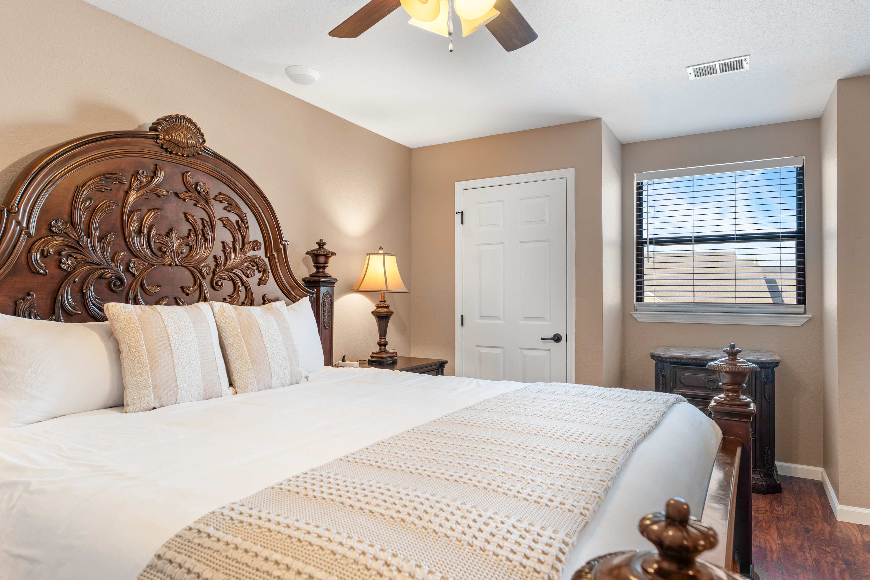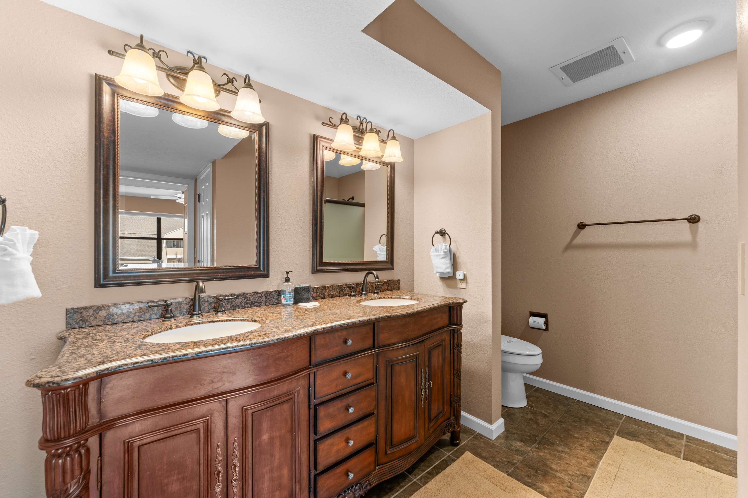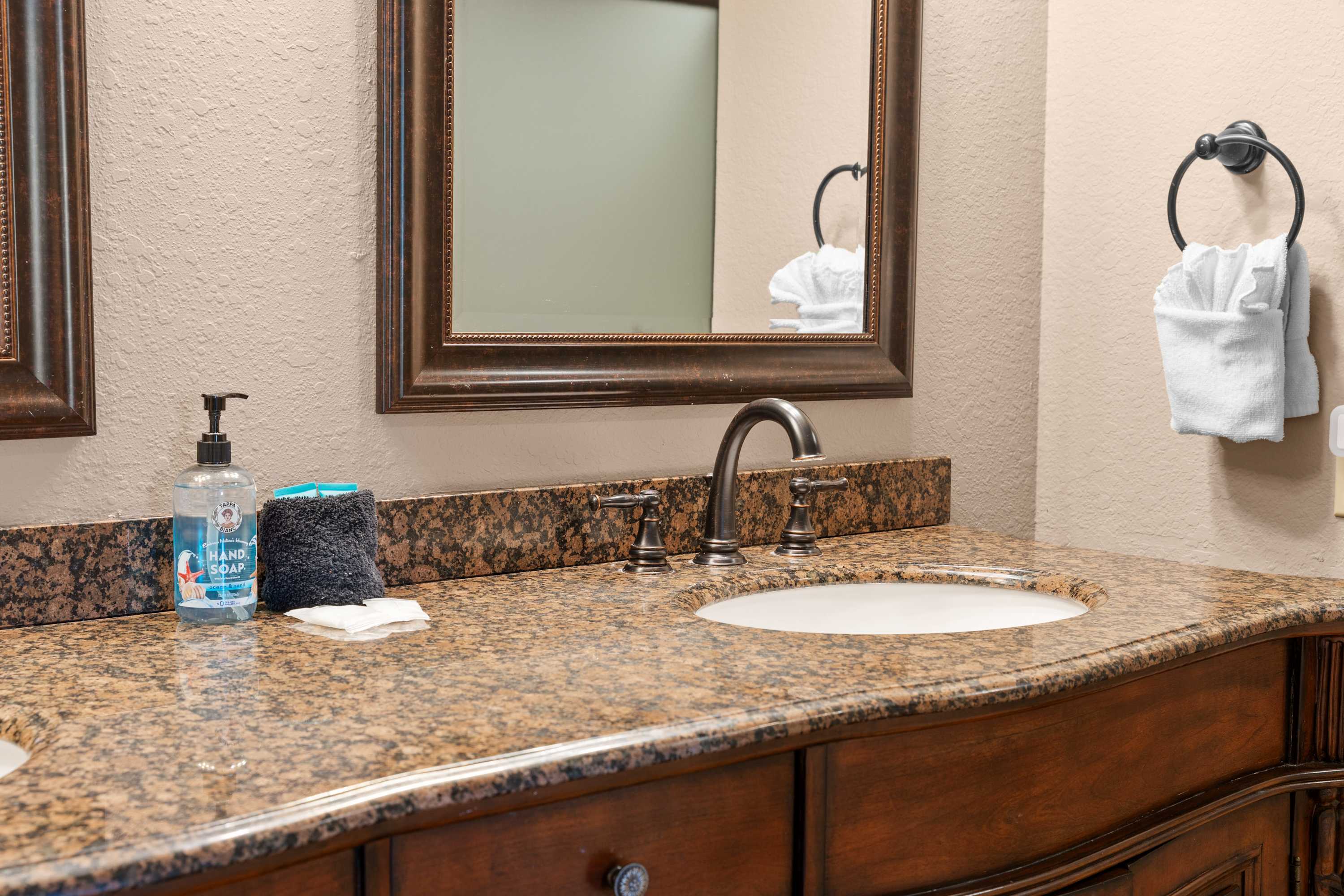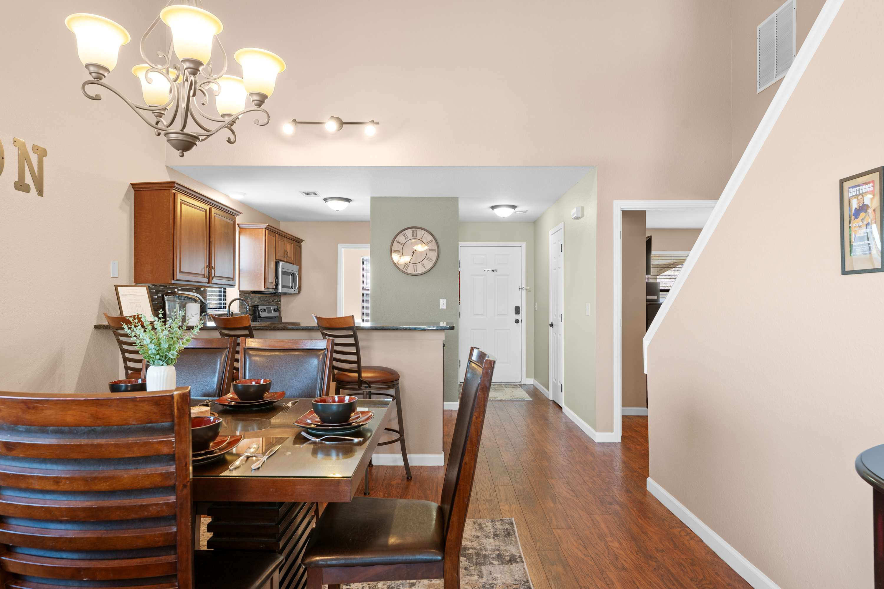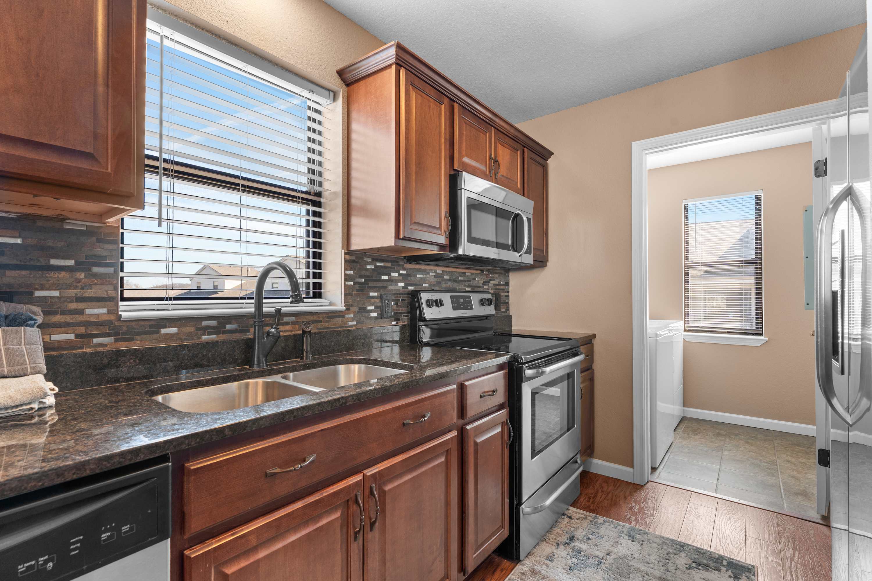 The home’s elegant interior welcomes you home, where comfort meets style in spaces designed to help you unwind while you connect with loved ones. Curl up on plush living room sofa seating while you surf the channels or queue up the big game on the mounted TV. The inset fireplace is as much form as it is function, offering warmth and ambiance in the cooler months. The fully equipped kitchen can accommodate all your mealtime needs, with stainless steel appliances, glossy stone countertops, and warm wood cabinetry stocked with all the comforts of home. Gather together at the dining table for formal meals or to set up what will soon become a competitive family game night.