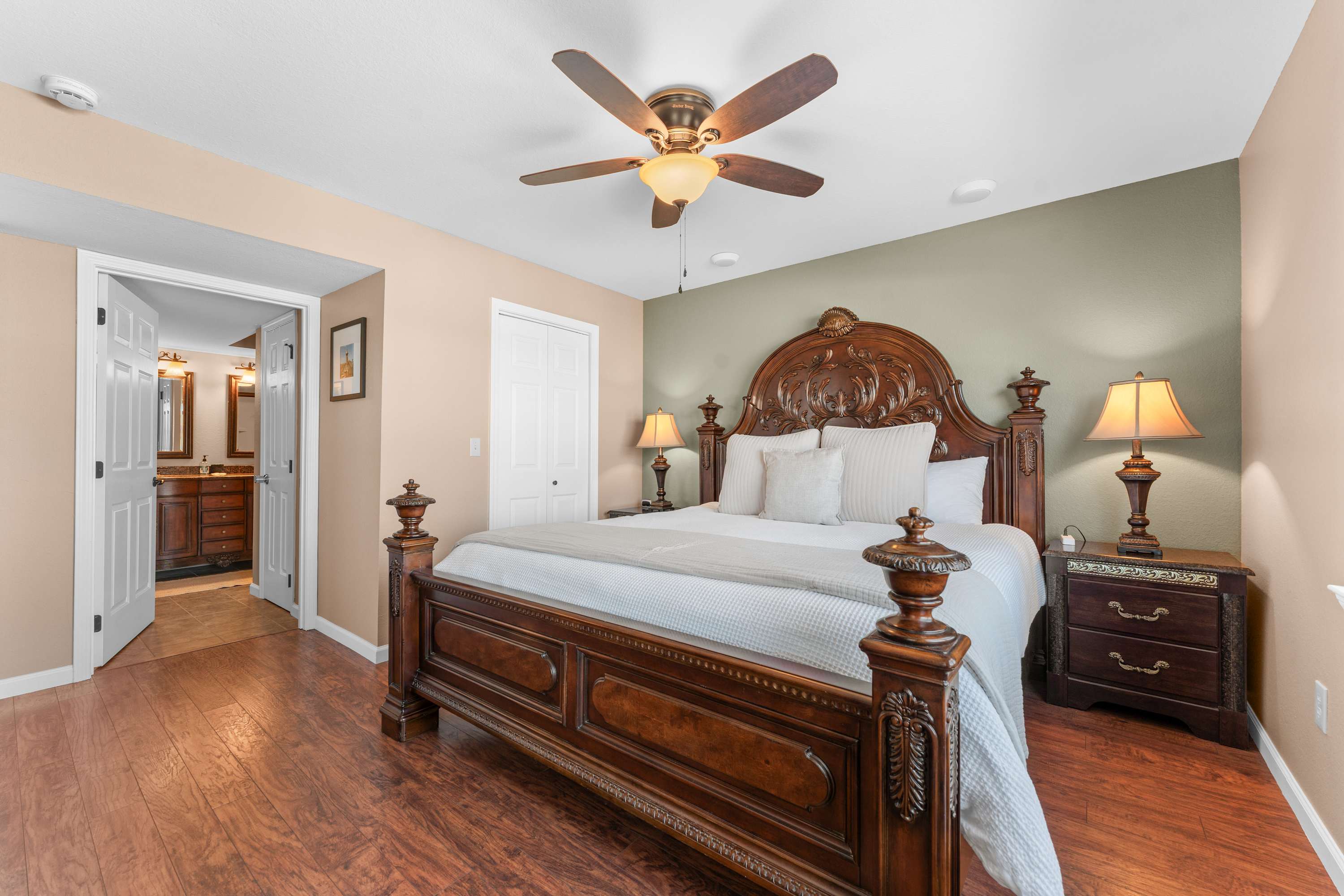 Bedroom #1 includes a king-size bed, smart TV, and ensuite bathroom with a walk-in shower.