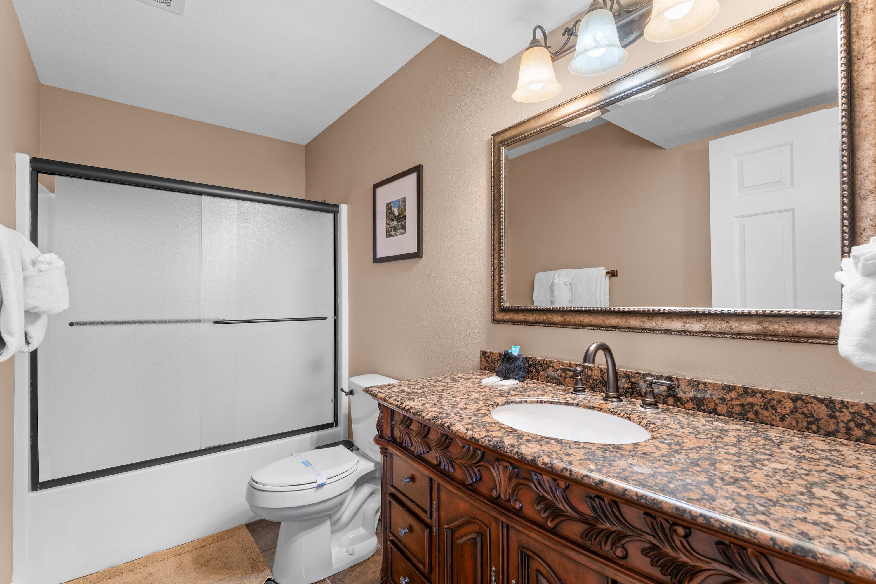 Bedroom #3 includes a queen-size bed, smart TV, and ensuite bathroom with a shower/tub combo.