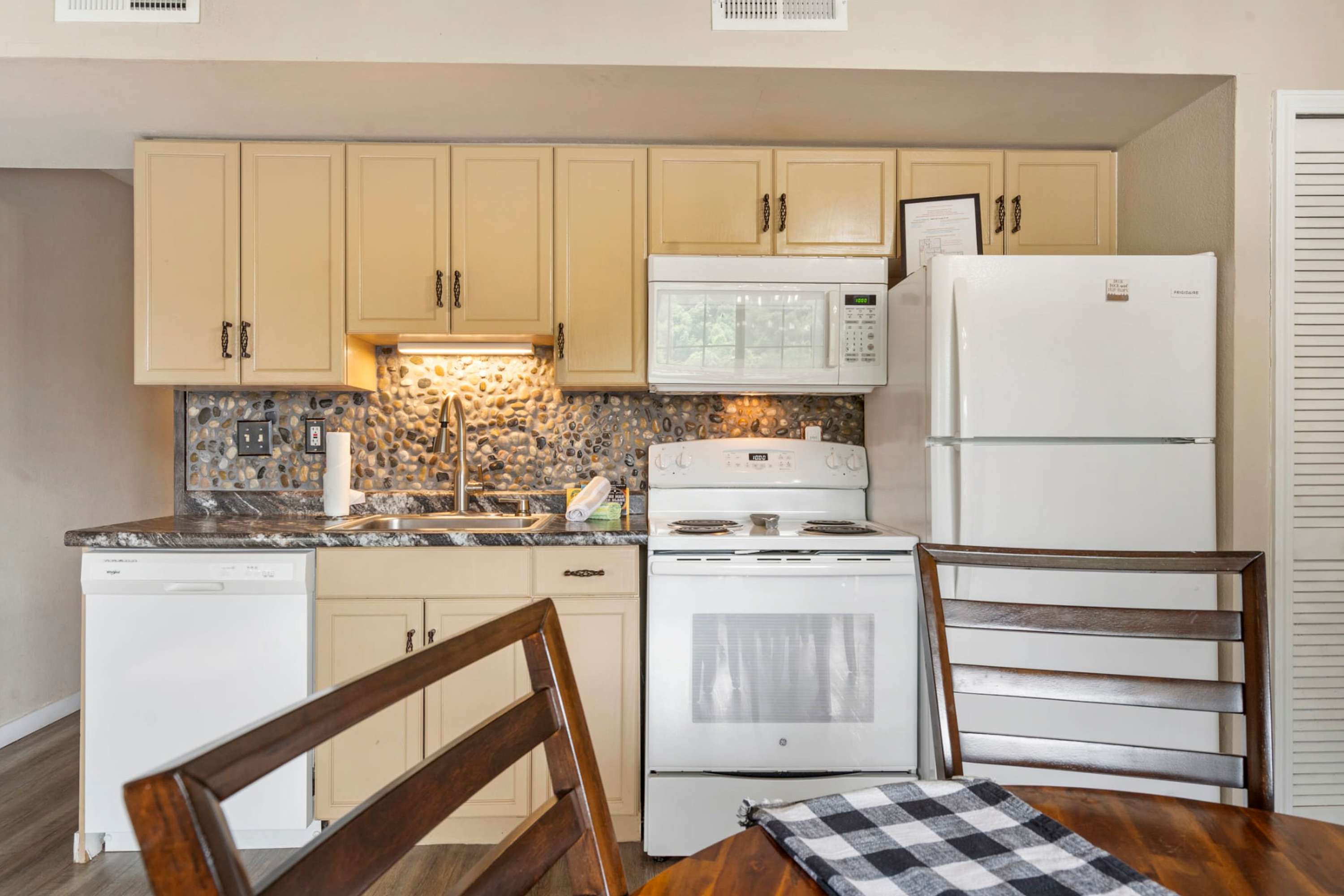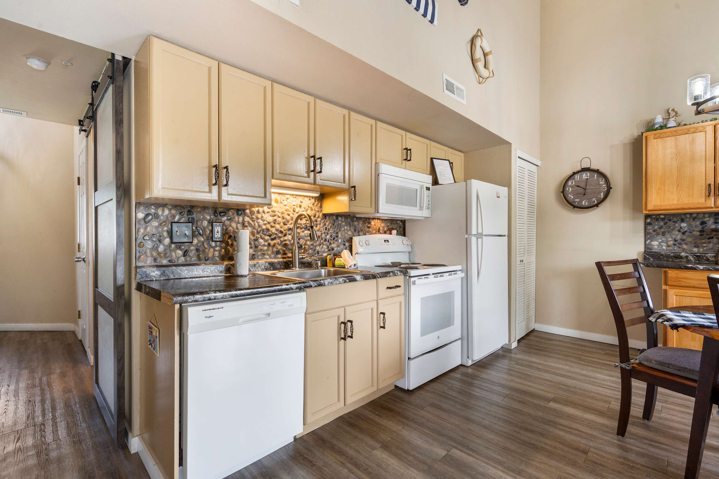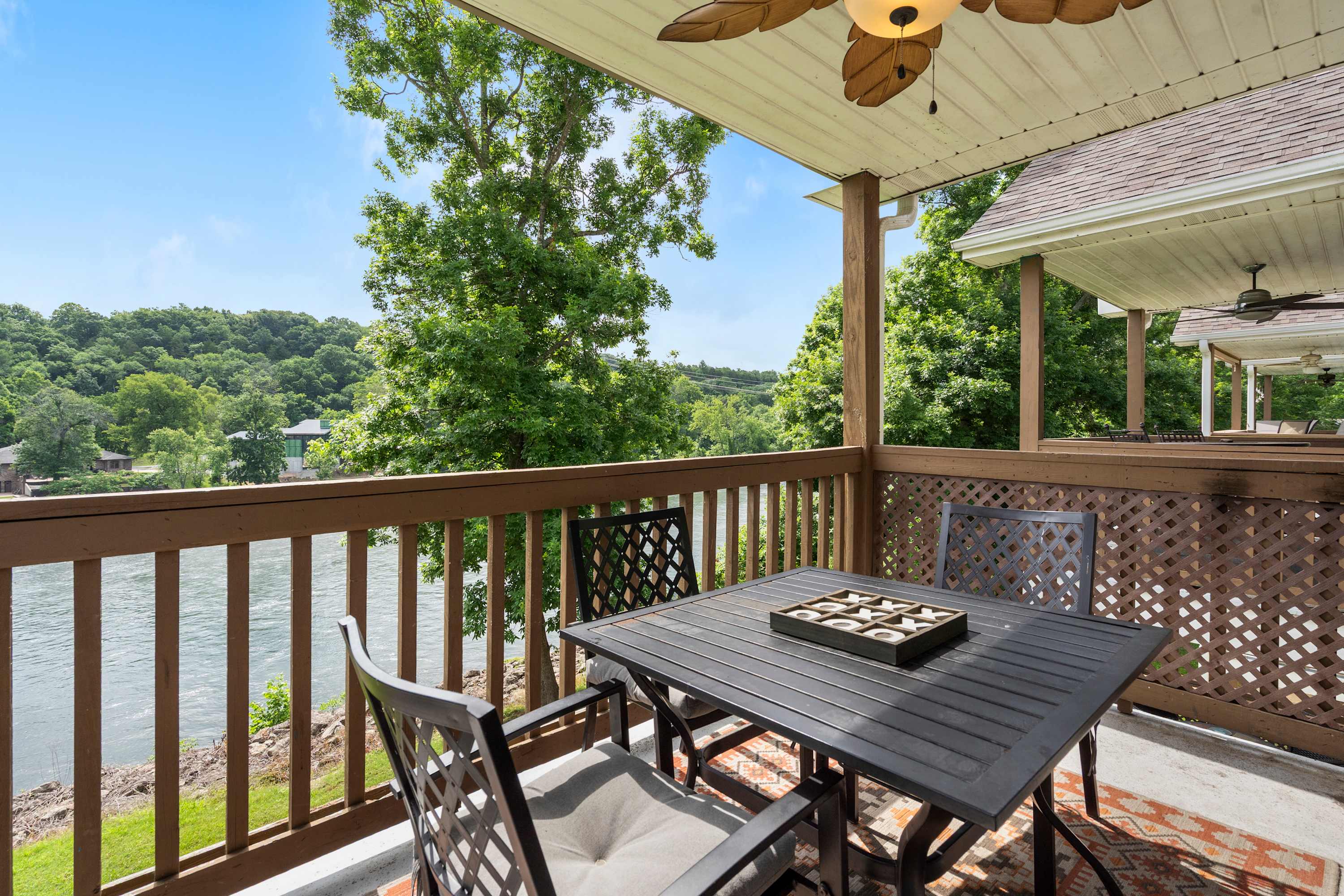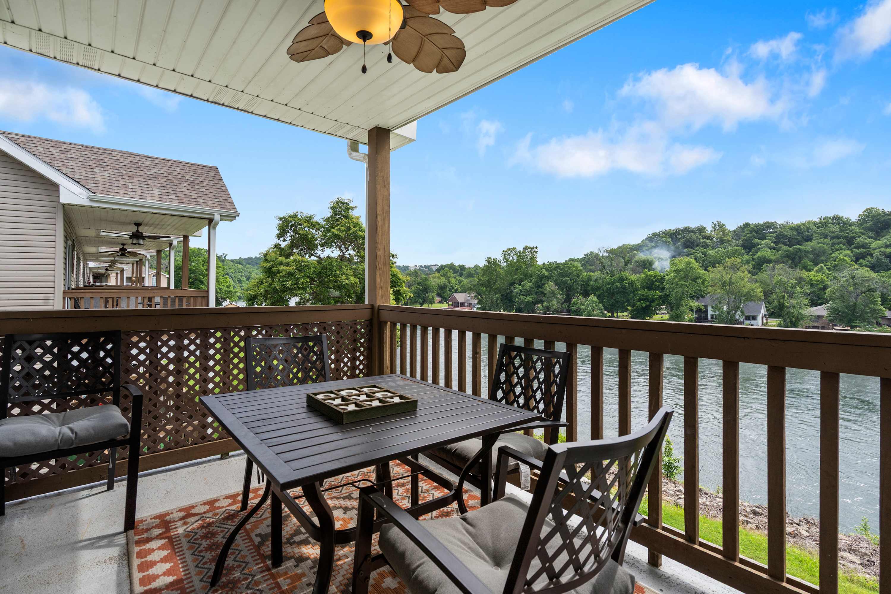 Begin your mornings out on the home’s spacious balcony, enjoying your fresh cup of coffee with breakfast while you soak up the sights and sounds of the gently flowing river. As you head indoors to get ready for the day, take in the soaring vaulted ceilings, enhancing the openness of the main area as well as the abundance of natural light. A comfortable sofa allows you to unwind after busy days exploring, settling in to stream all your favorite shows on the mounted smart TV. The kitchen comes fully equipped for all mealtime endeavors whether you prefer to prepare homecooked meals or simply unpack takeout from a local restaurant. The circular dining table keeps you well connected during mealtime, seating 4 for snacks and formal meals alike.