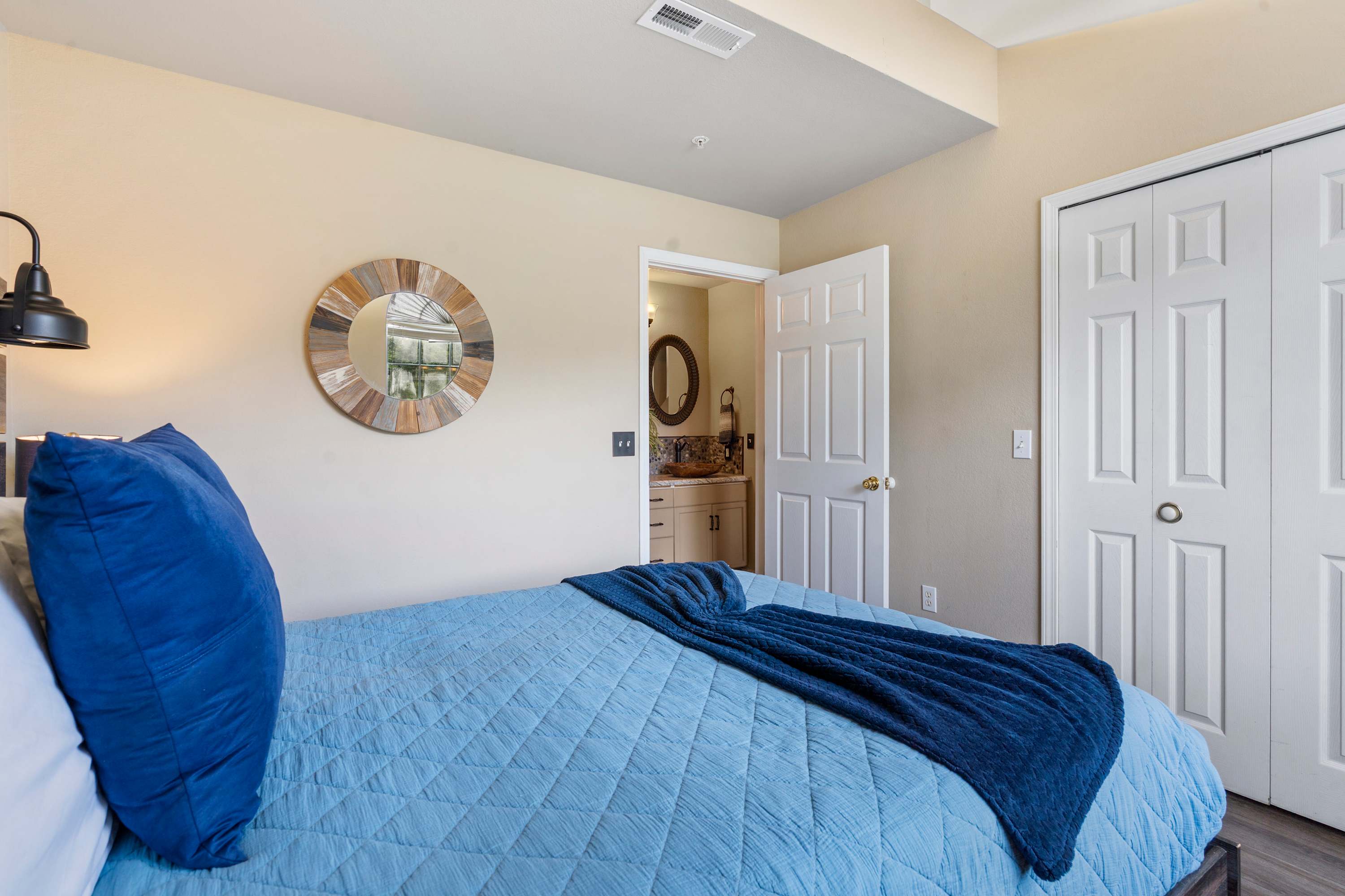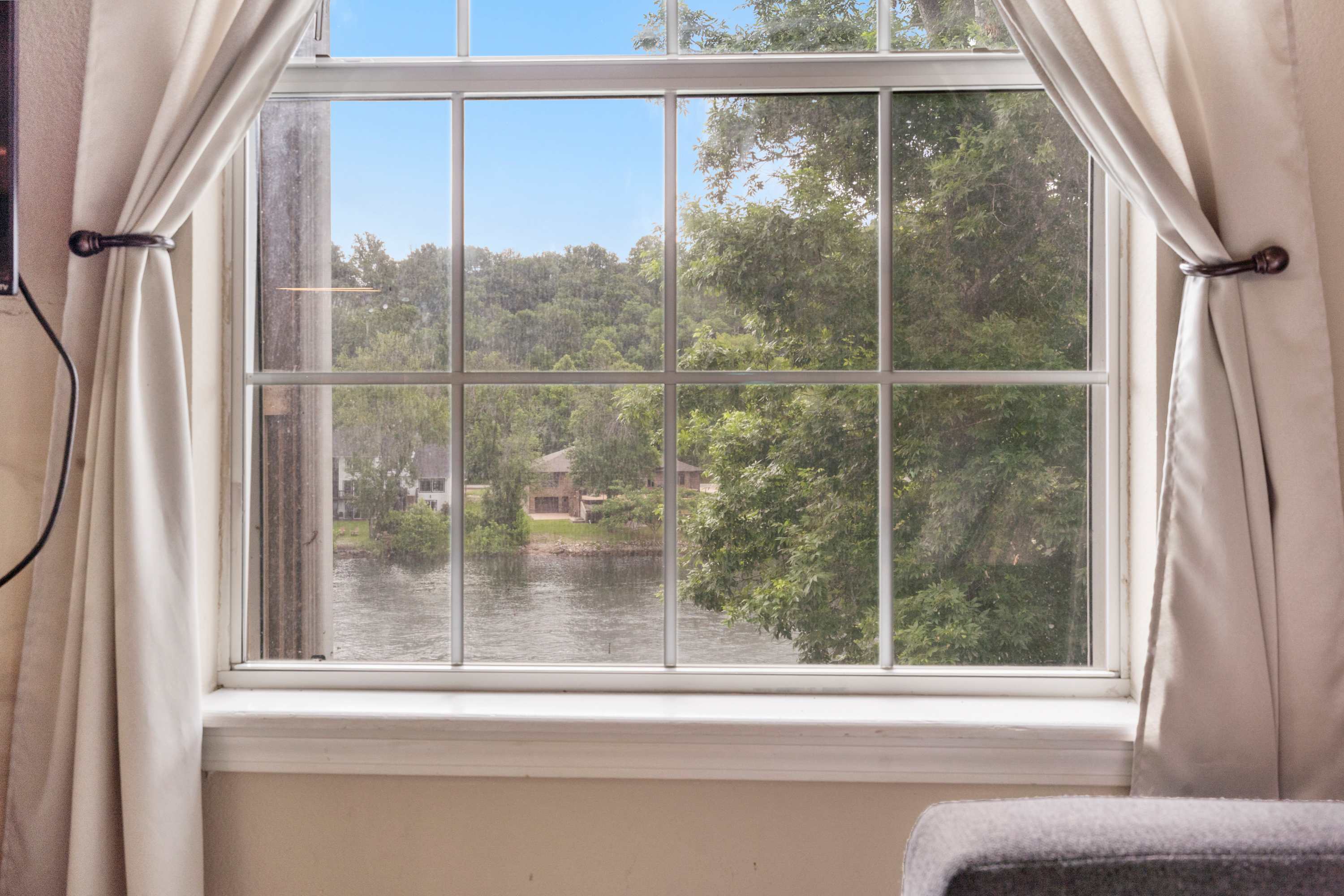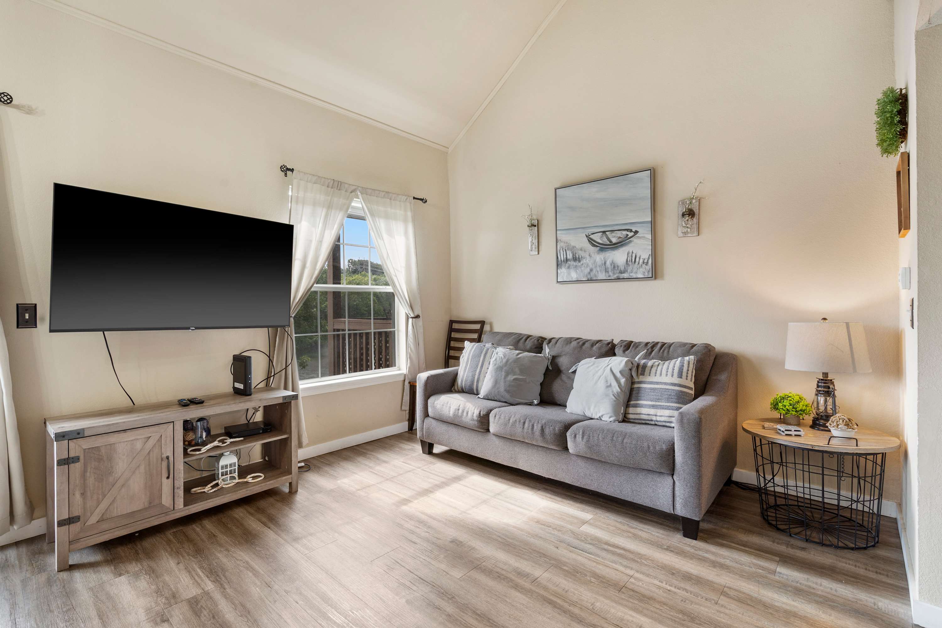Begin your mornings out on the home’s spacious balcony, enjoying your fresh cup of coffee with breakfast while you soak up the sights and sounds of the gently flowing river. As you head indoors to get ready for the day, take in the soaring vaulted ceilings, enhancing the openness of the main area as well as the abundance of natural light. A comfortable sofa allows you to unwind after busy days exploring, settling in to stream all your favorite shows on the mounted smart TV. The kitchen comes fully equipped for all mealtime endeavors whether you prefer to prepare homecooked meals or simply unpack takeout from a local restaurant. The circular dining table keeps you well connected during mealtime, seating 4 for snacks and formal meals alike.