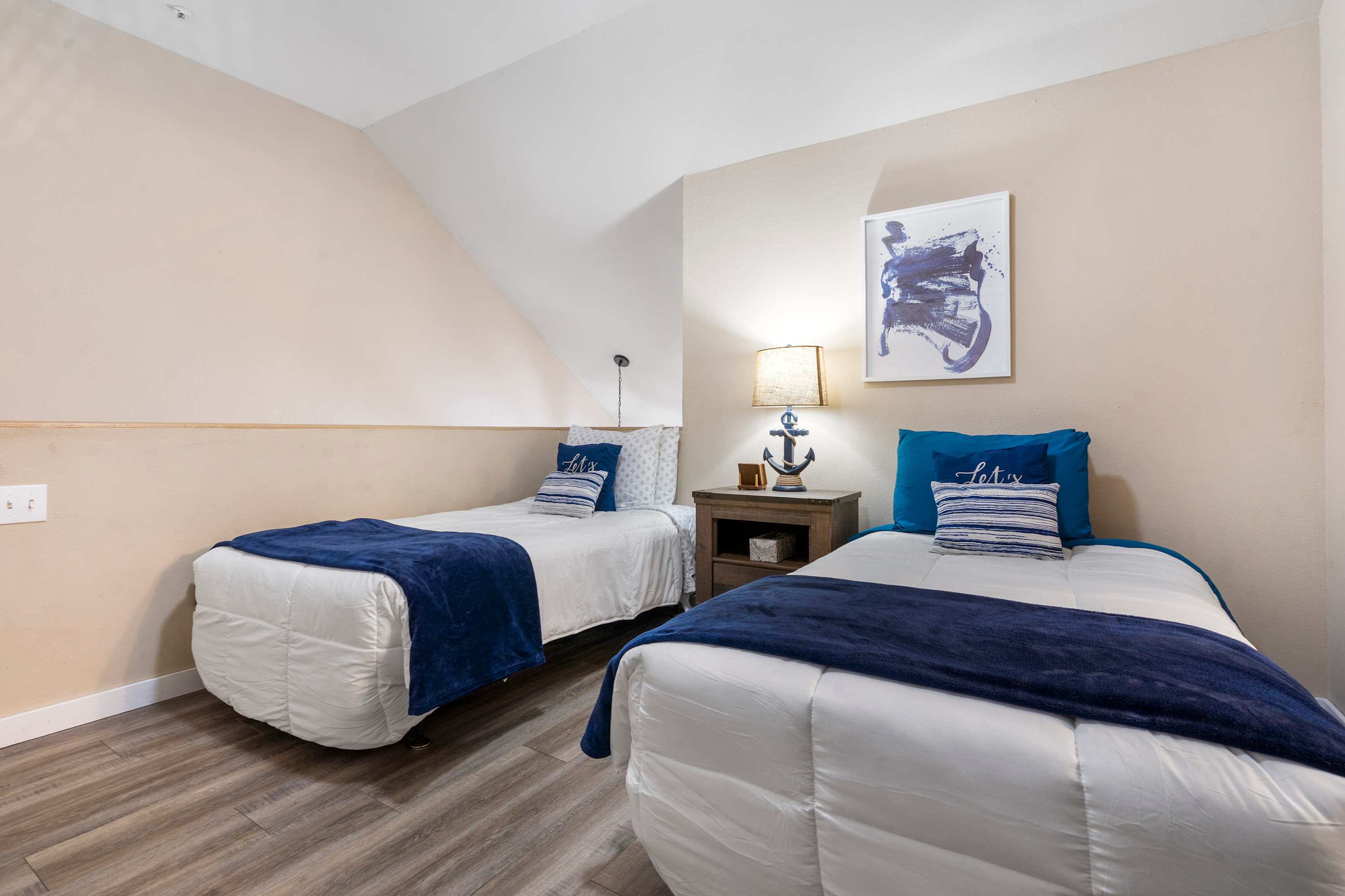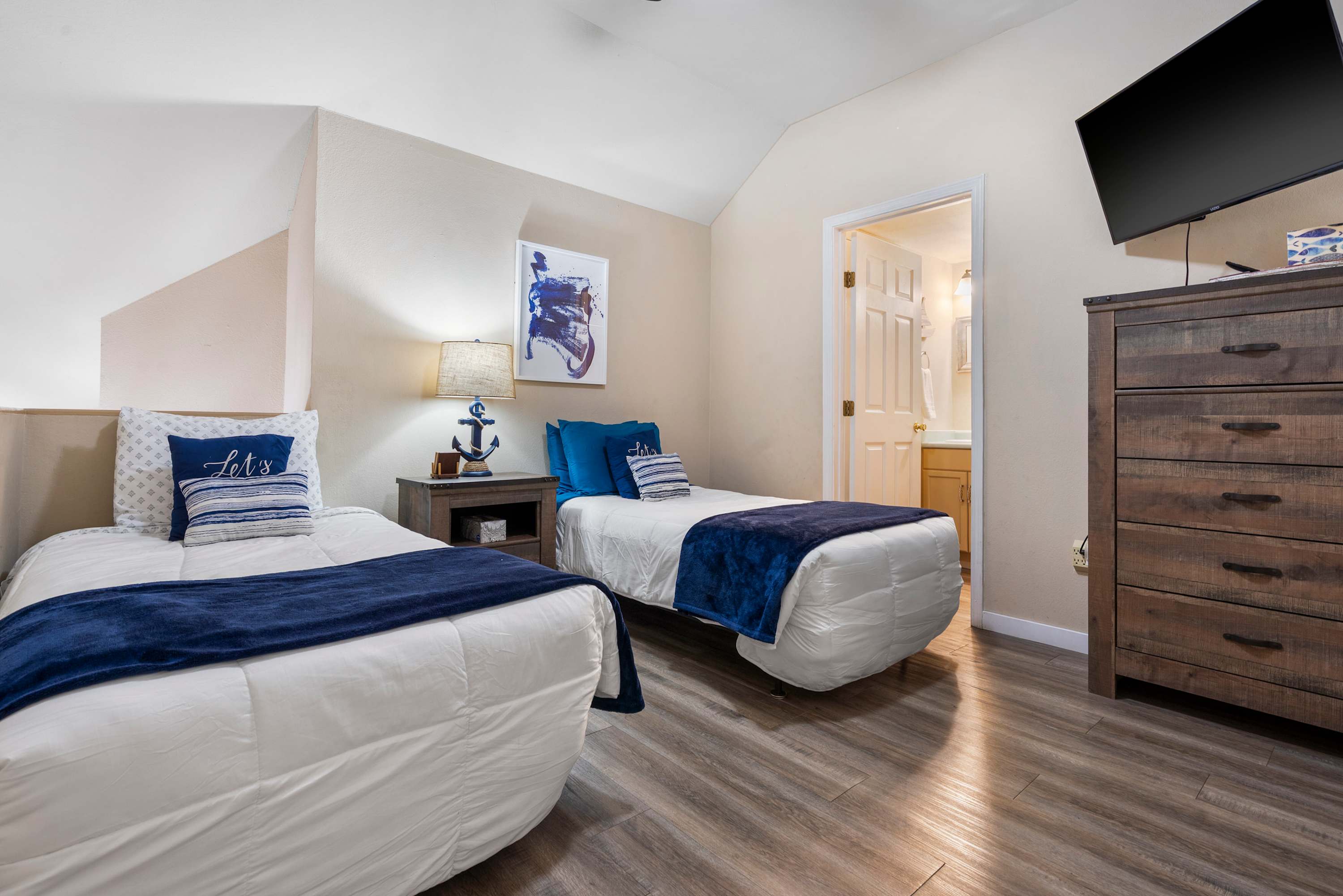 Bedroom #2 is a loft bedroom that includes 2 twin size beds, a TV, and an ensuite bathroom with a single vanity and shower/tub combo.
