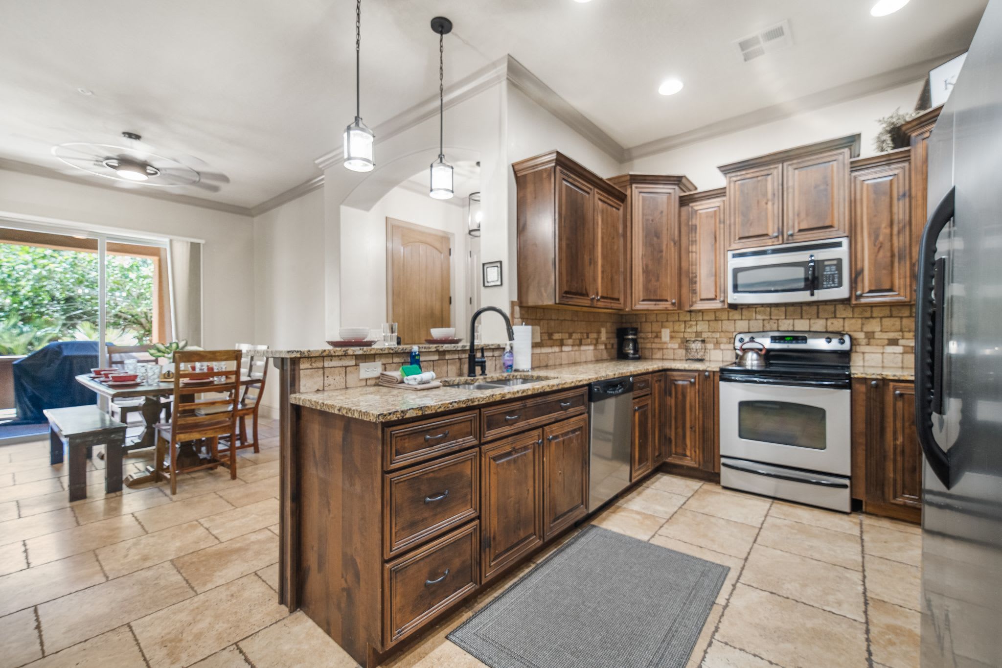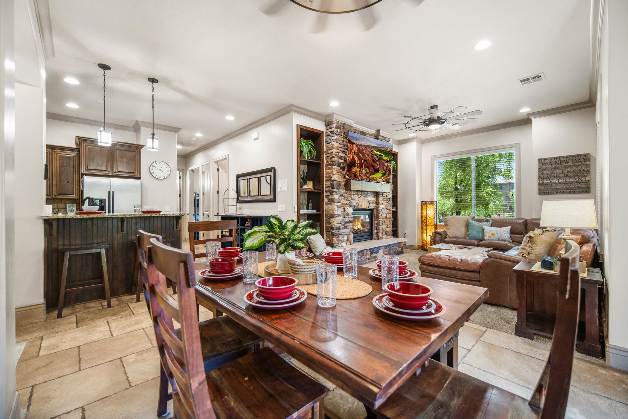 The home’s spacious balcony provides a scenic space for relaxation, whether you’re grilling up your afternoon meal or enjoying an evening cocktail under the stars in front of the outdoor fireplace. A table and chairs set can accommodate 6 whether you choose to dine al fresco or enjoy a game of cards in the fresh, open air. Stepping indoors through the sliding glass doors, you’ll find a more formal dining room with seating for 7. The chef-inspired kitchen, just steps away, features stainless steel appliances amongst rich cabinetry and countertops, providing all the cookware and dining ware necessary for preparing delicious home cooked meals. When you’re ready to wind down for the evening, the inviting living room with plush leather sofa seating, smart TV, and electric fireplace is the perfect place to do so. A welcome space for both entertainment and relaxation, you’ll quickly find yourself without a care in the world, well-rested for another amazing day in nature’s wonderland.