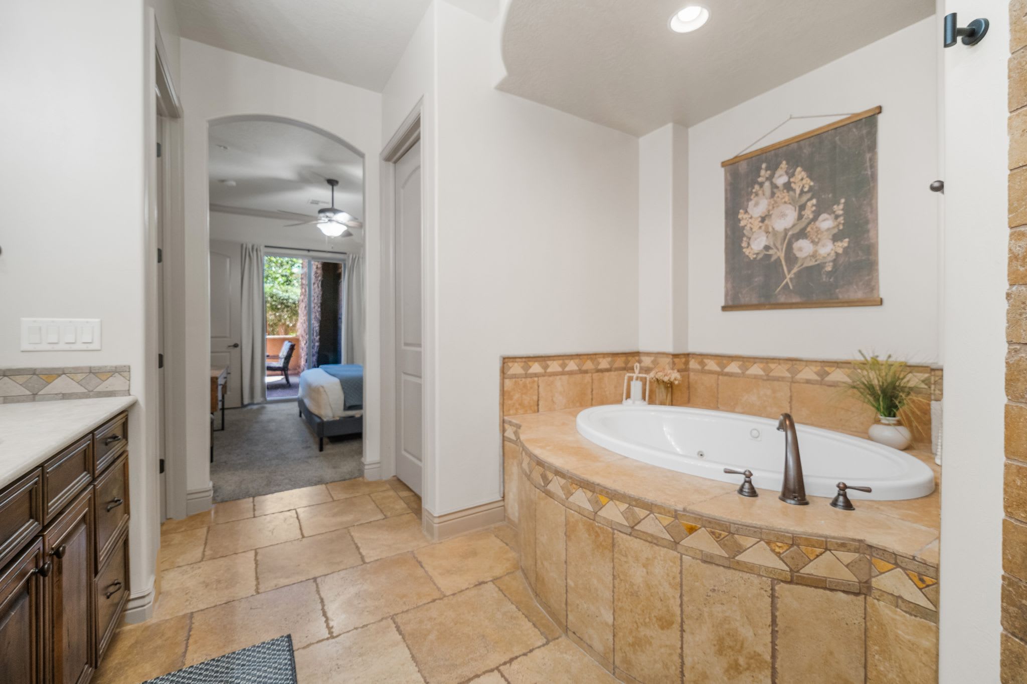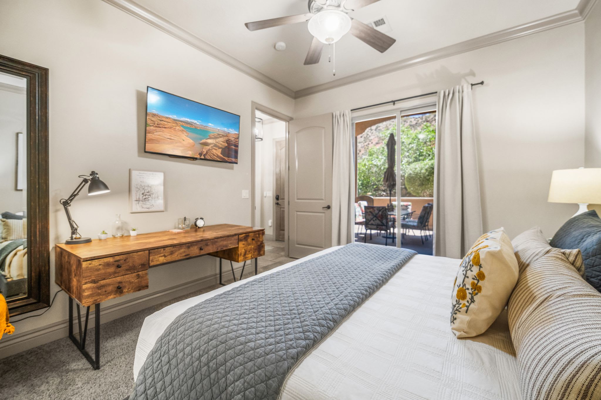 Bedroom #1 includes a king size bed, smart TV, patio access, and ensuite bathroom with a dual vanity and separate walk-in shower and spa bathtub.