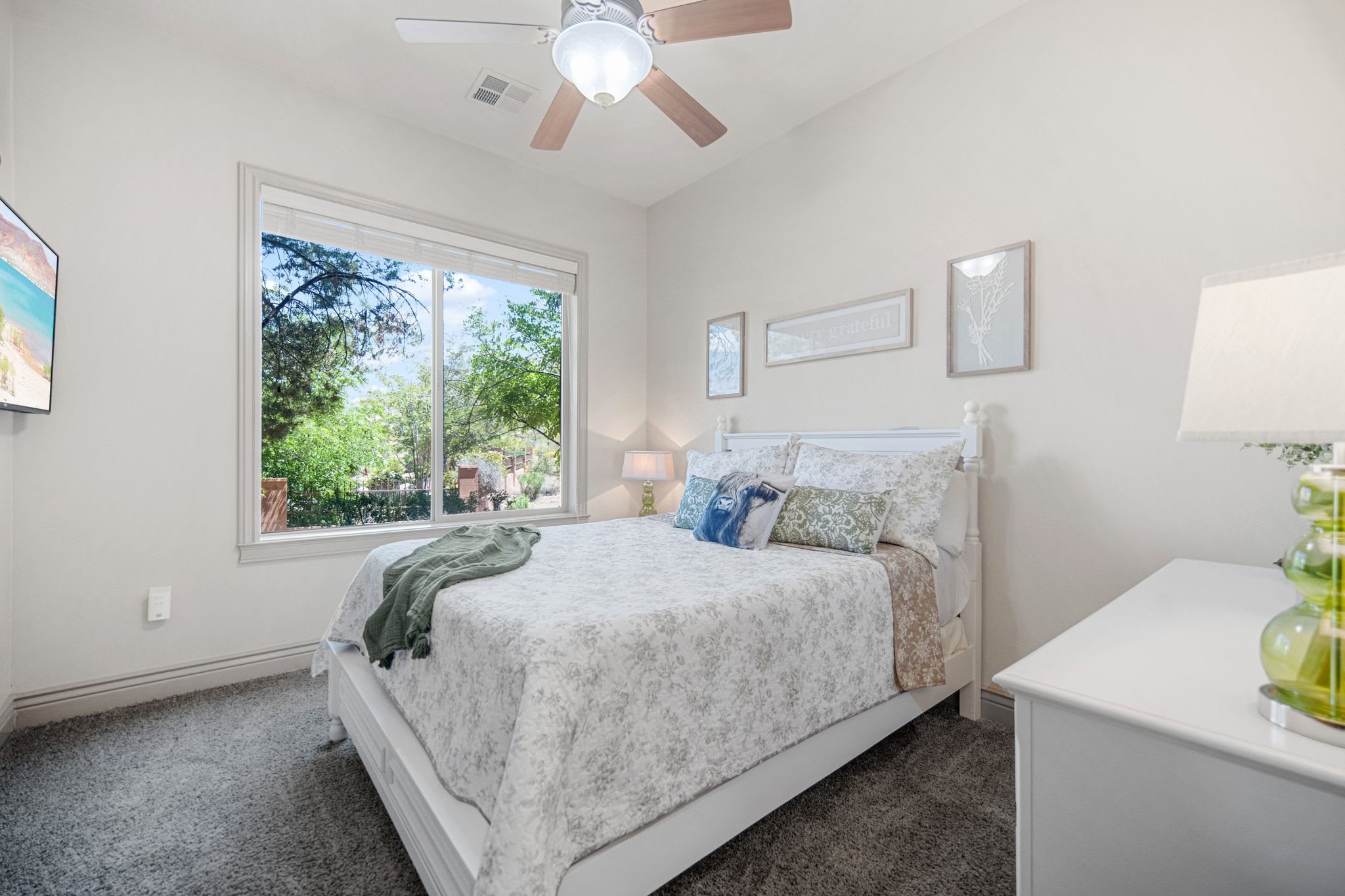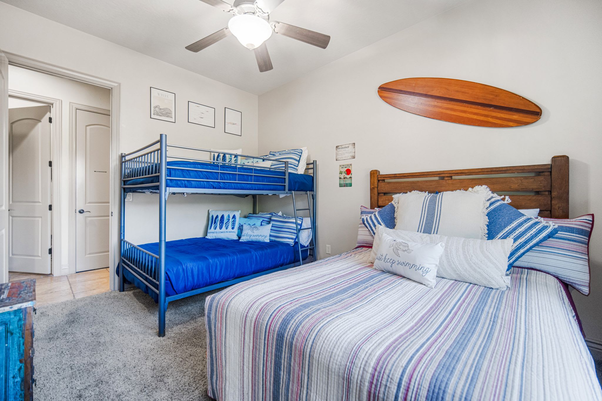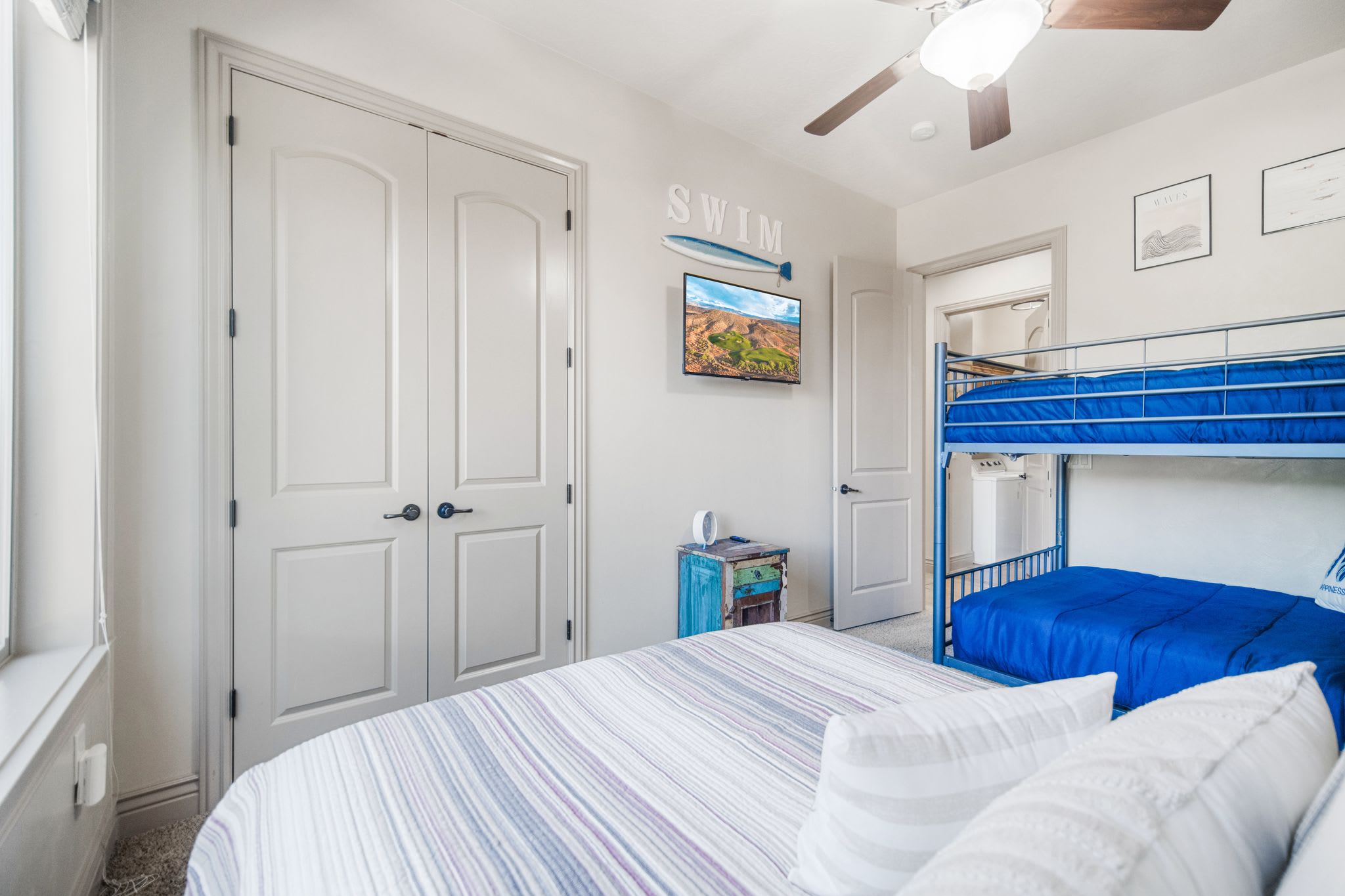 Bedroom #3 includes 1 set of full-sized bunk beds, one Queen bed, and a smart TV.