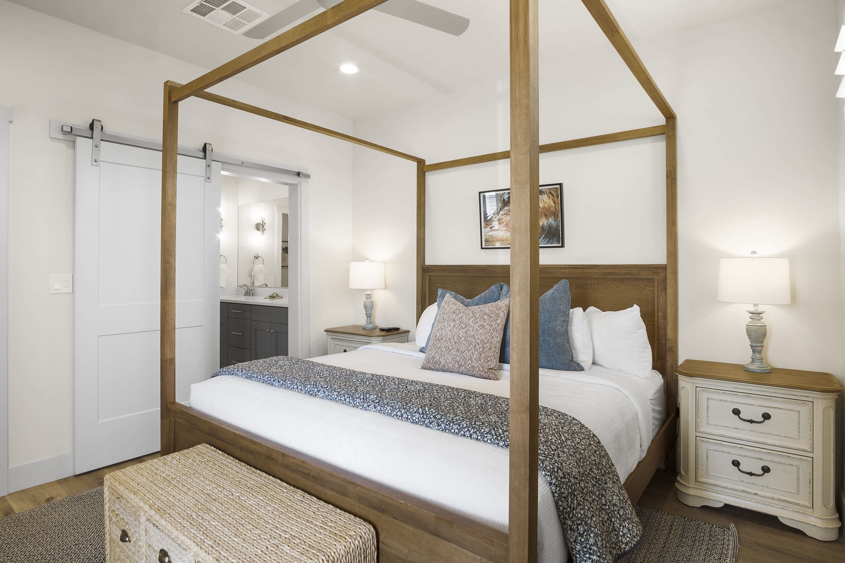 Bedroom #1 includes a king size bed, smart TV, patio access, and ensuite bathroom with a dual vanity and walk-in shower.
