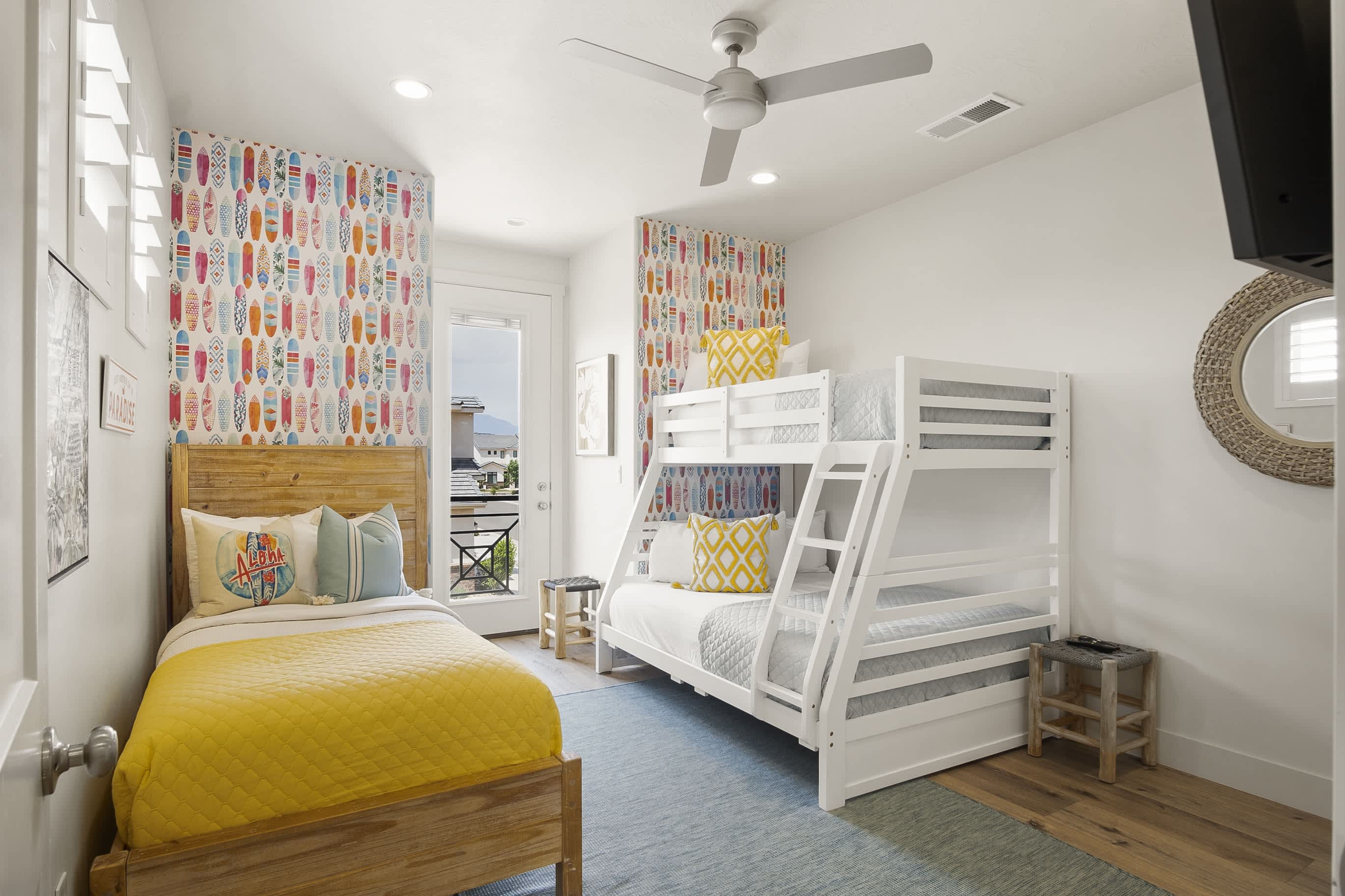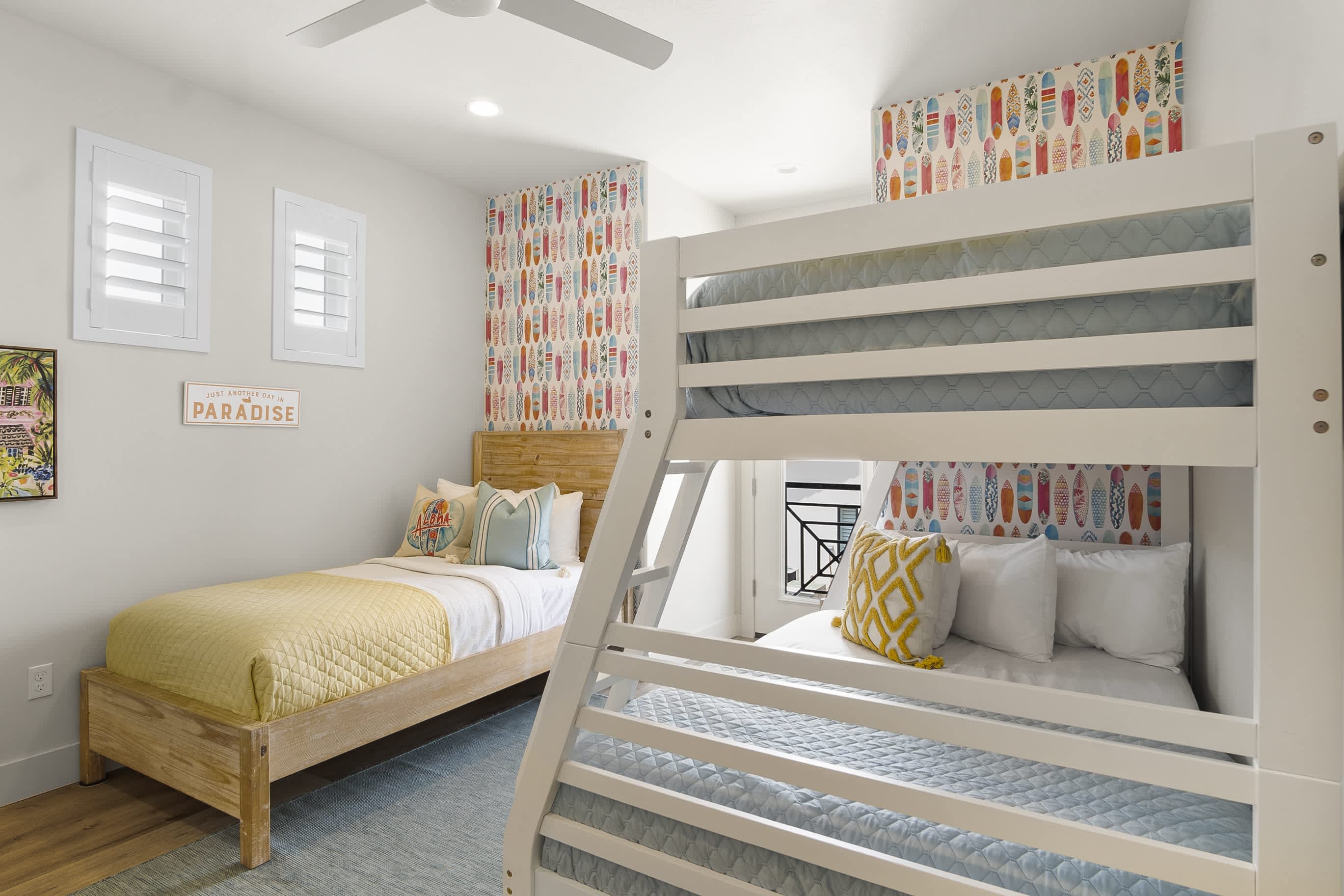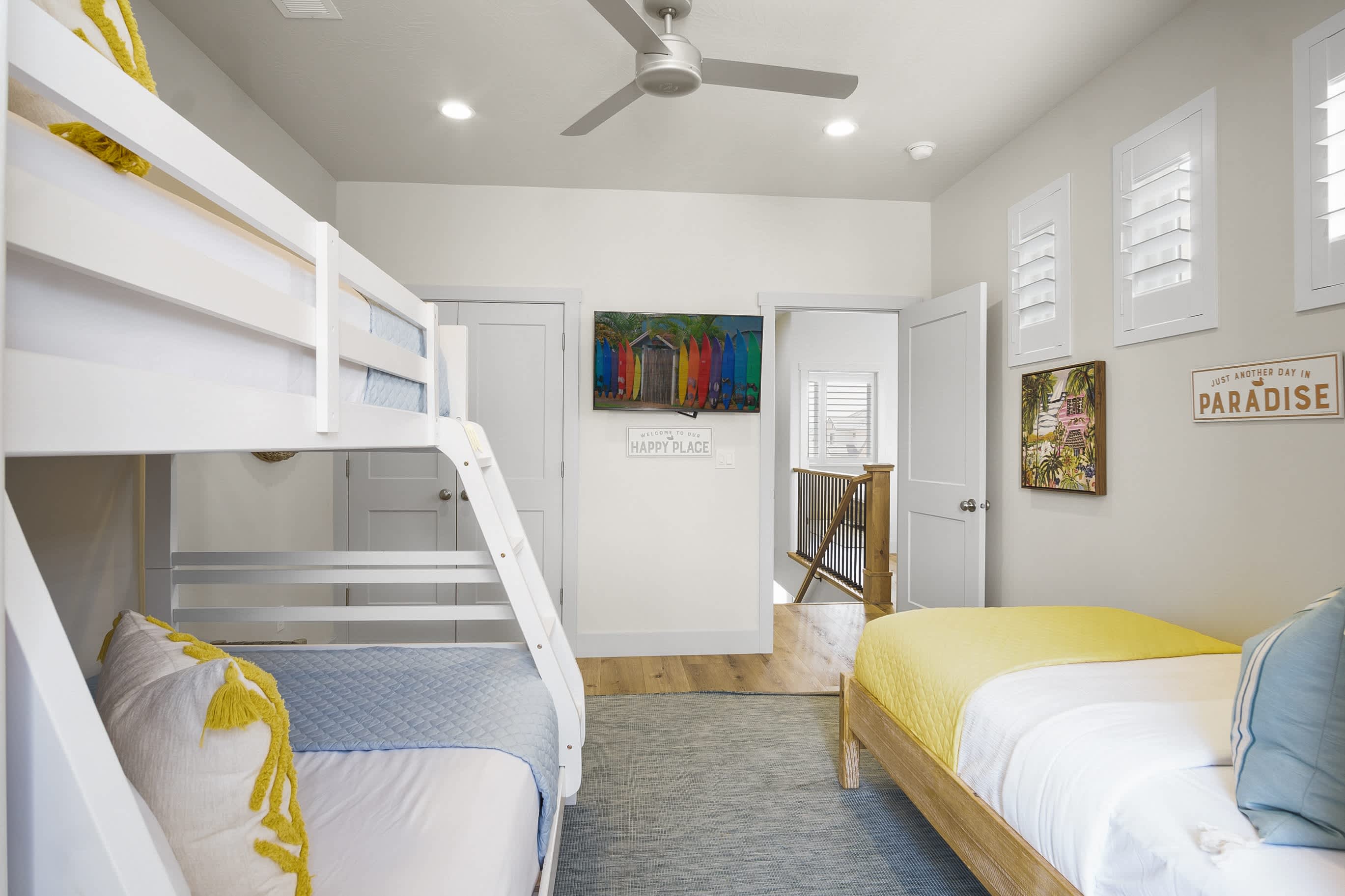 Bedroom #2 includes 1 twin and 1 full size bed in bunk format, as well as 1 standalone twin bed. The room also comes equipped with a smart TV.