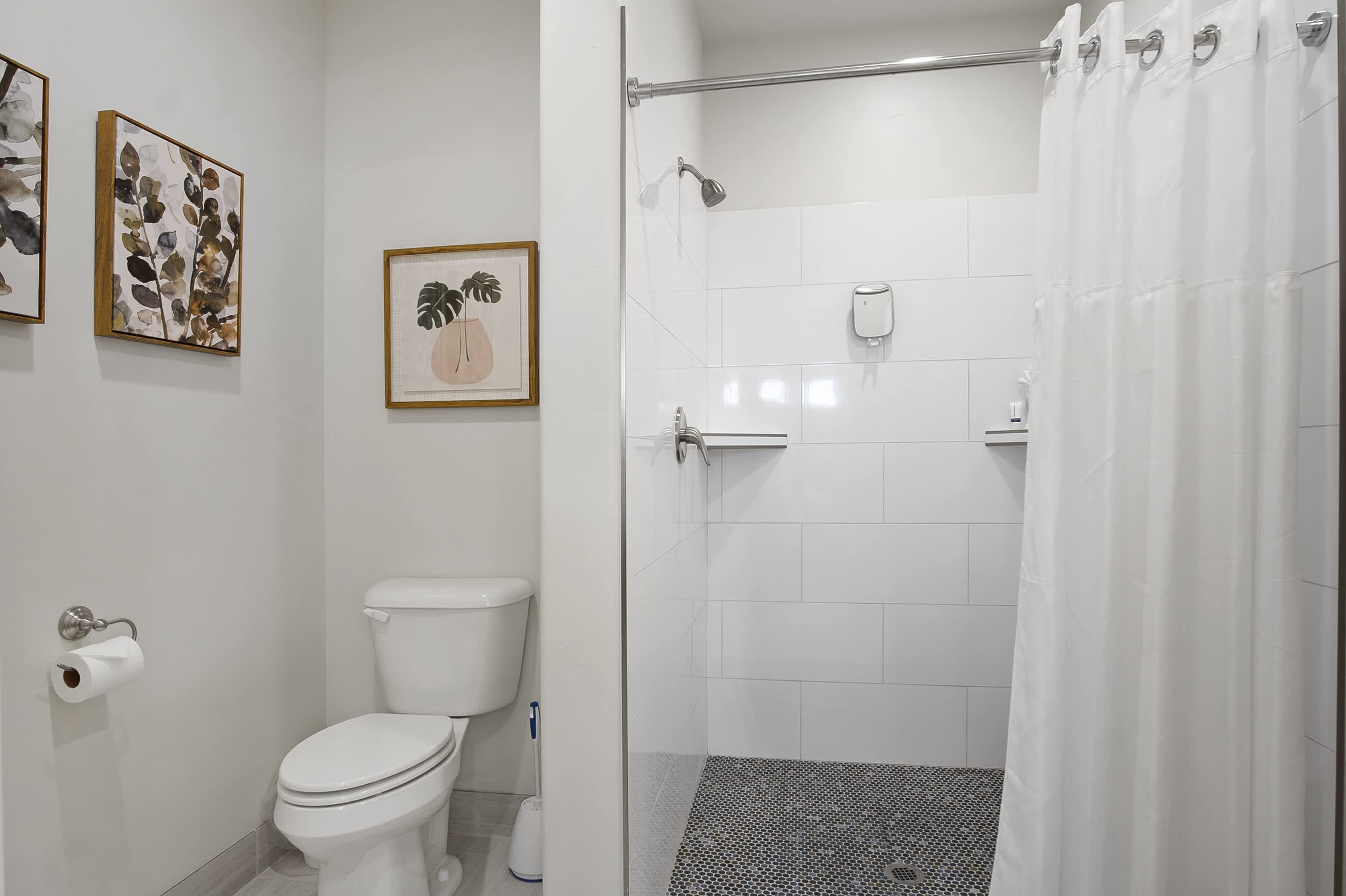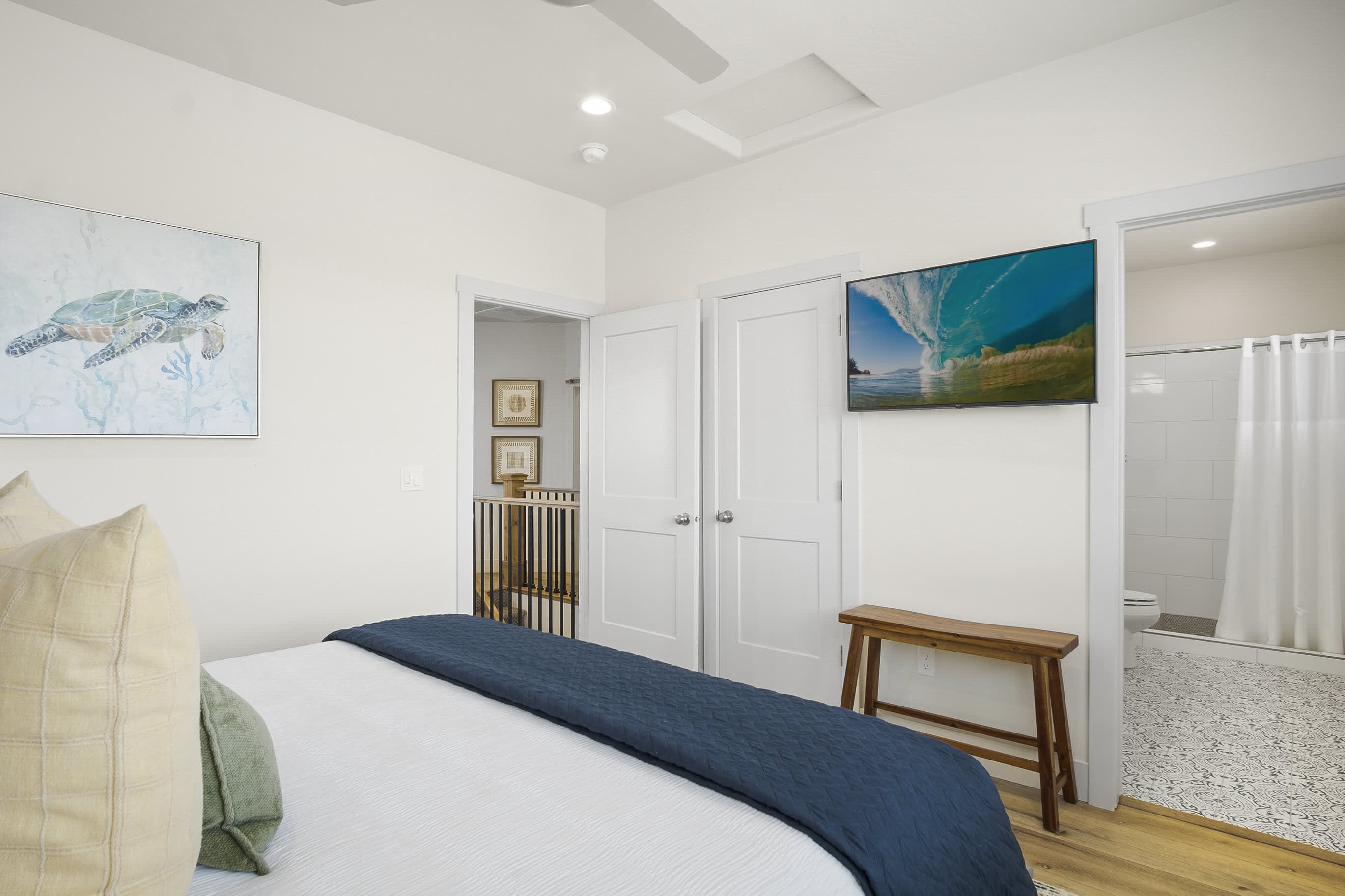 Bedroom #3 includes a king size bed, smart TV, and ensuite bathroom with a single vanity and walk-in shower.