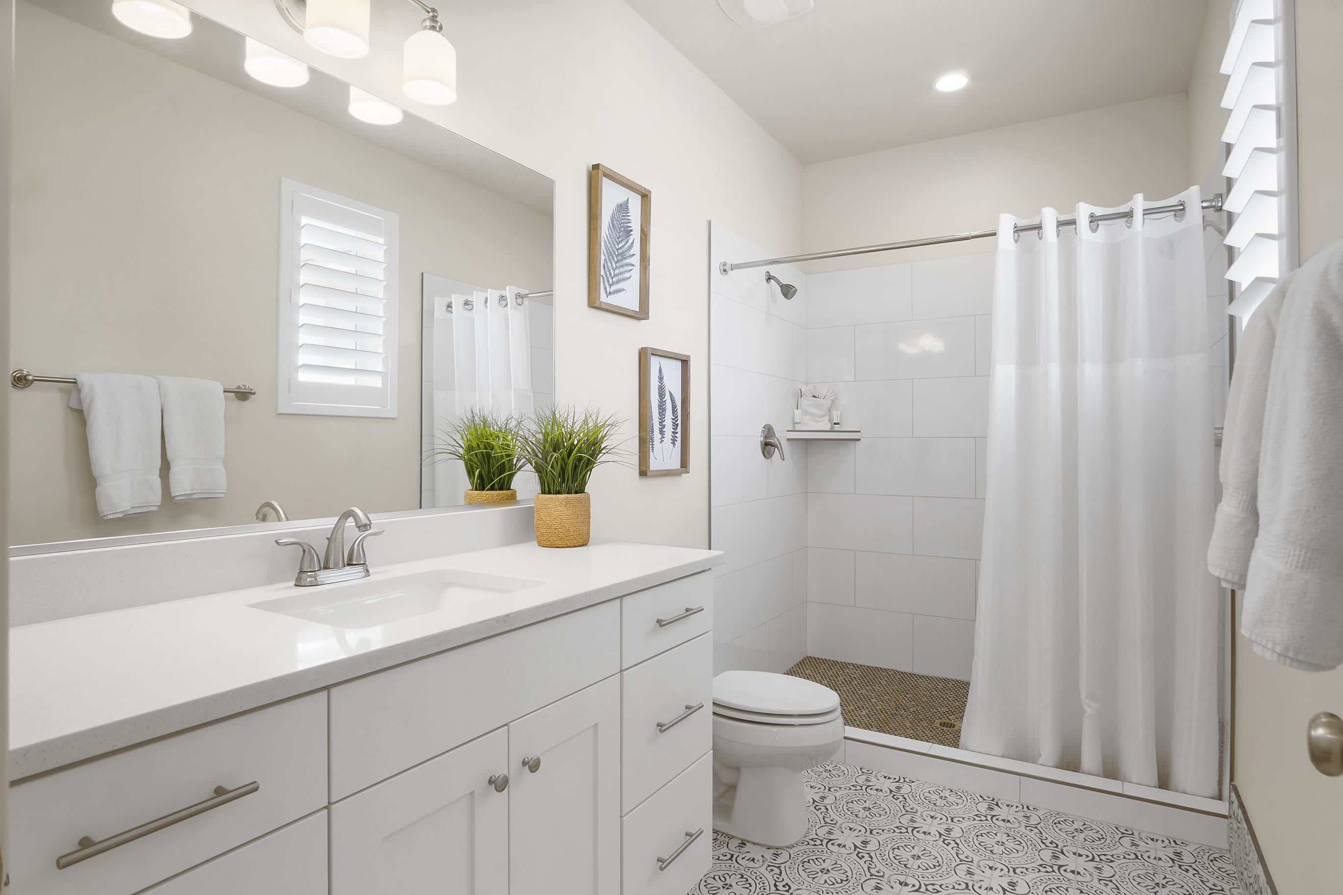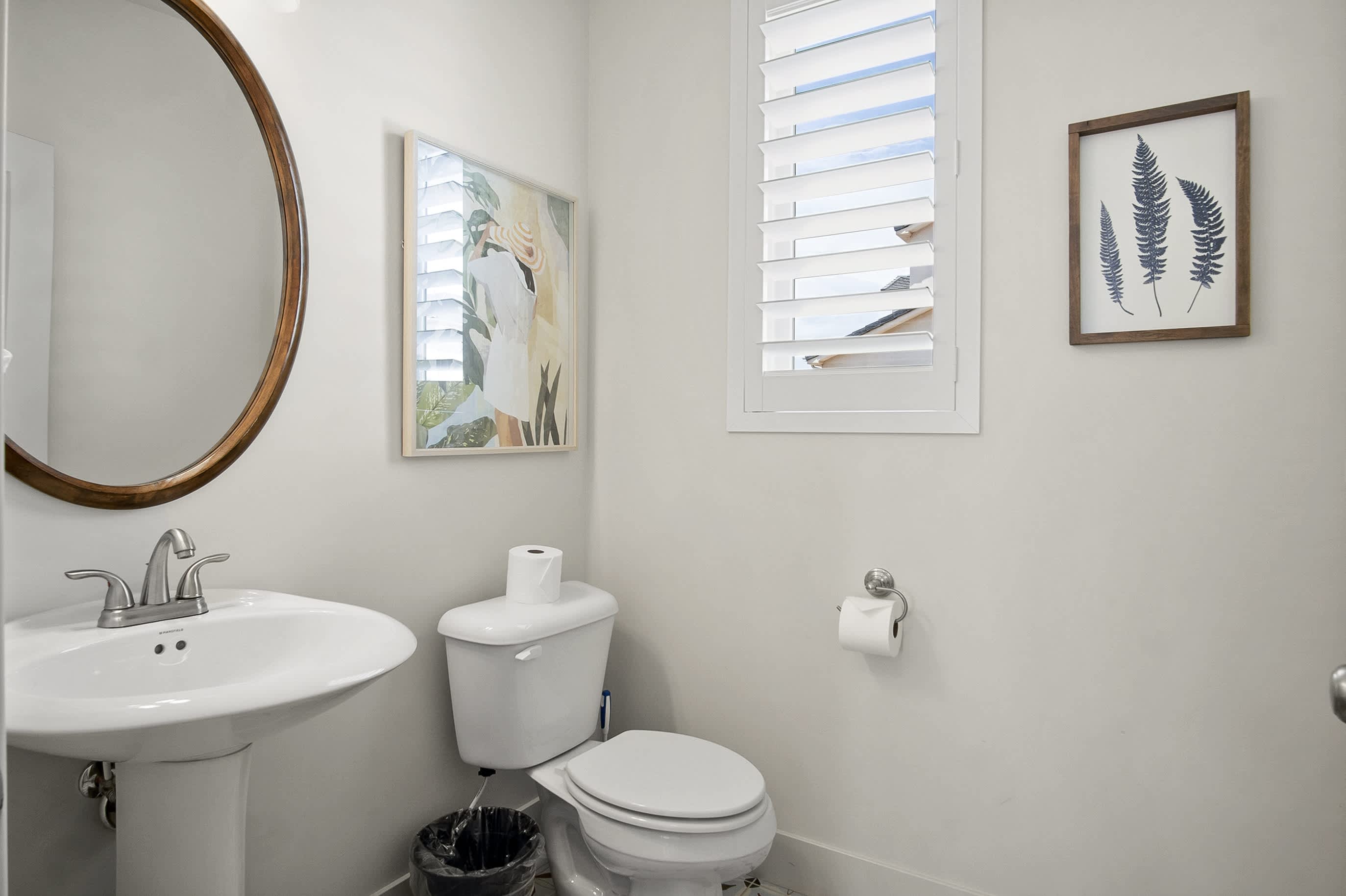 The home also includes 2 additional bathrooms – 1 full bathroom with a single vanity and shower/tub combo (upstairs), and a half bathroom (downstairs).