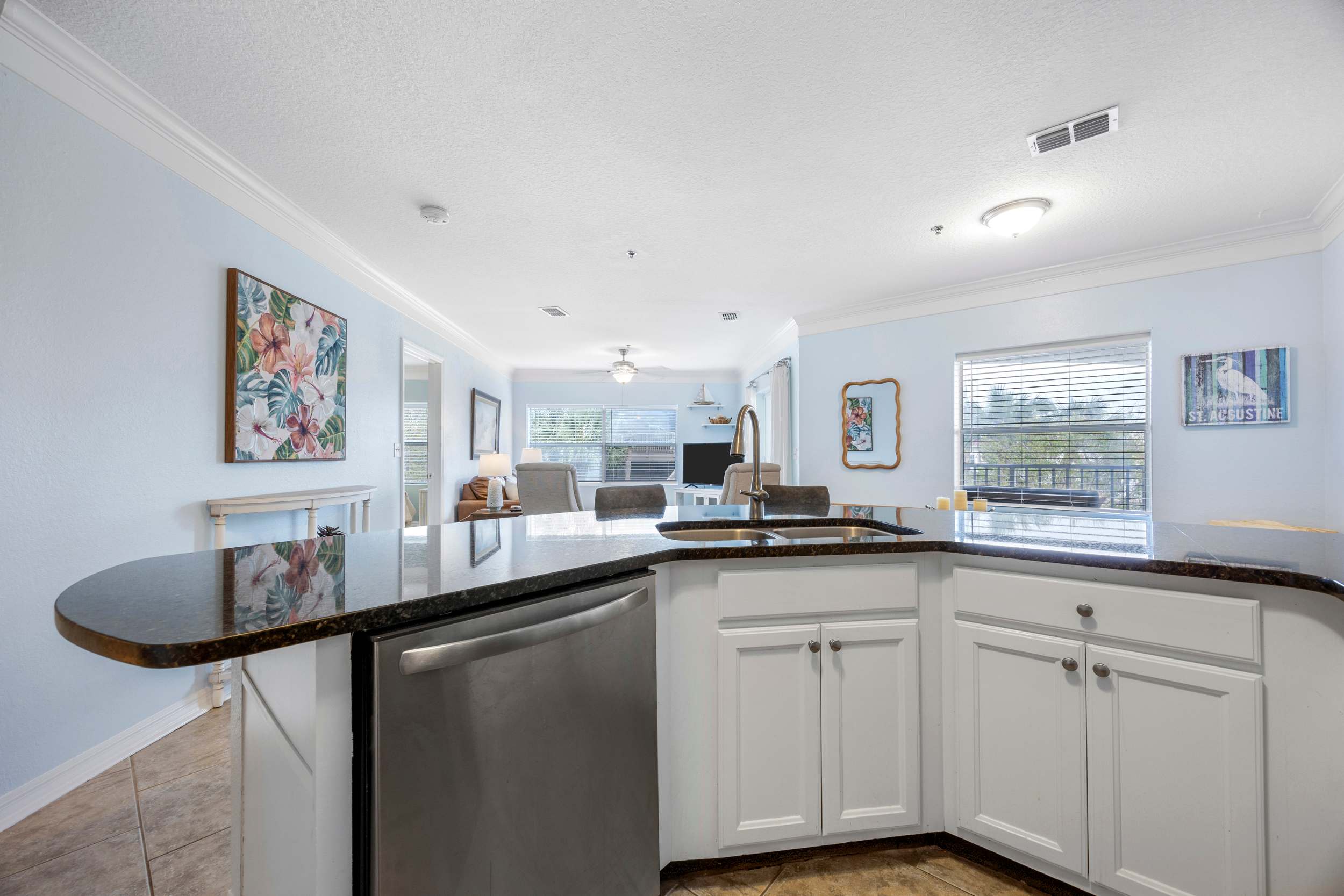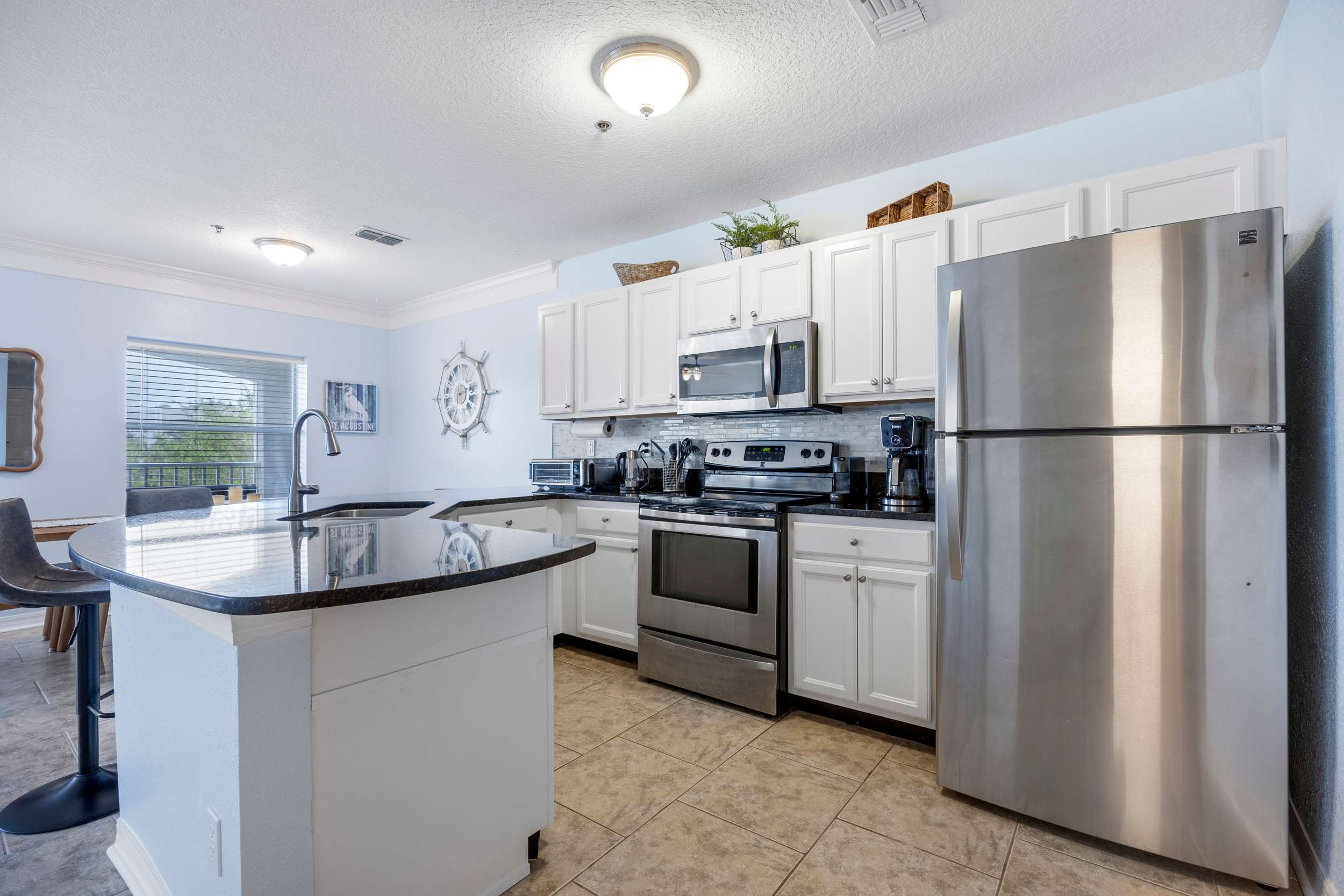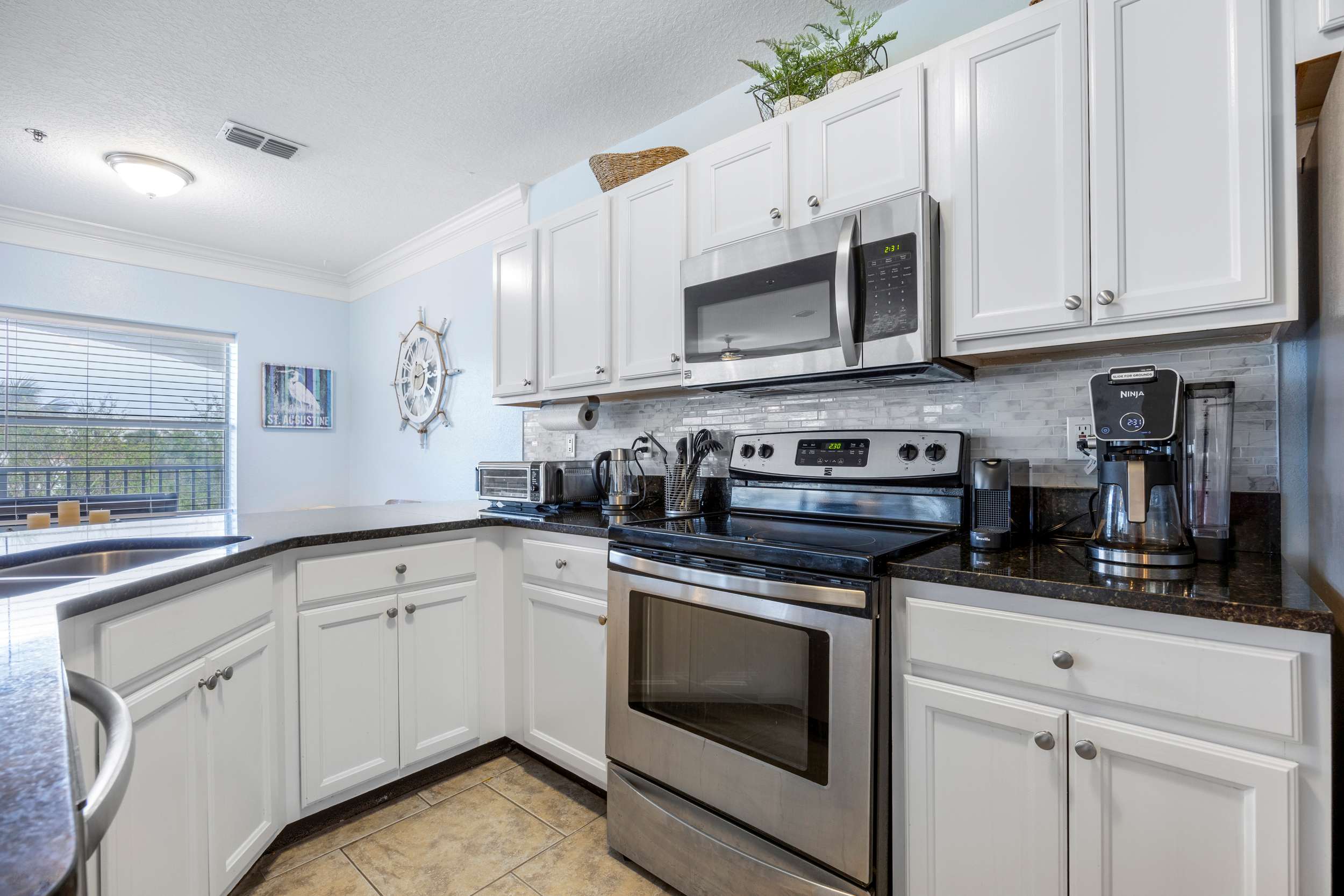Back indoors, the spacious kitchen is fit for a crowd, featuring stainless steel appliances, glossy stone counters, and crisp white cabinetry stocked with all the comforts of home. Snag a high-top stool at the counter for casual bites or gather around the dining table, seating 6 for more formal fare.