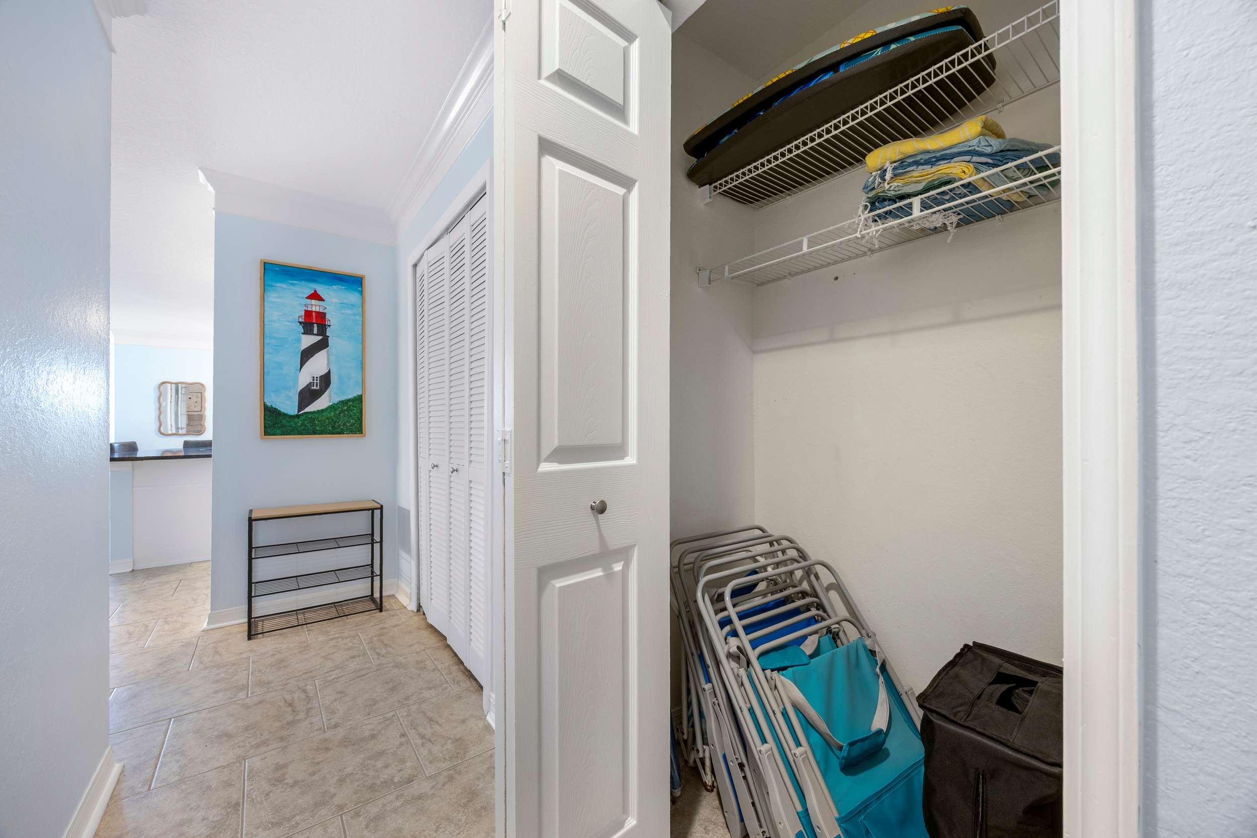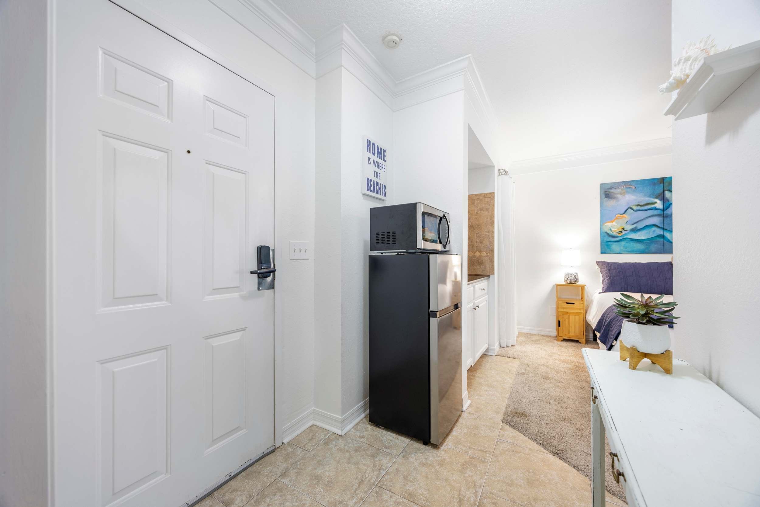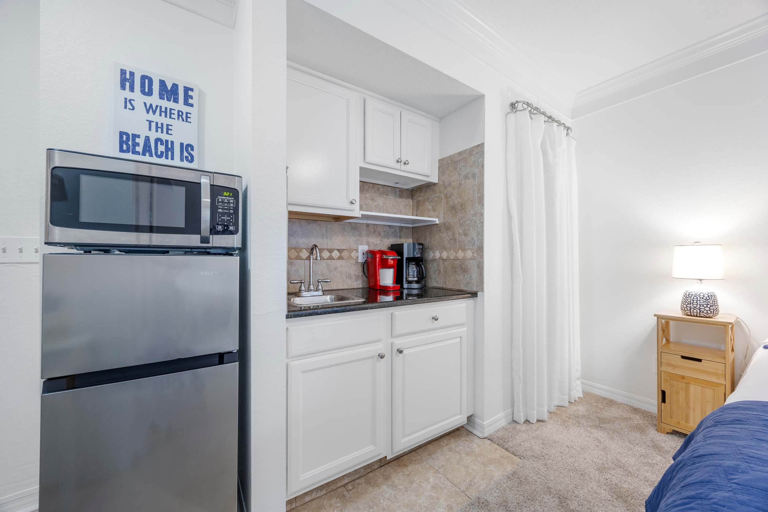 Back indoors, the spacious kitchen is fit for a crowd, featuring stainless steel appliances, glossy stone counters, and crisp white cabinetry stocked with all the comforts of home. Snag a high-top stool at the counter for casual bites or gather around the dining table, seating 6 for more formal fare.