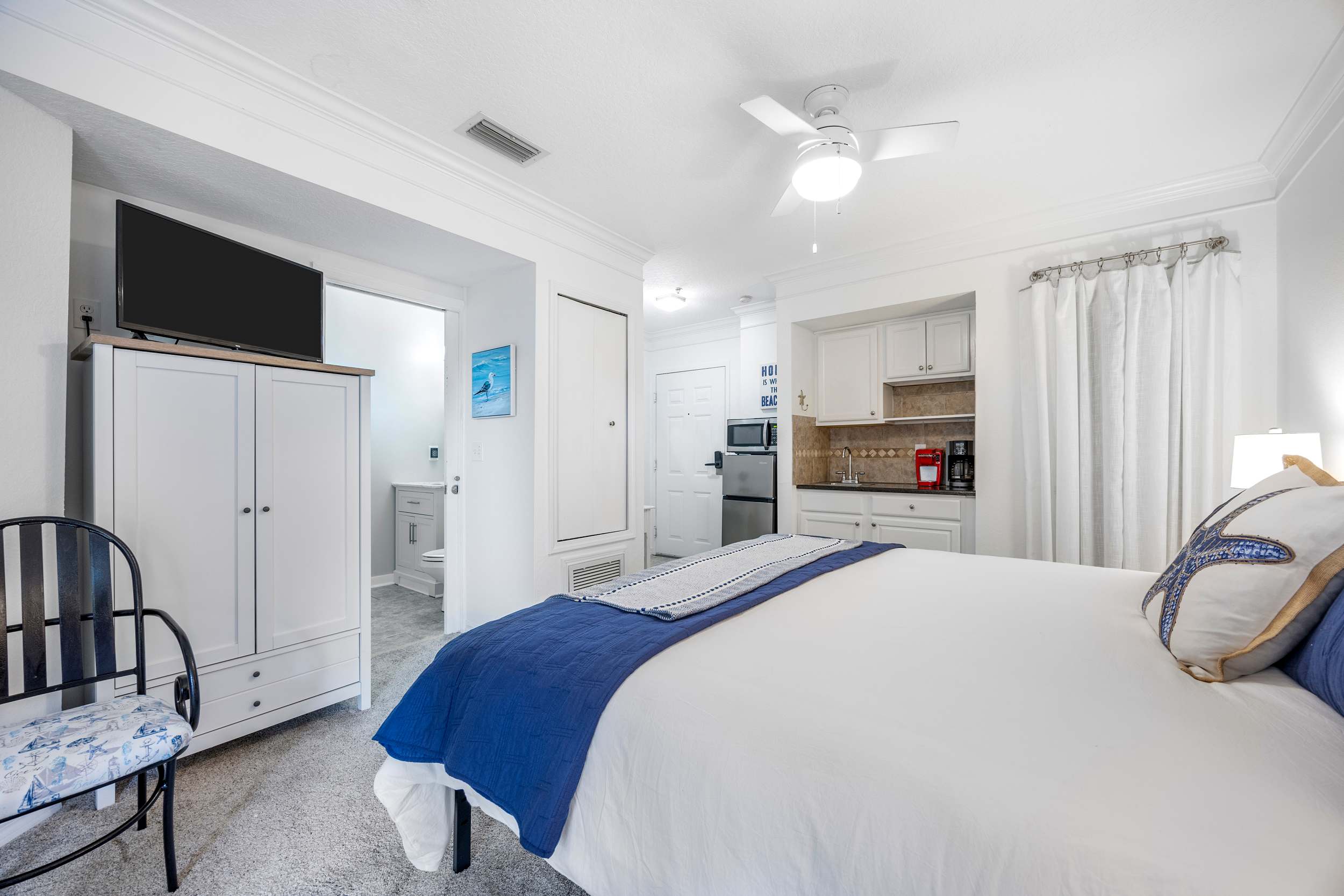 The studio includes a king size bed, smart TV, private balcony, private entrance, kitchenette, and ensuite bathroom with a single vanity and shower/tub combo.