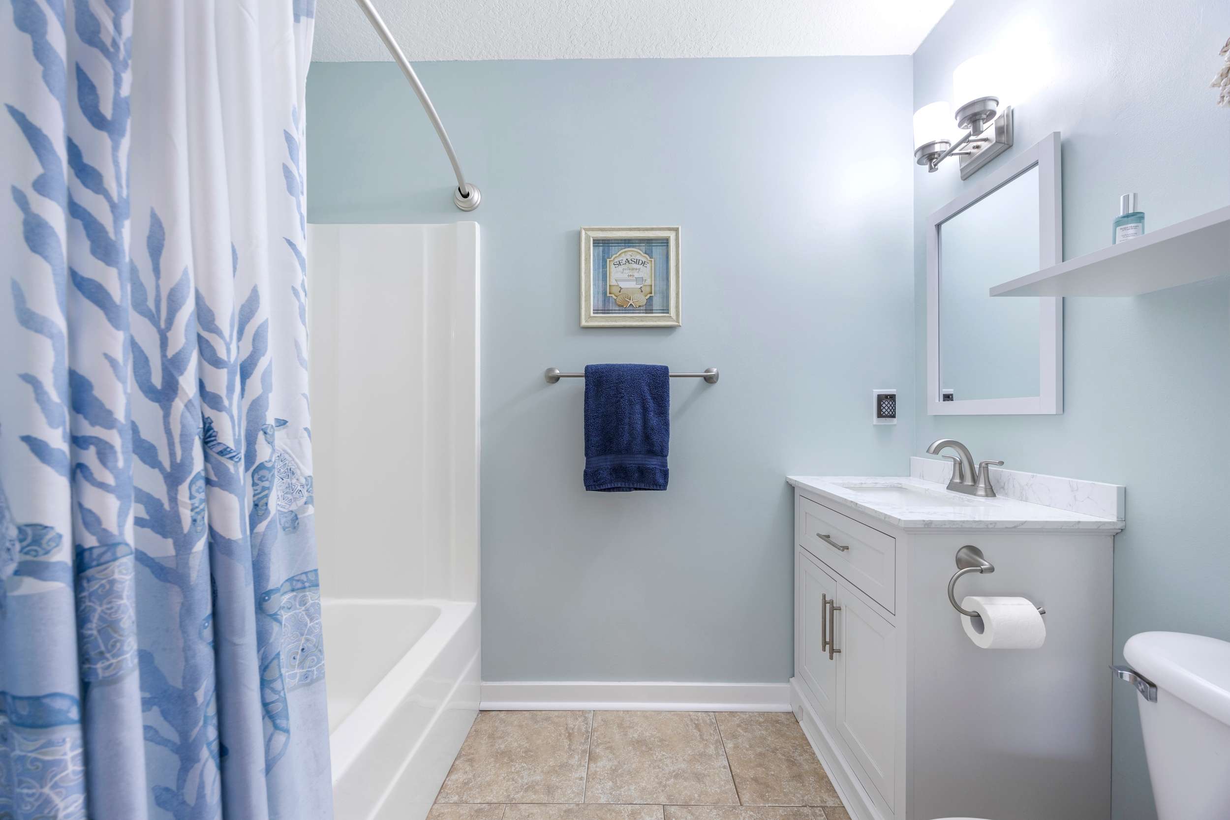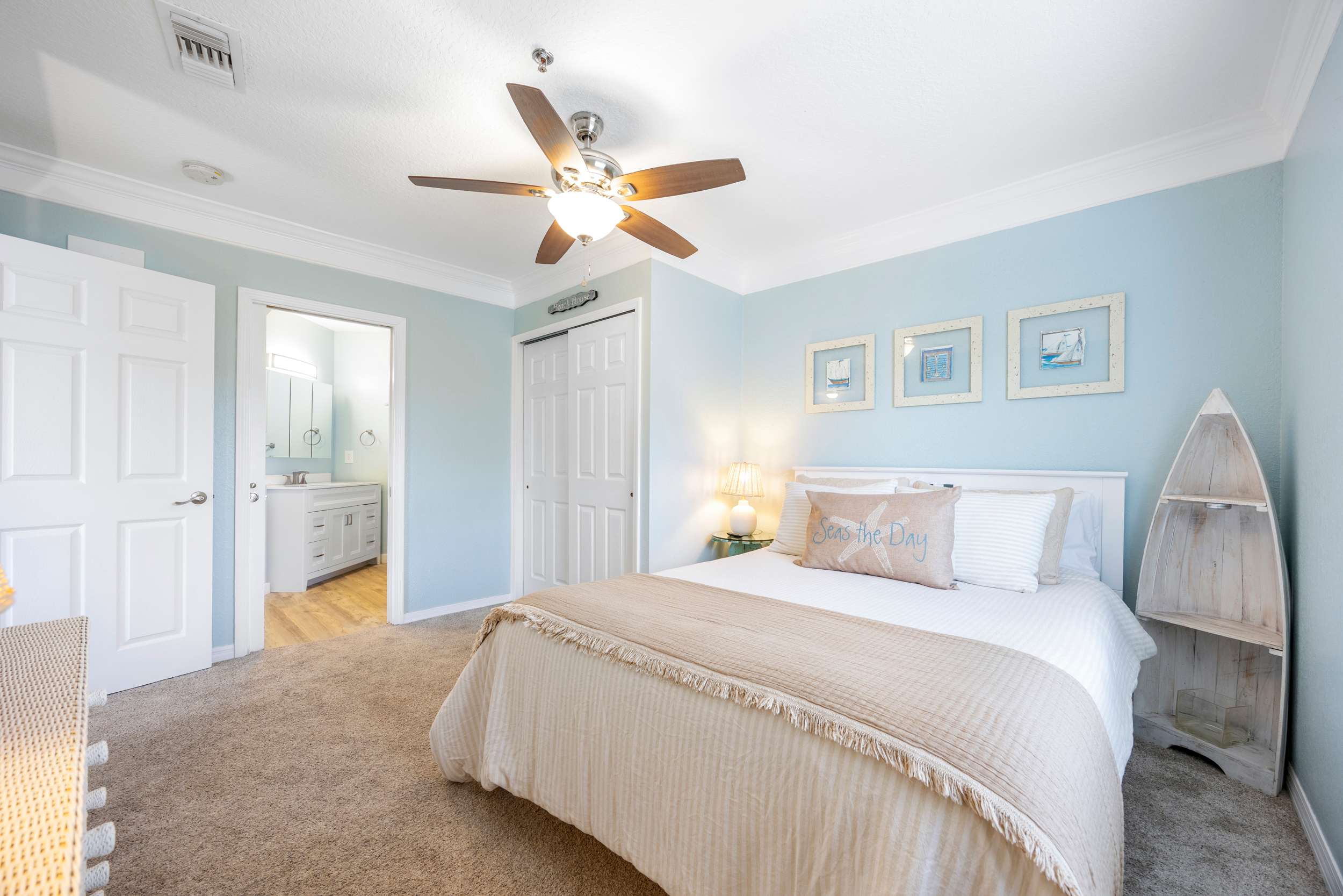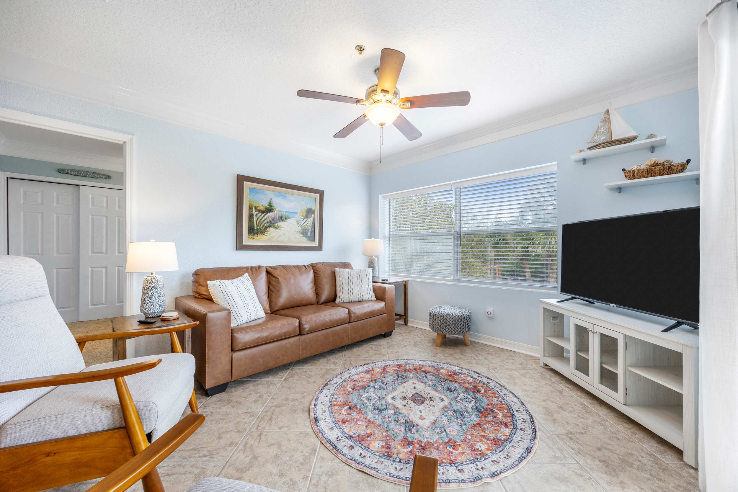 The home’s charming interior keeps the soothing ocean vibes top of mind, expertly curated with comfortable furnishings alongside beach-chic décor. Sink into the plush leather sofa or cushy armchairs while you stream all your favorite entertainment on the smart TV. Step out onto the breezy balcony to enjoy your morning coffee, the outdoor sofa seating providing a quiet spot for soaking in the fresh air and turning the pages of a good book.