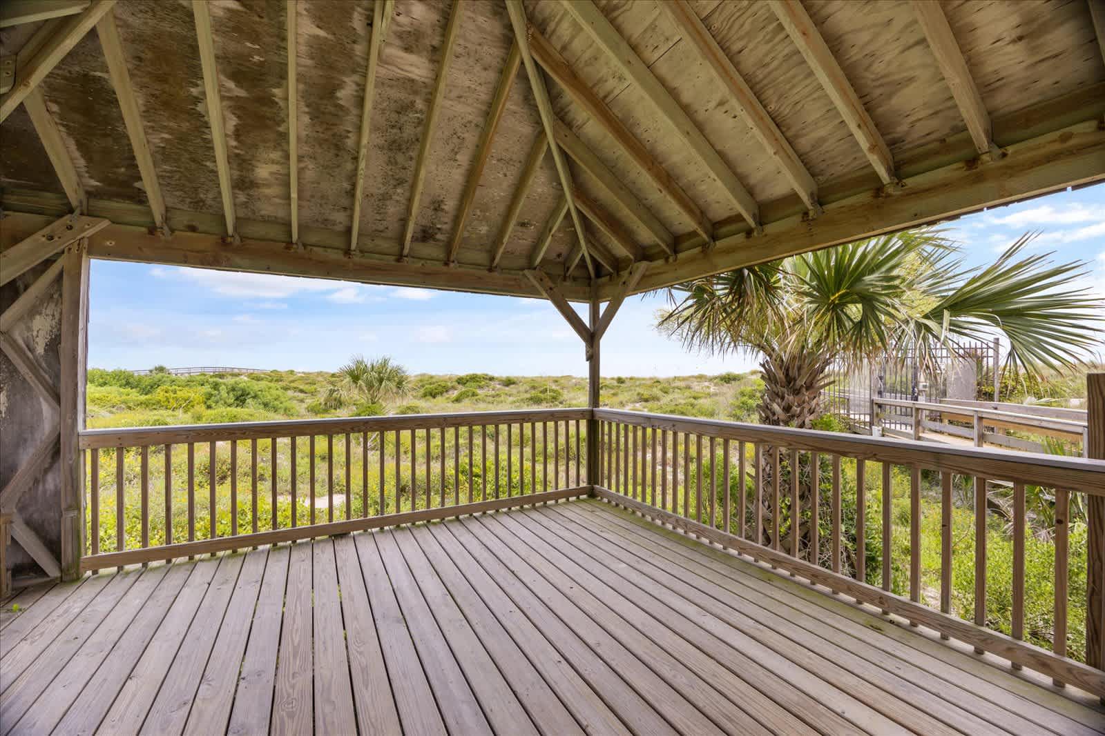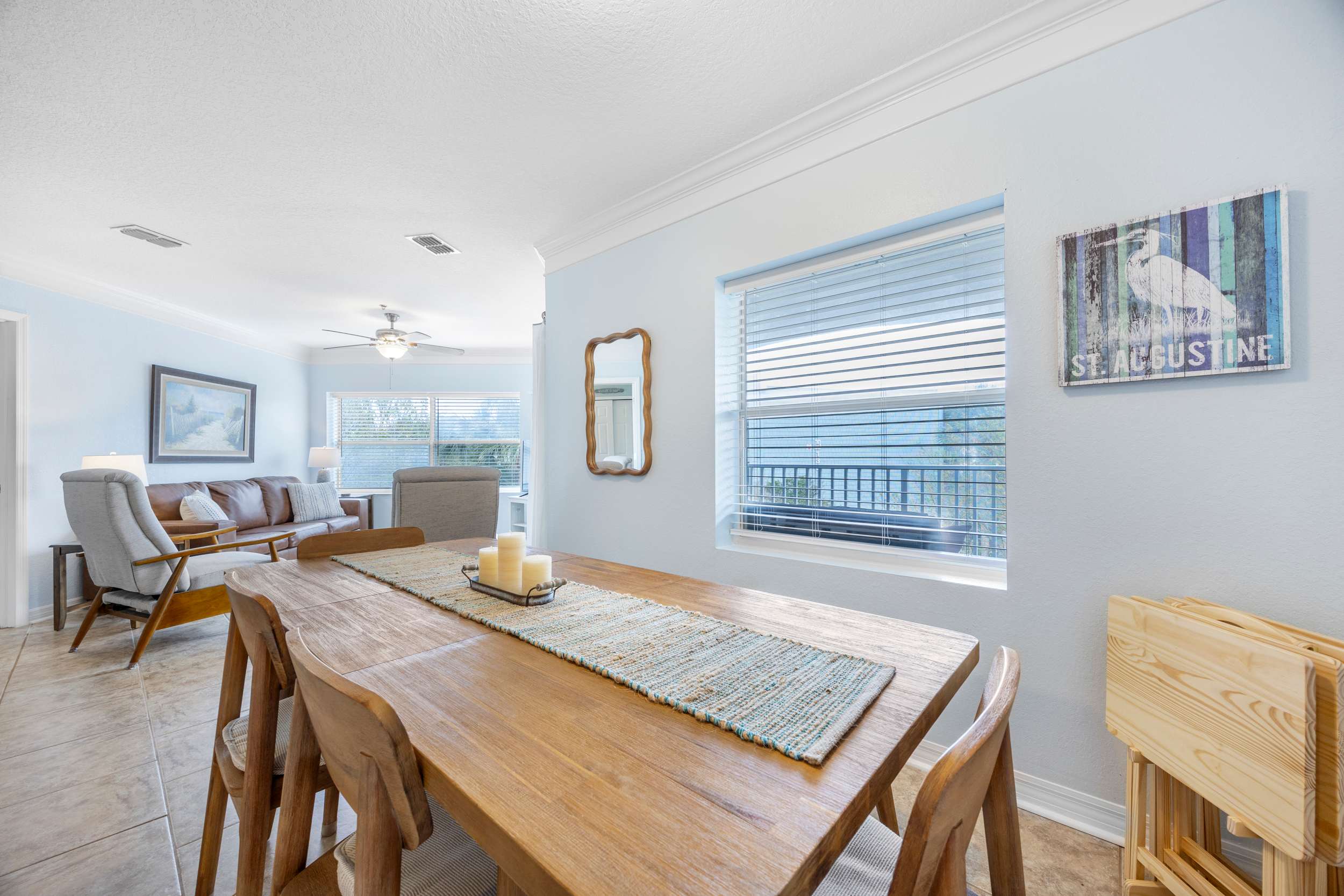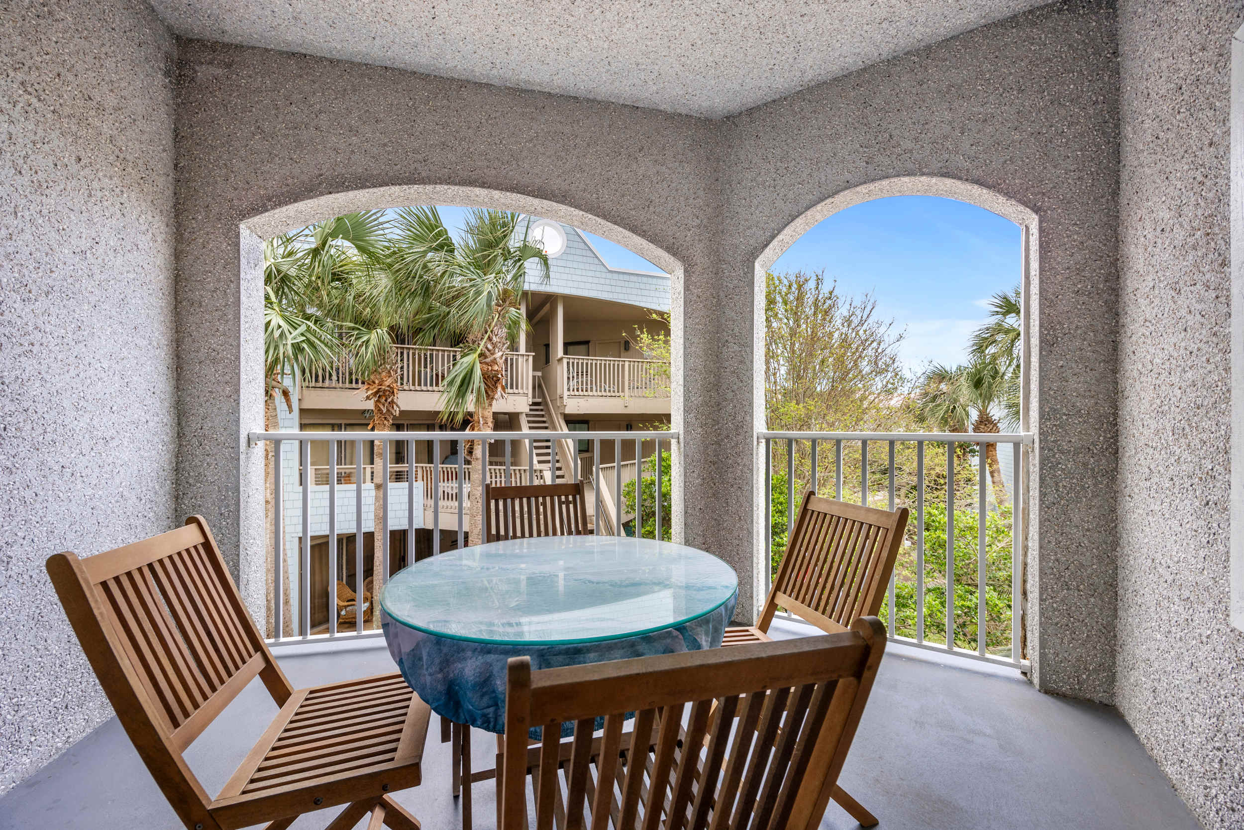 The home’s charming interior keeps the soothing ocean vibes top of mind, expertly curated with comfortable furnishings alongside beach-chic décor. Sink into the plush leather sofa or cushy armchairs while you stream all your favorite entertainment on the smart TV. Step out onto the breezy balcony to enjoy your morning coffee, the outdoor sofa seating providing a quiet spot for soaking in the fresh air and turning the pages of a good book.
