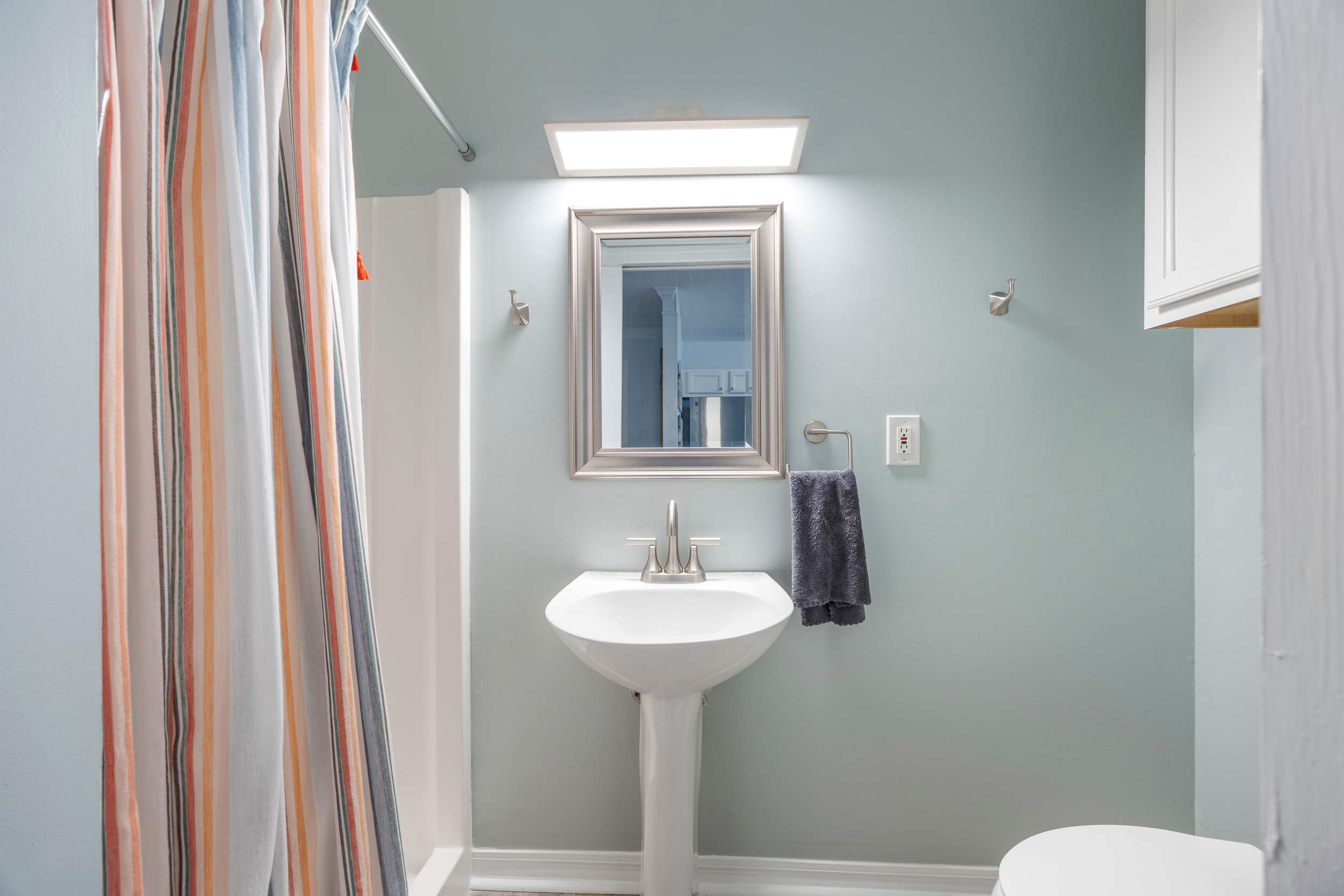 The home also includes an additional full guest bathroom with a pedestal sink and walk-in shower.