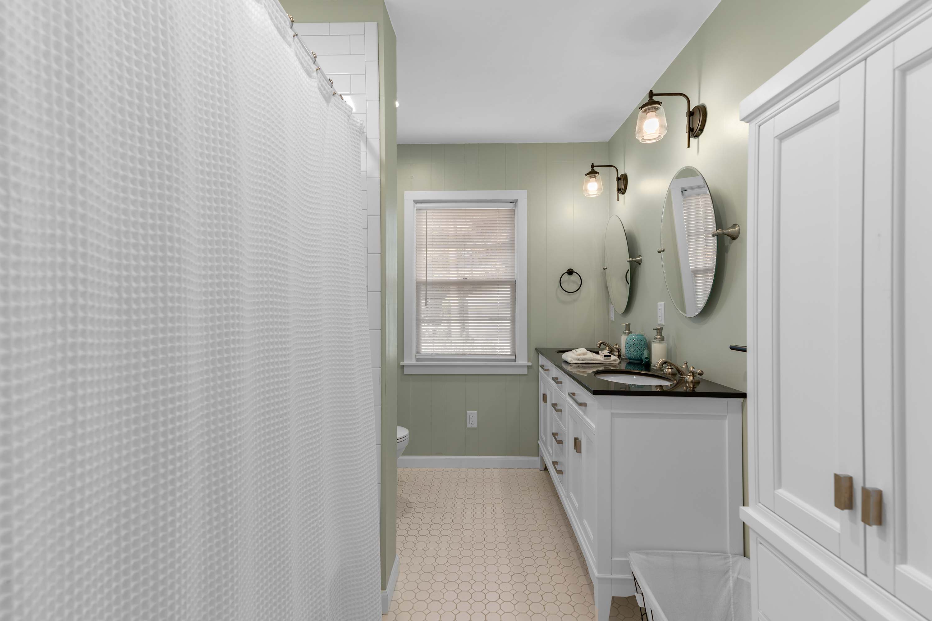 The home’s full guest bathroom includes a dual vanity and shower/tub combo.